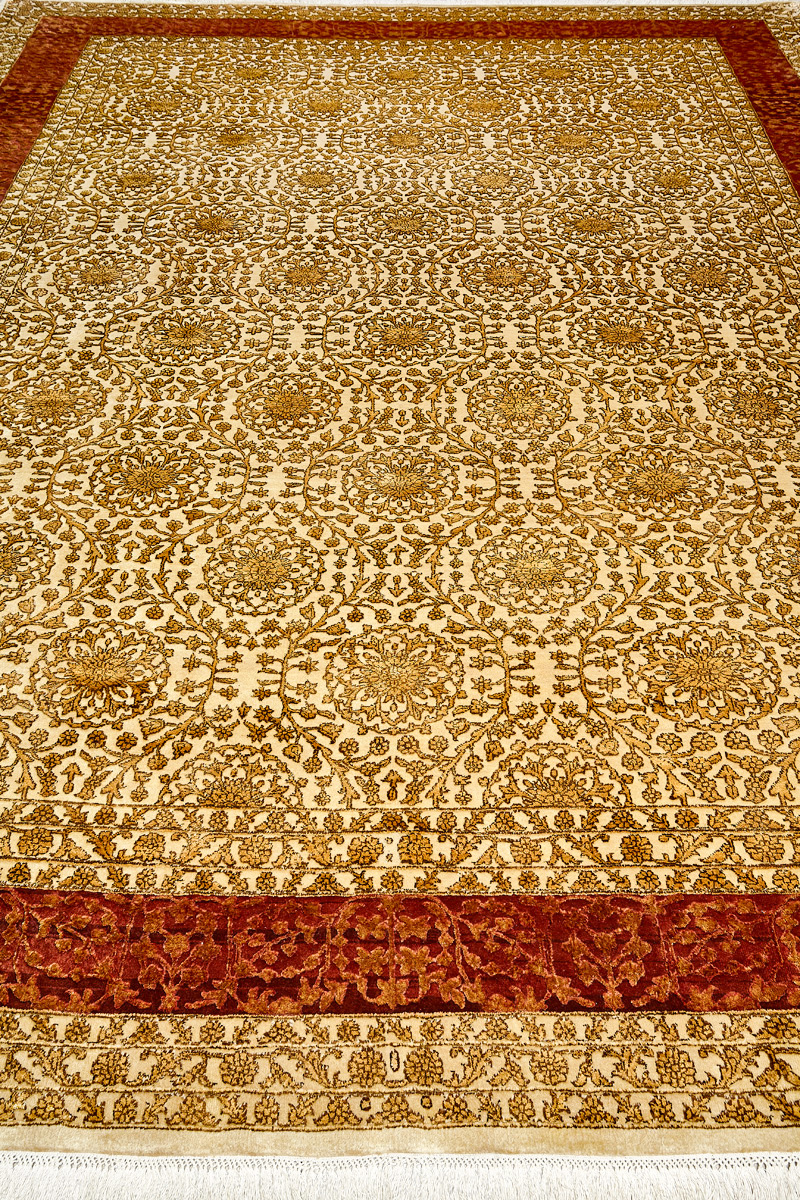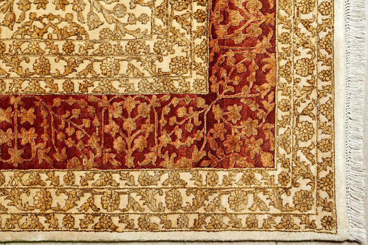 Более пяти веков назад в городе Агра зародилась знаменитая индийская школа ковроткачества, прославившаяся не меньше, чем расположенный здесь же Тадж-Махал. Мощное персидское влияние, помноженное на местный колорит, привело к появлению оригинальных орнаментов с богатыми растительными узорами — причудливым цветам, ветвям и листьям, разбросанным по всему полю ковра.