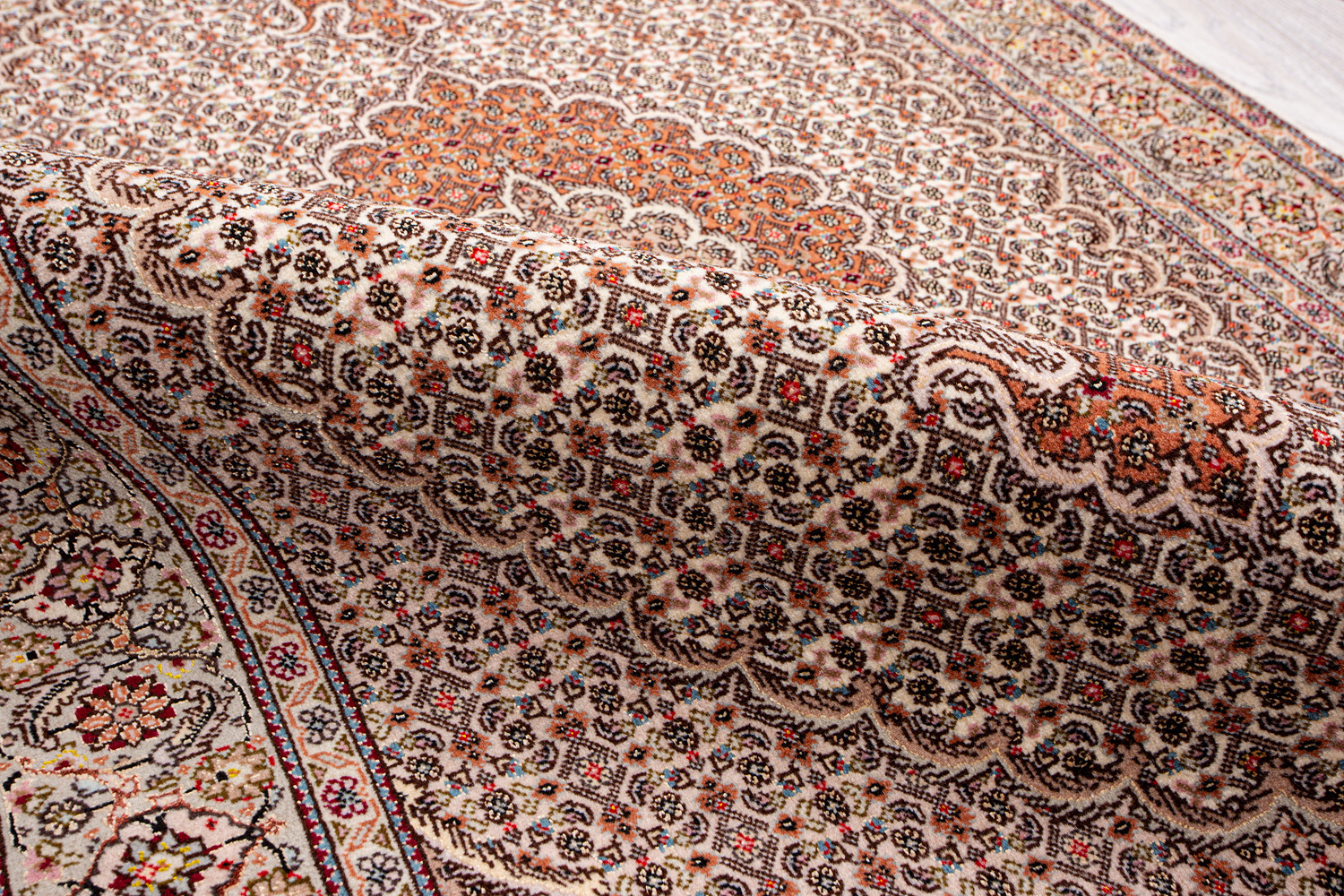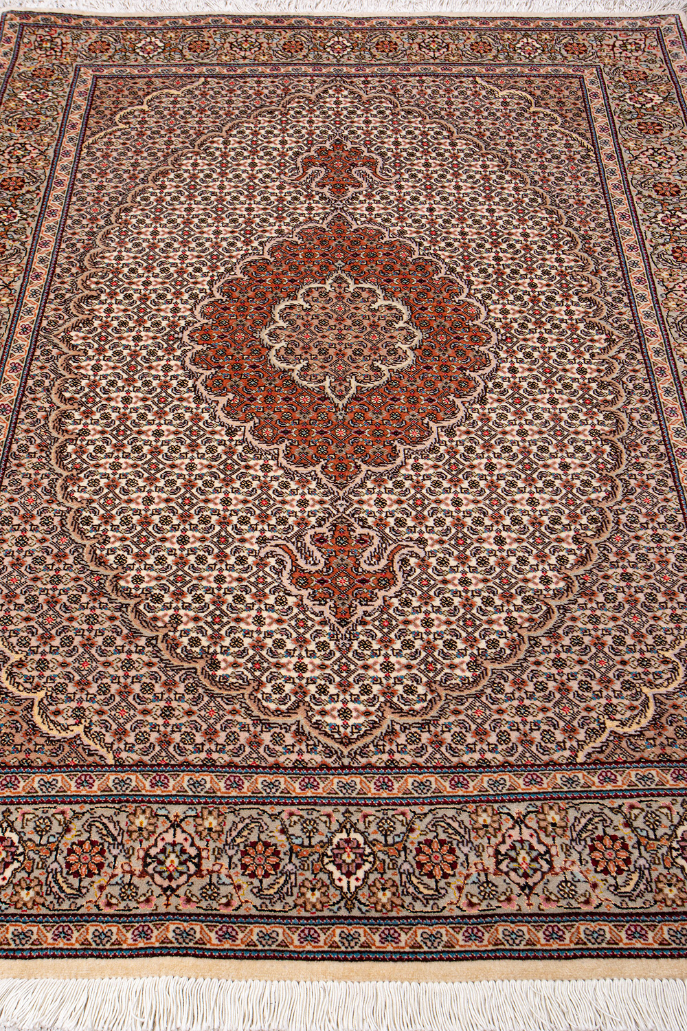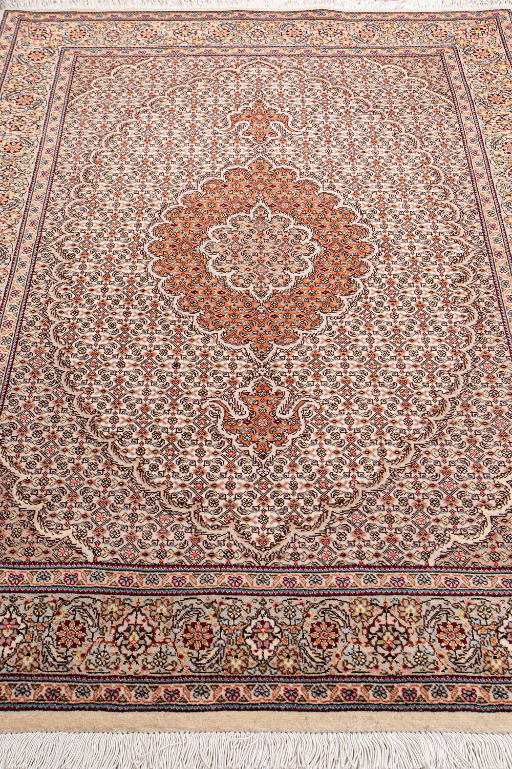 Рассыпанные по всему полю цветы, медальоны и «рыбная чешуя» — основные мотивы в дизайне ковров из коллекции Тебриз, а светлые тона и спокойные пастельные оттенки — основная цветовая палитра.