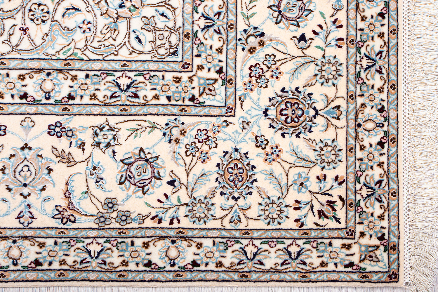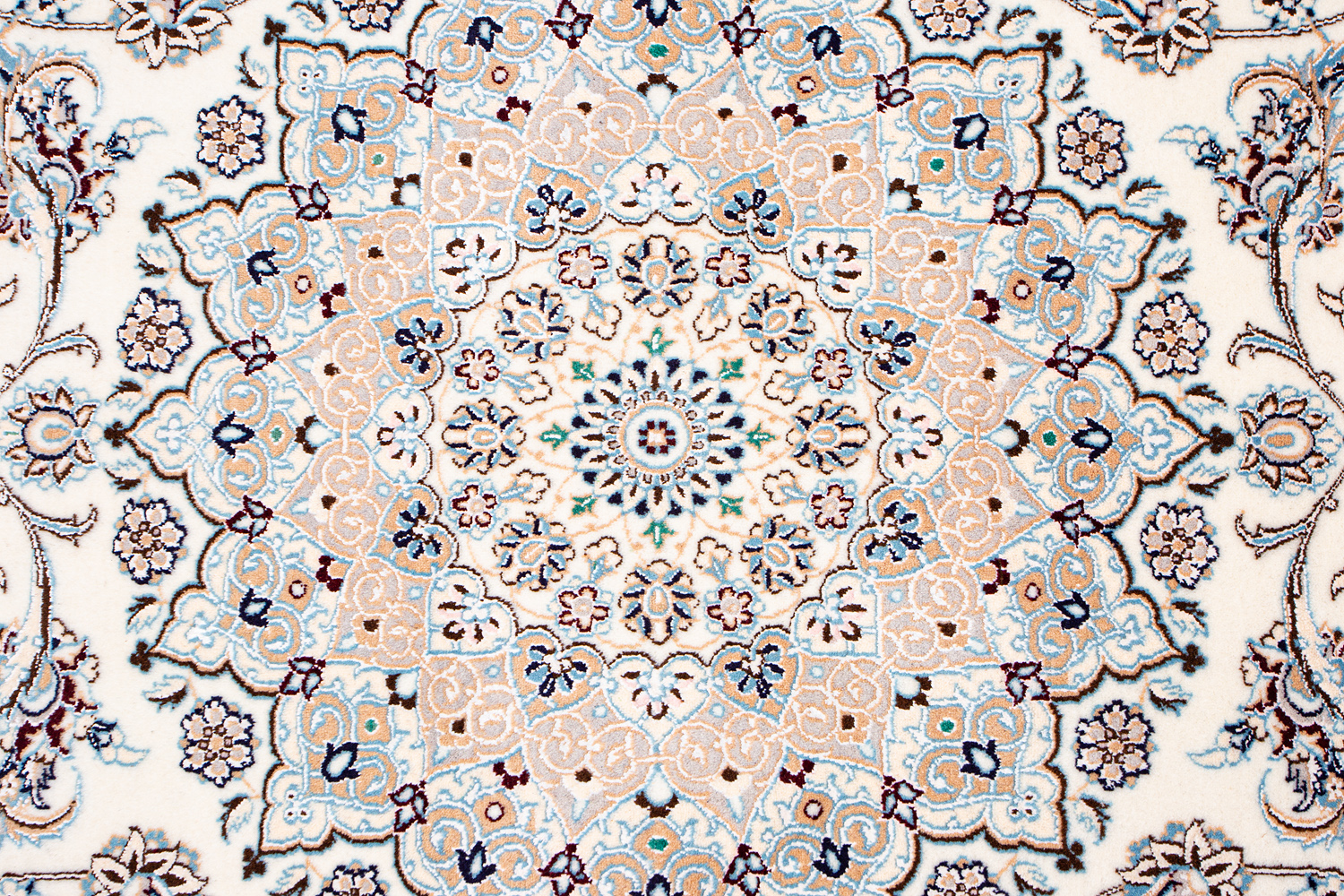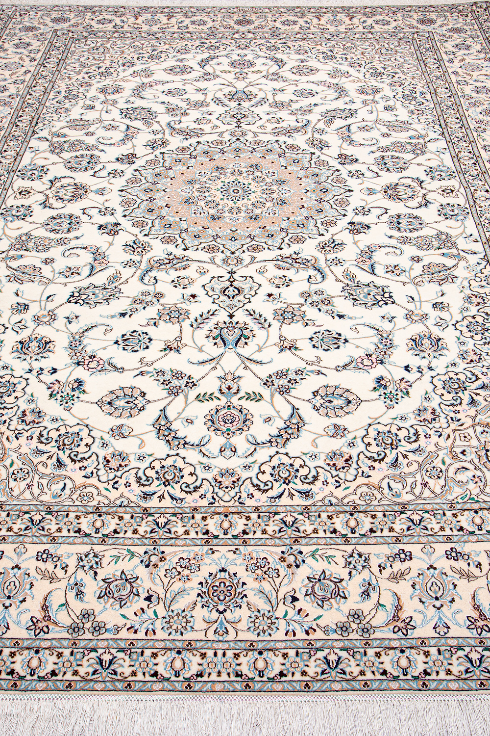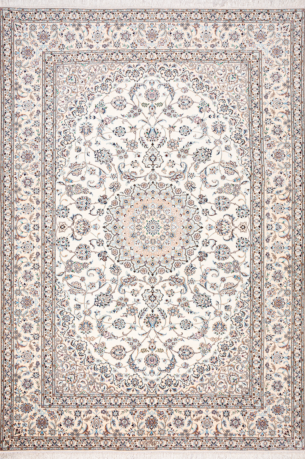 Иранский город Наин знаменит своими аристократичными коврами, которые совмещают в себе классические орнаменты с элегантной цветовой гаммой, выдержанной в бежево-голубых тонах с многочисленными нюансами.