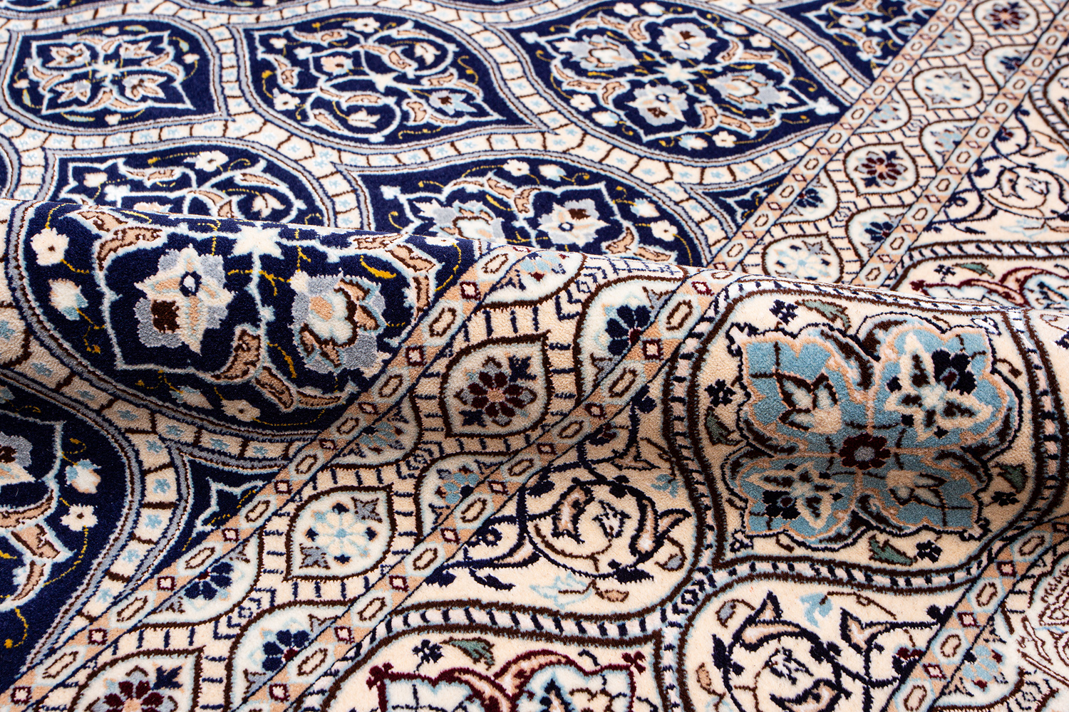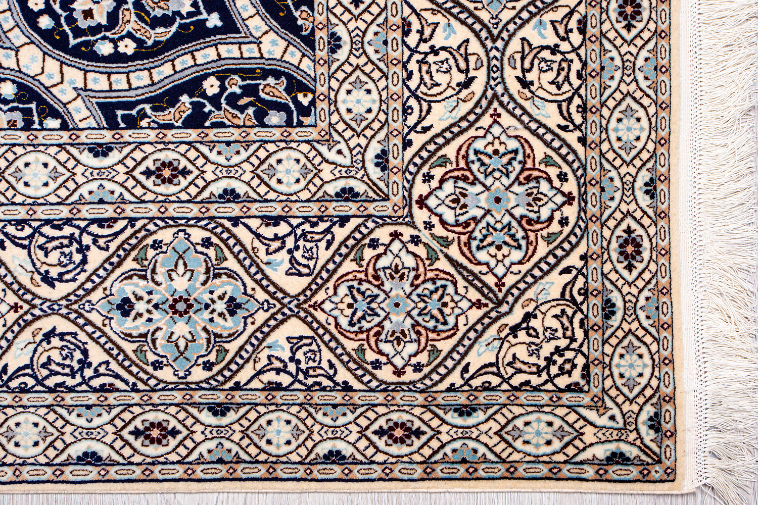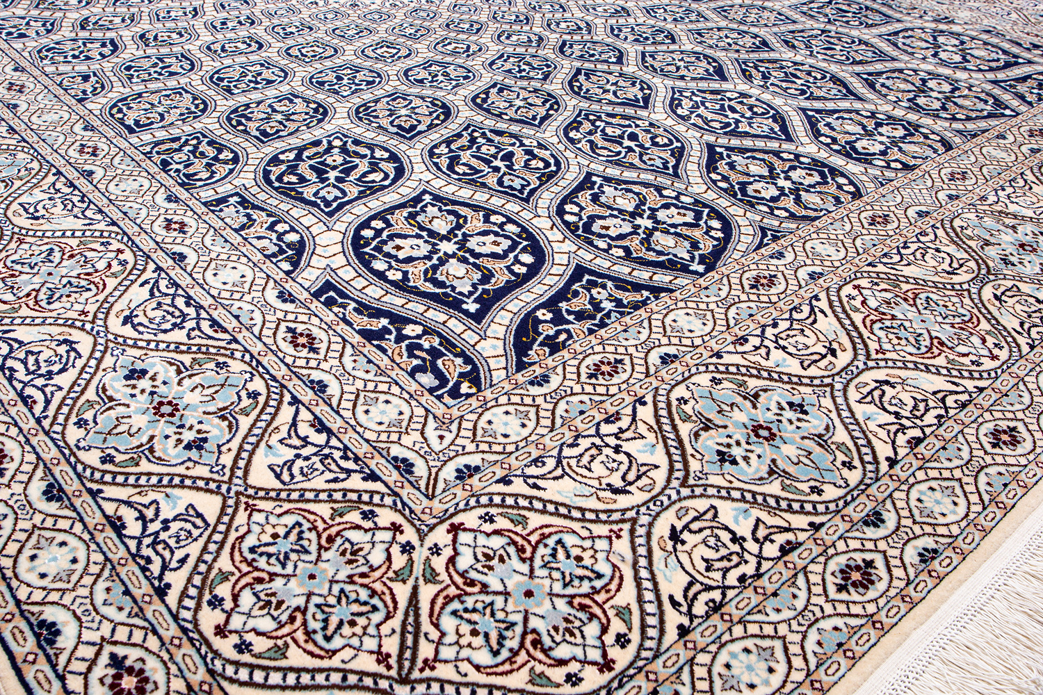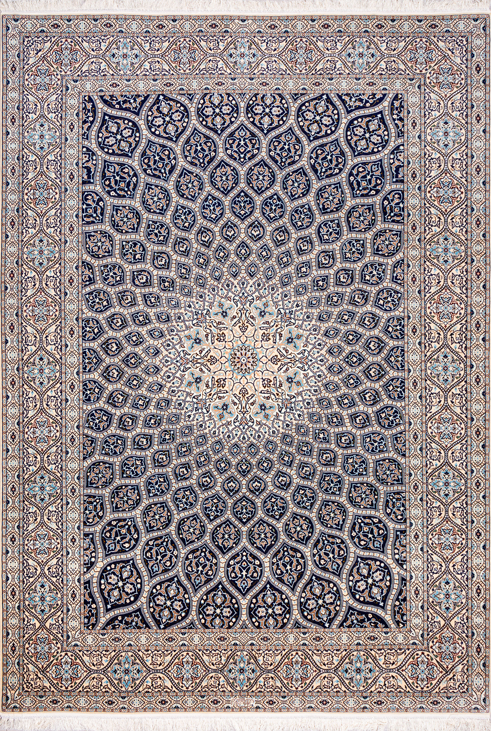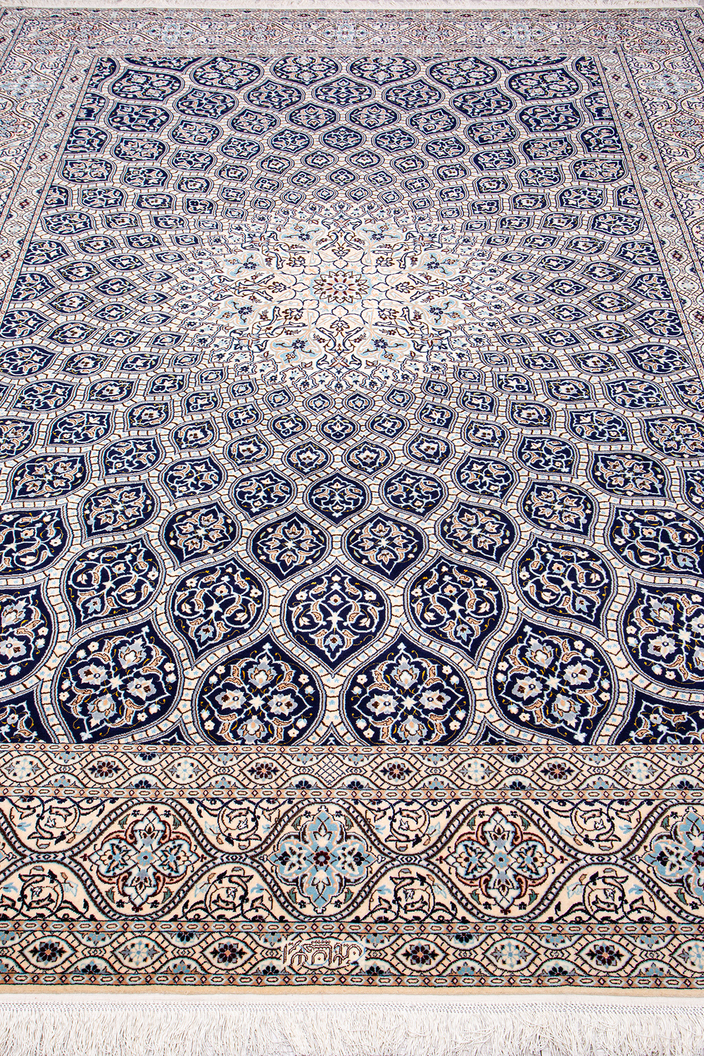 Иранский город Наин знаменит своими аристократичными коврами, которые совмещают в себе классические орнаменты с элегантной цветовой гаммой, выдержанной в бежево-голубых тонах с многочисленными нюансами.
