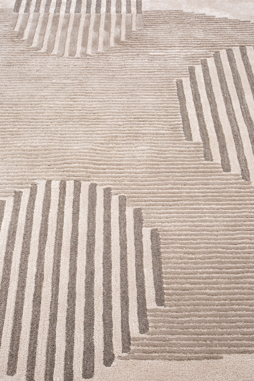 Крупные рисунки в виде линий и фигур на фактурной поверхности ковра превращаются в выразительные композиции. Они акцентируют на себе внимание и добавляют динамики в современный интерьер. Комбинации разных фигур и повторяющийся орнамент задают ритмическую основу пространству, привносят в него оригинальные оптические иллюзии.