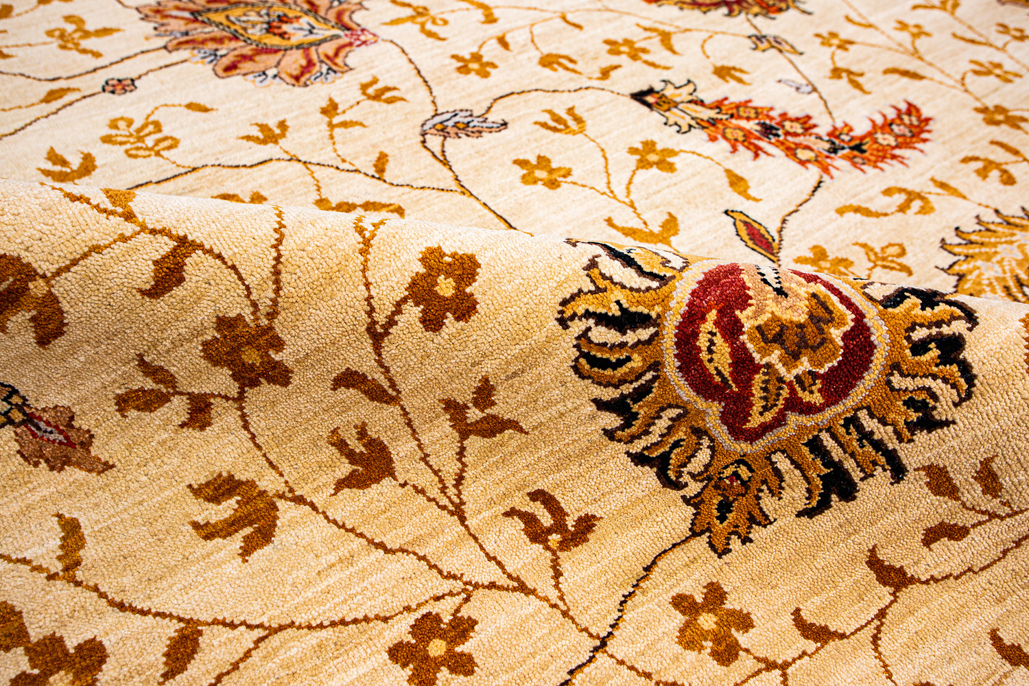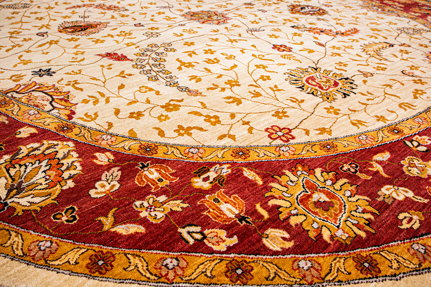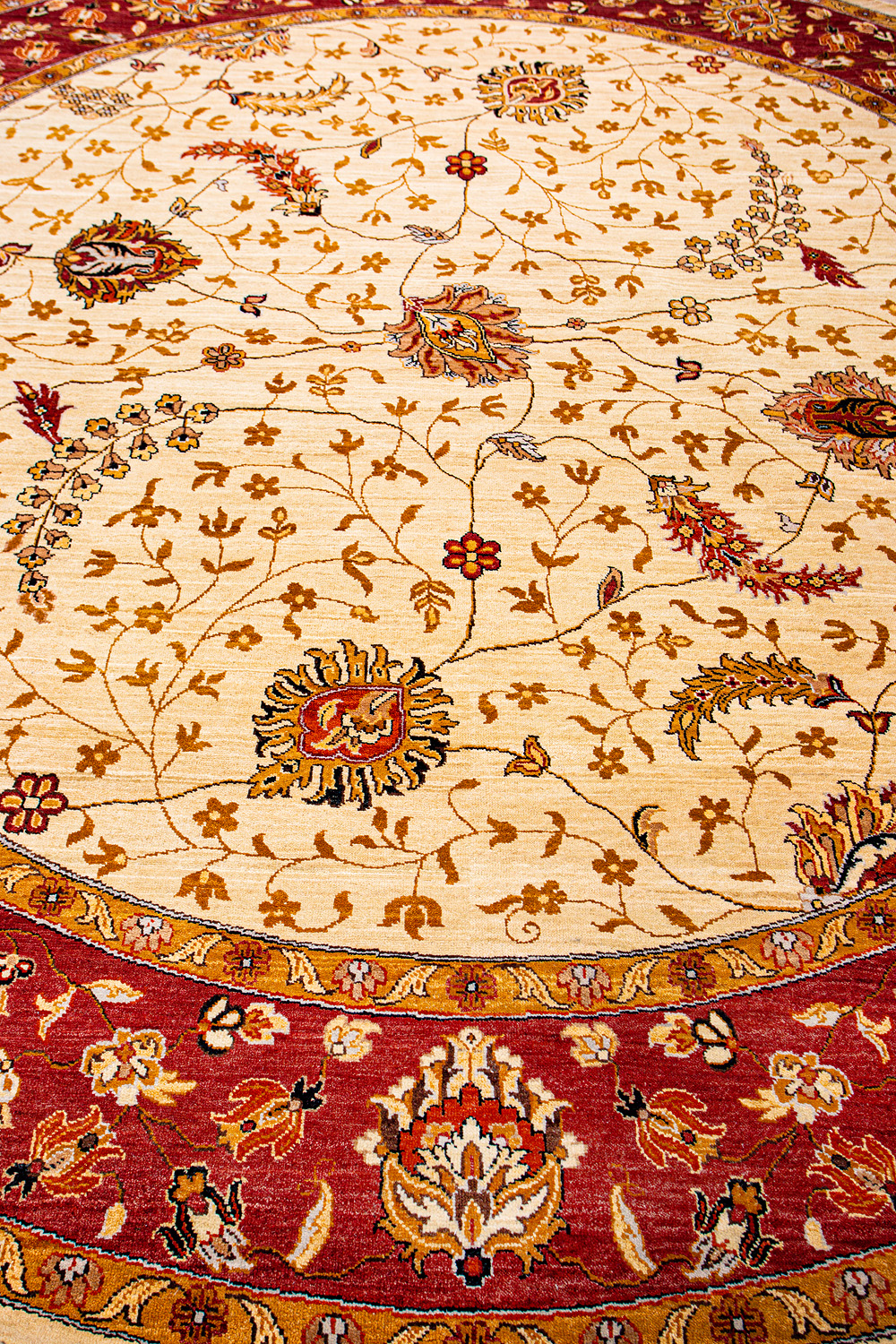 Более пяти веков назад в городе Агра зародилась знаменитая индийская школа ковроткачества, прославившаяся не меньше, чем расположенный здесь же Тадж-Махал. Мощное персидское влияние, помноженное на местный колорит, привело к появлению оригинальных орнаментов с богатыми растительными узорами — причудливым цветам, ветвям и листьям, разбросанным по всему полю ковра.