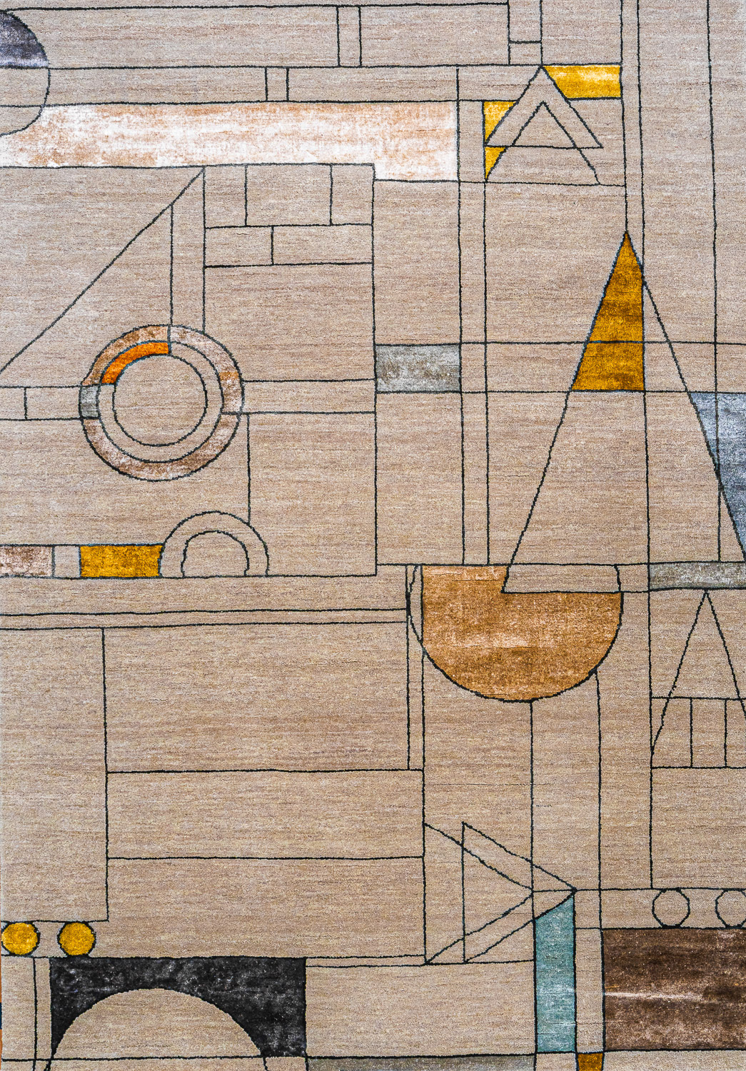 Дизайн ковров напоминает современные полотна художников-абстракционистов и производит столь же яркое и незабываемое впечатление в интерьере. Живописный эффект и необычная фактура зависят от выбора материала: натуральной шерсти, шёлка и от их сочетаний друг с другом. Ковры ткутся вручную в лучших мастерских Индии и Пакистана.
