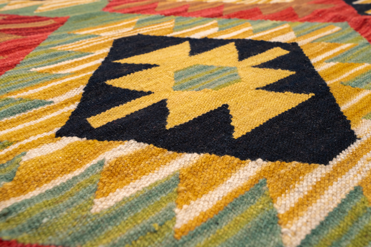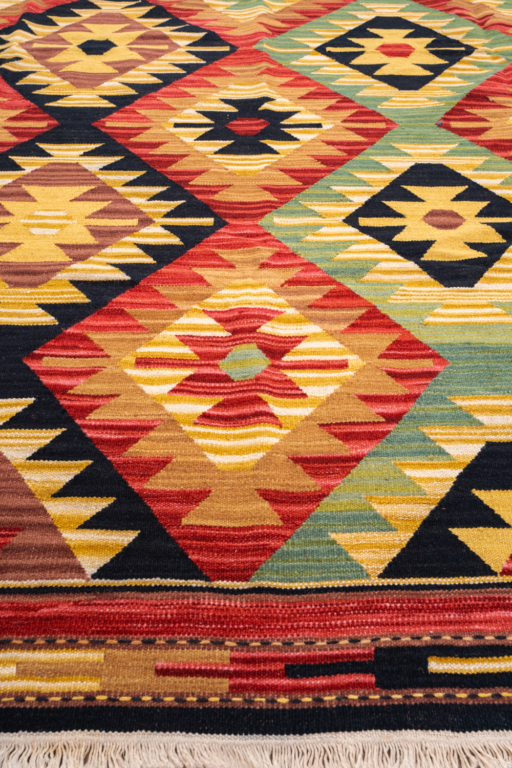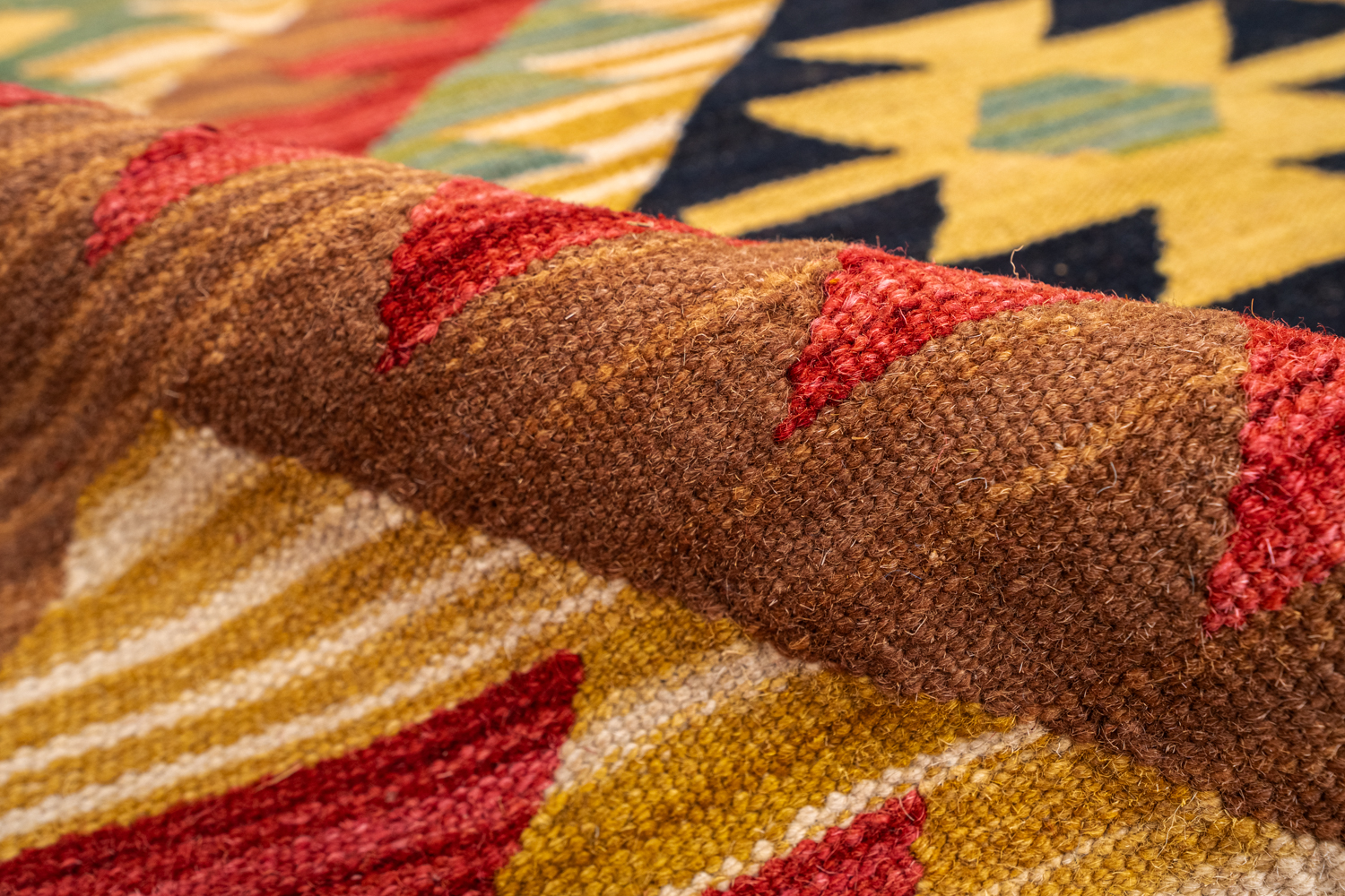 Узор ковров из коллекции Килим создаётся взаимодействием нитей утока и нитей основы, благодаря чему получается геометрический узор.