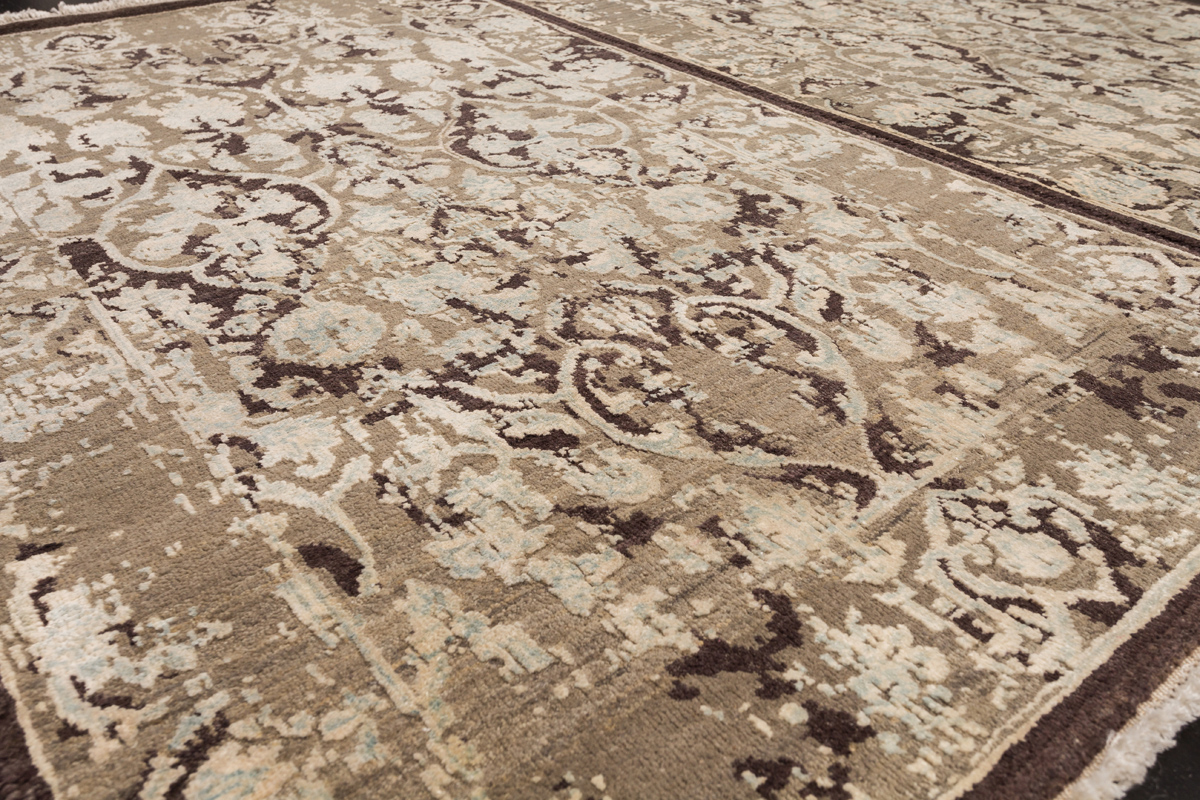 Такой эффект достигается за счет специальной техники плетения, а также обработки, которой подвергают ковры, чтобы они выглядели как антикварные — то есть дорого, элегантно и модно.