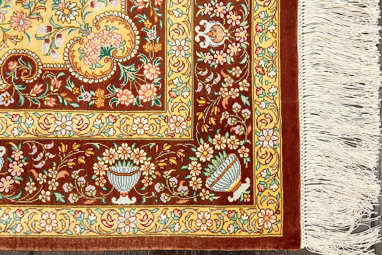 Шёлковая нить гибкая и прочная, поэтому ковры из этого материала считаются самыми износостойкими, а по количеству цветов в одном узоре ковры из коллекции Кум, пожалуй, остаются непревзойдёнными.
