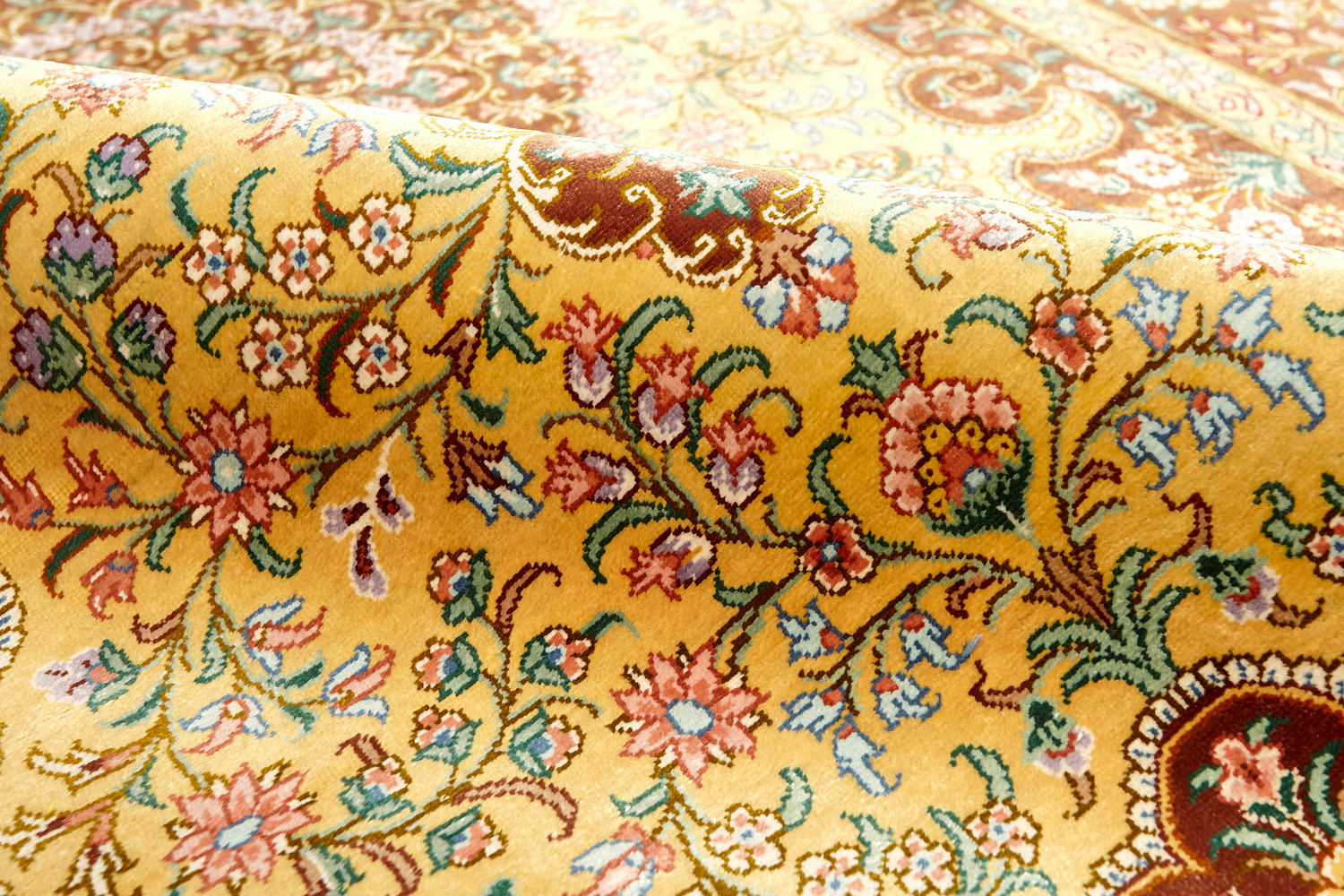 Детальные орнаменты, множество насыщенных оттенков, мягкость и нежность переливающегося шёлка стали отличительными чертами прекрасных ковров и обеспечили им мировую известность.