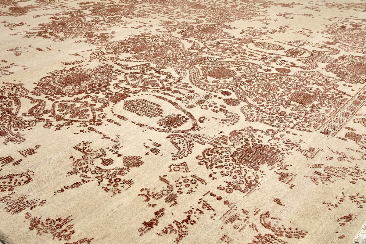 Такой эффект достигается за счет специальной техники плетения, а также обработки, которой подвергают ковры, чтобы они выглядели как антикварные — то есть дорого, элегантно и модно.