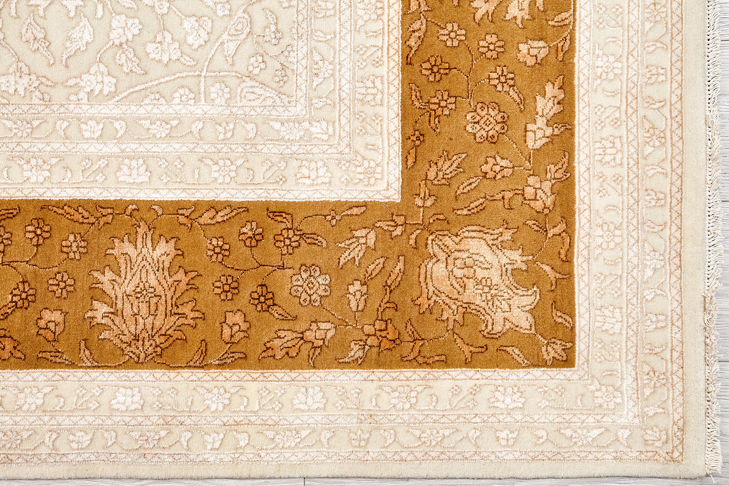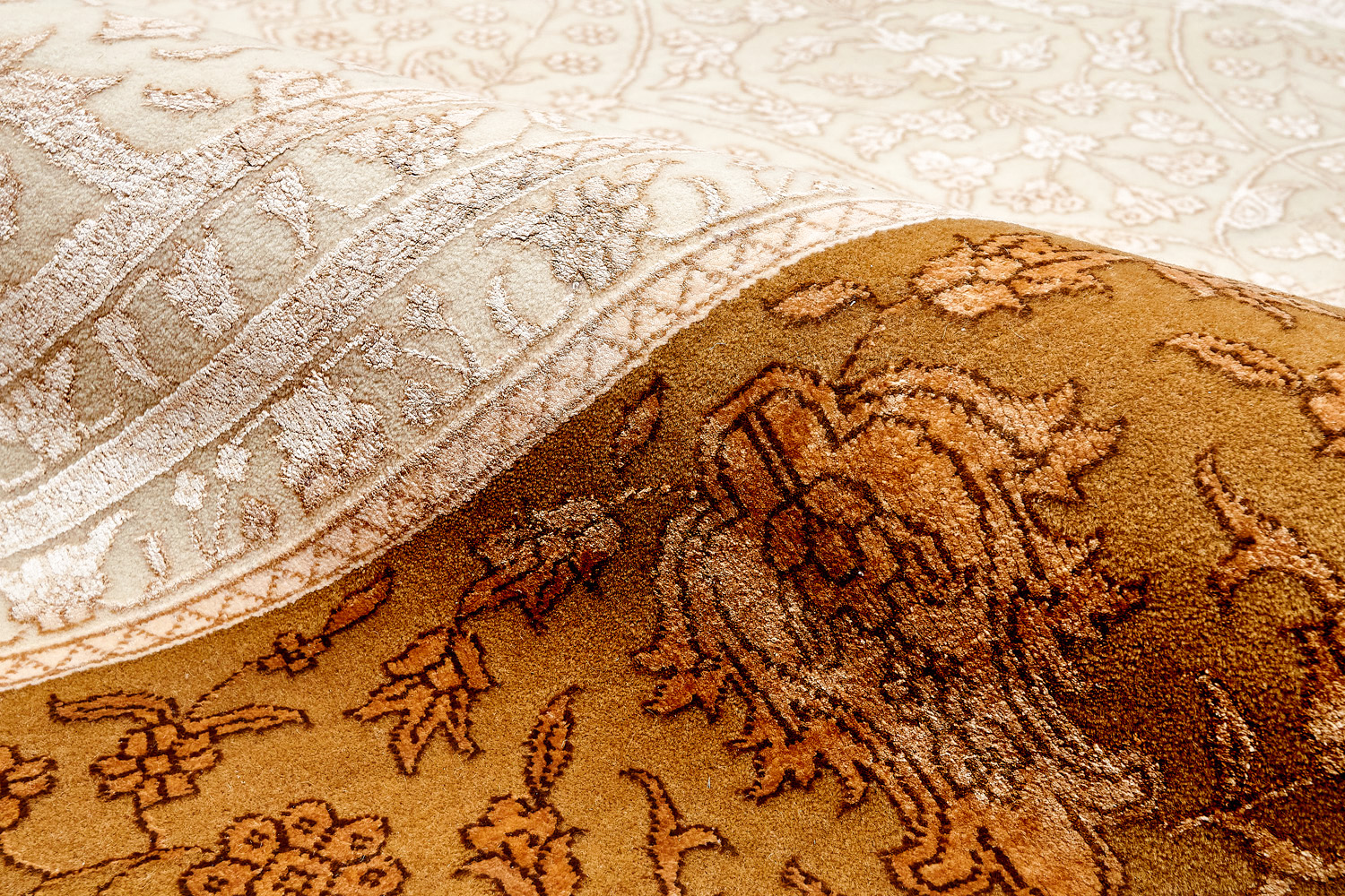 Каждый ковер в этой коллекции соткан вручную из шерсти и арт шёлка опытными индийскими мастерами.