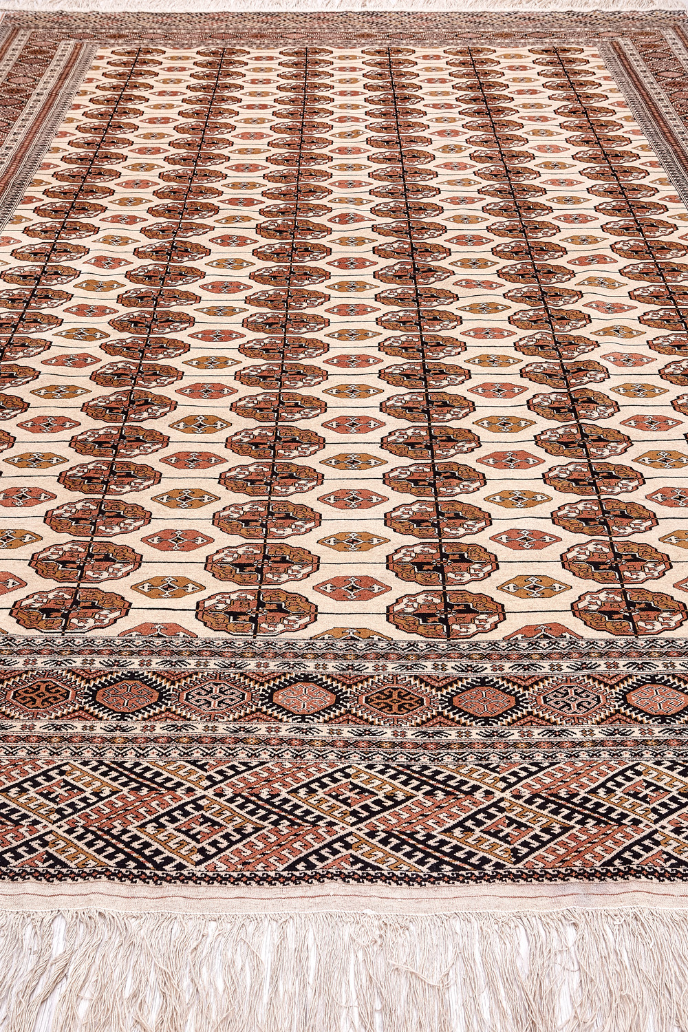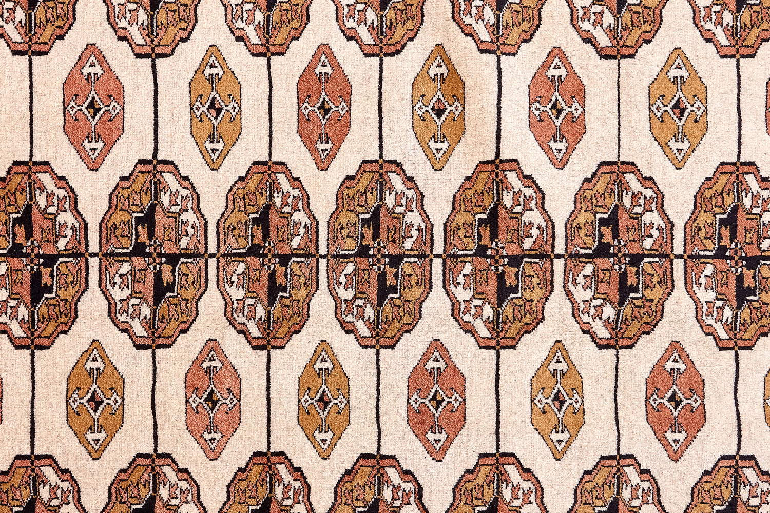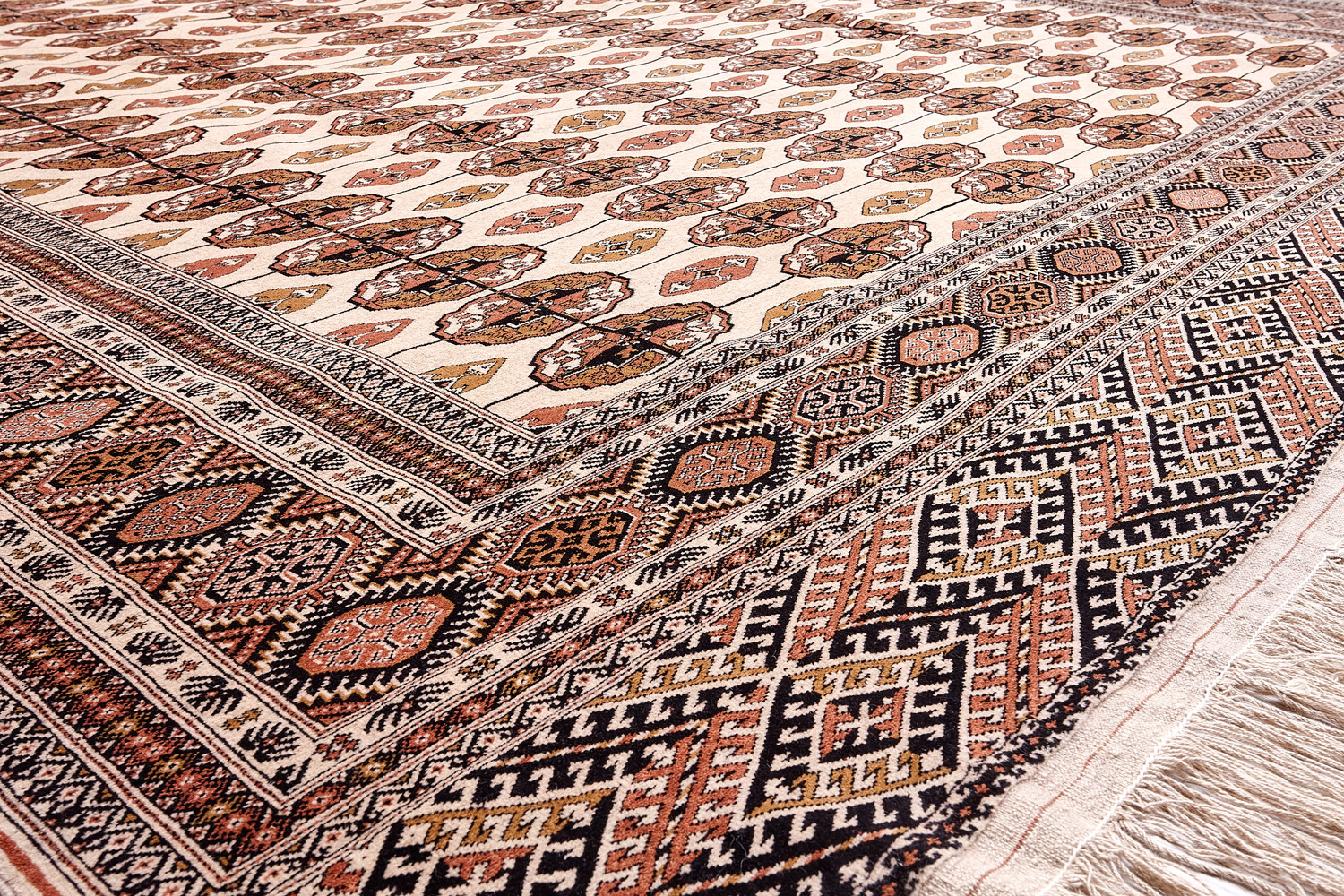 Классические туркменские ковры имеют тёмно-красный (иногда коричневый и синий) цвет фона и орнамент, который словно обведен чёрной линией, отделяющий один узор от другого.