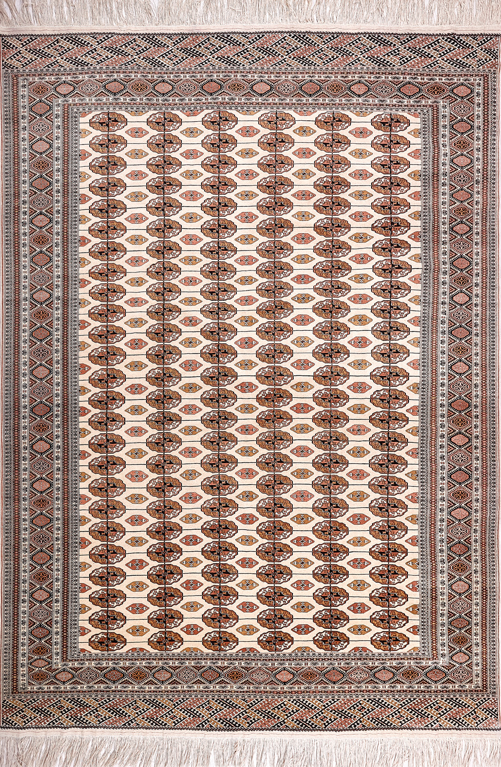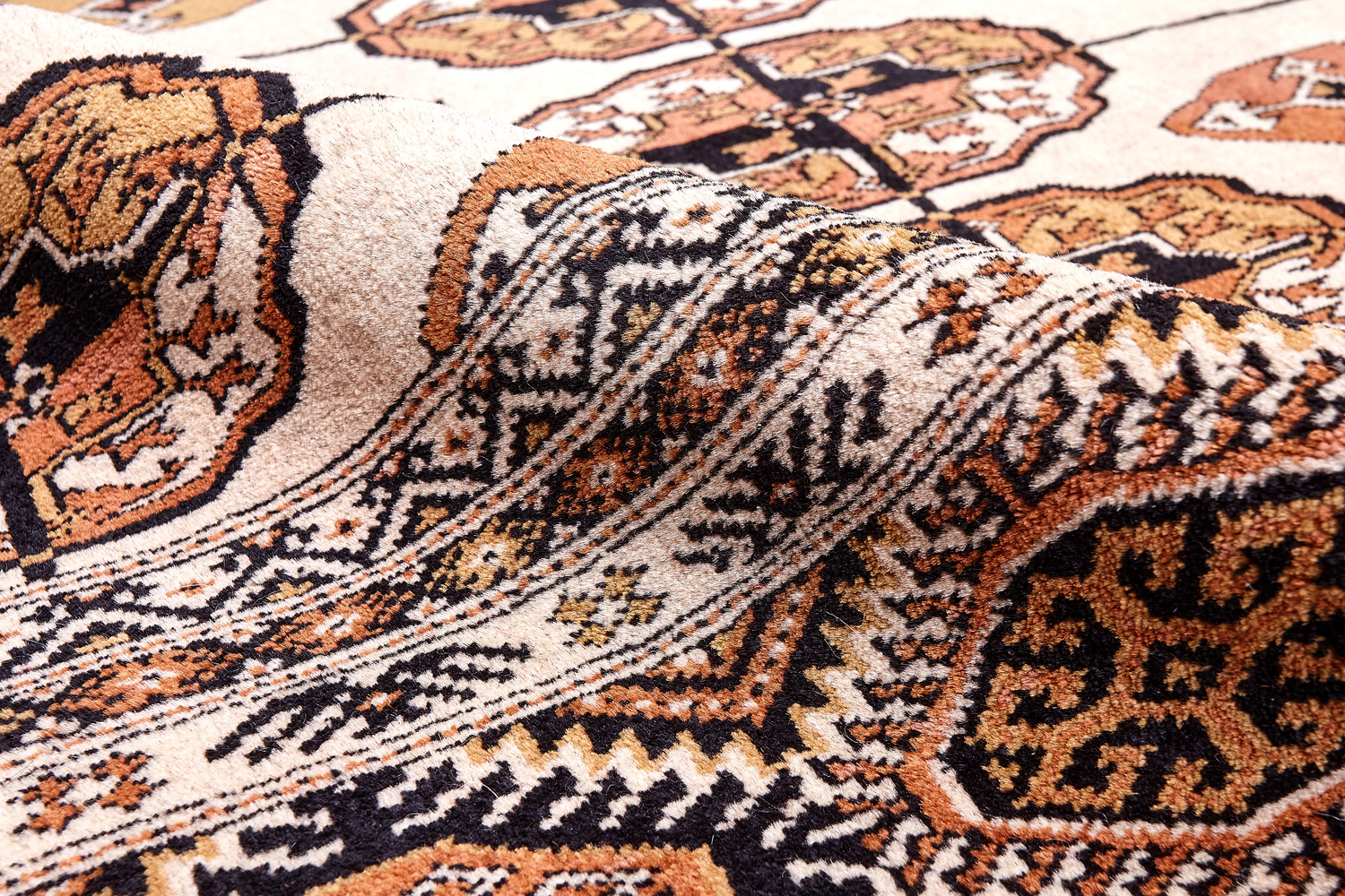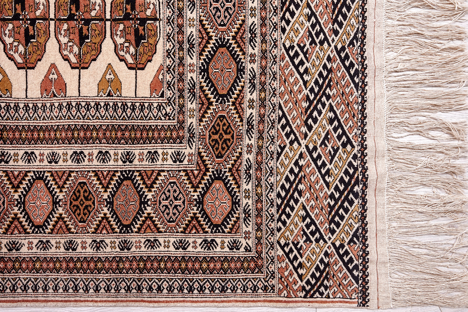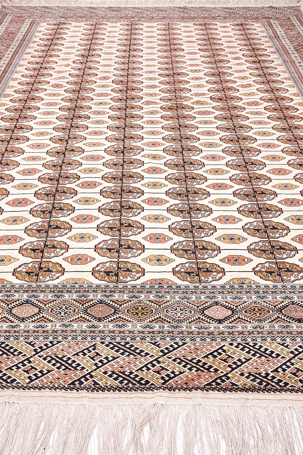 Классические туркменские ковры имеют тёмно-красный (иногда коричневый и синий) цвет фона и орнамент, который словно обведен чёрной линией, отделяющий один узор от другого.