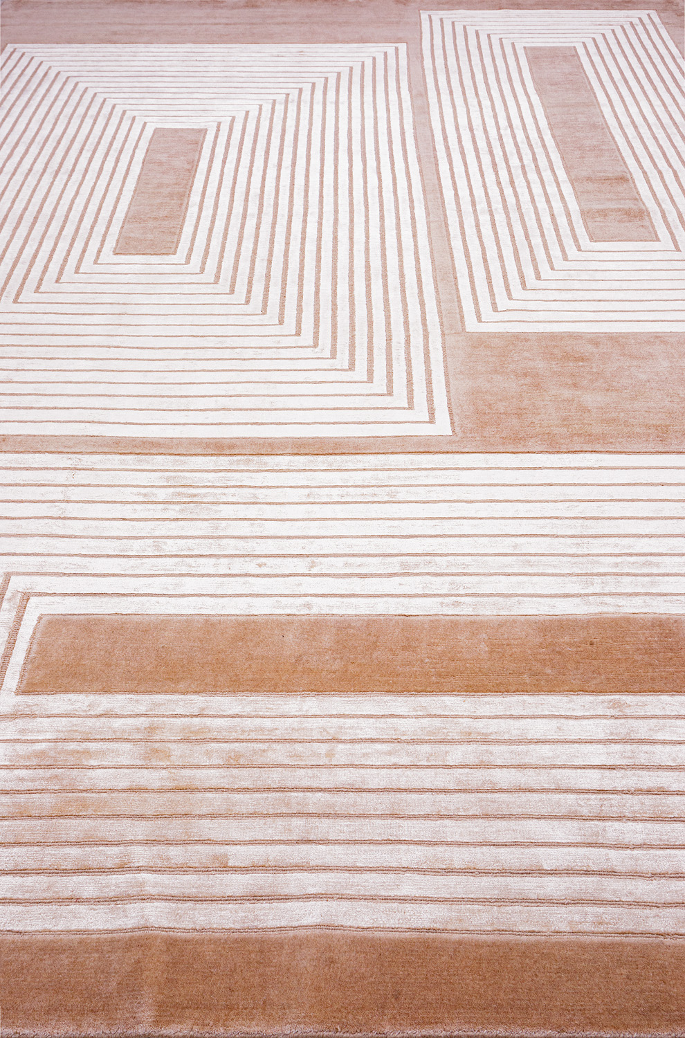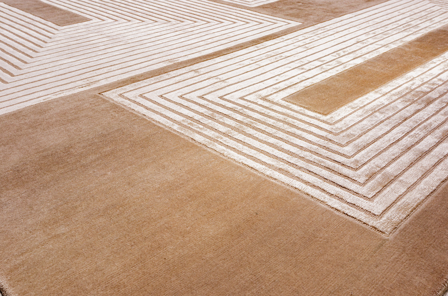 Крупные рисунки в виде линий и фигур на фактурной поверхности ковра превращаются в выразительные композиции. Они акцентируют на себе внимание и добавляют динамики в современный интерьер. Комбинации разных фигур и повторяющийся орнамент задают ритмическую основу пространству, привносят в него оригинальные оптические иллюзии.