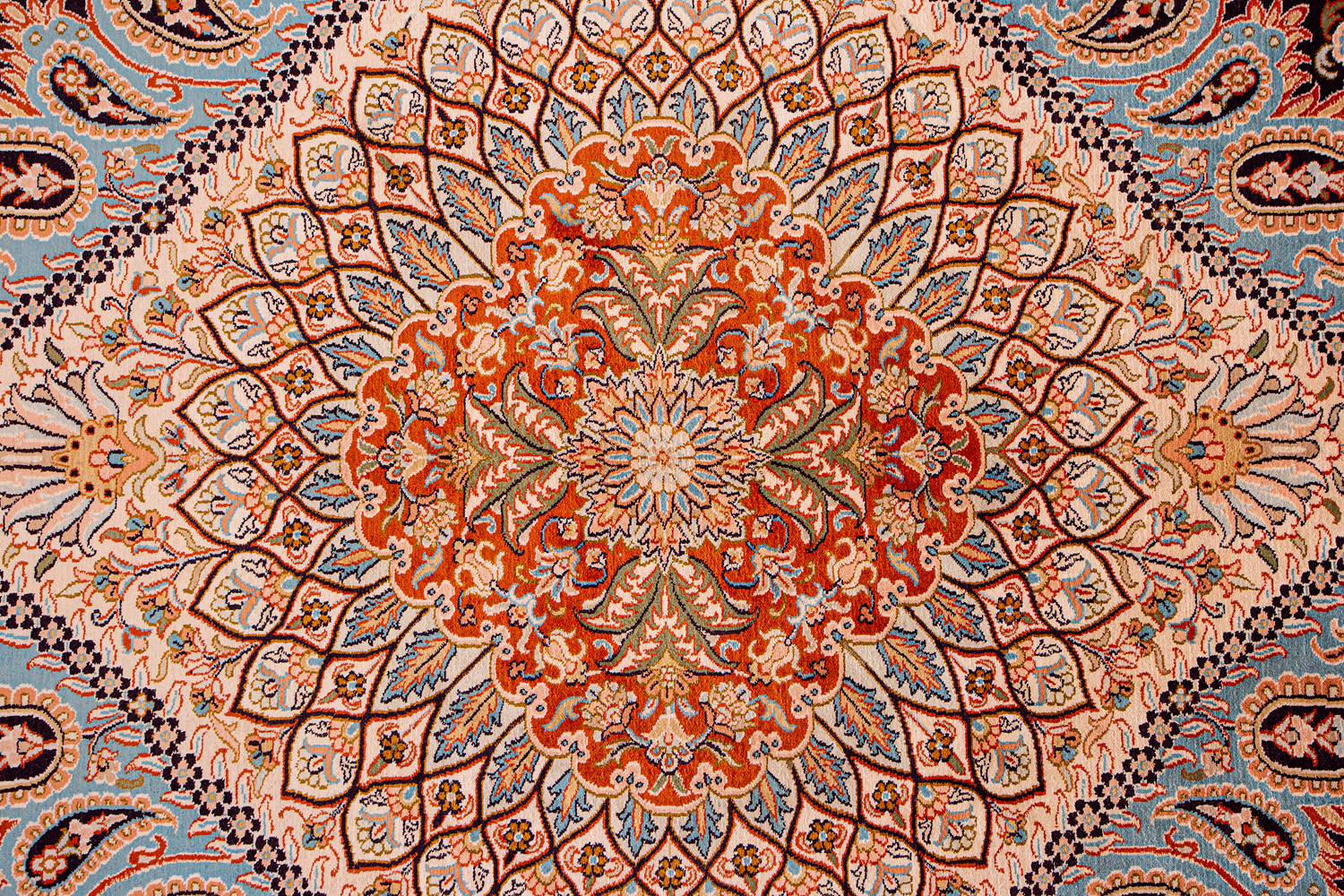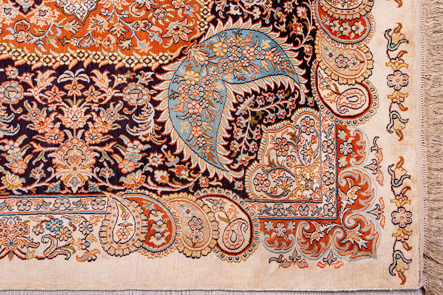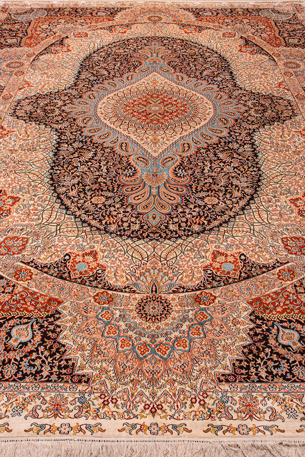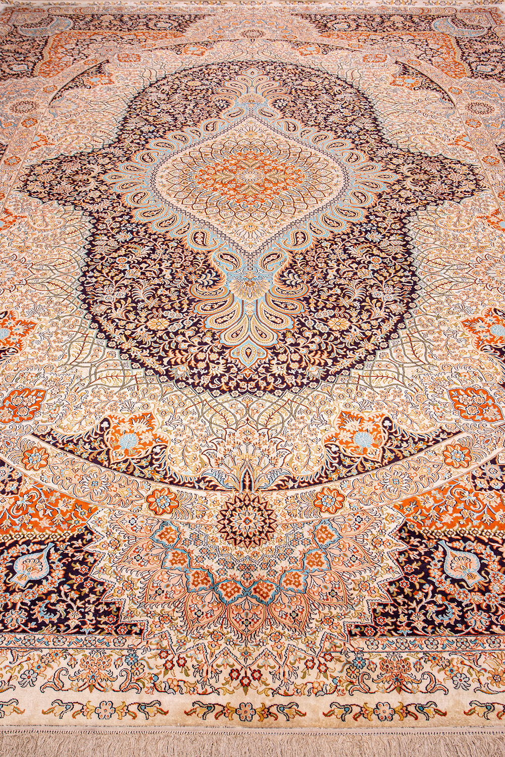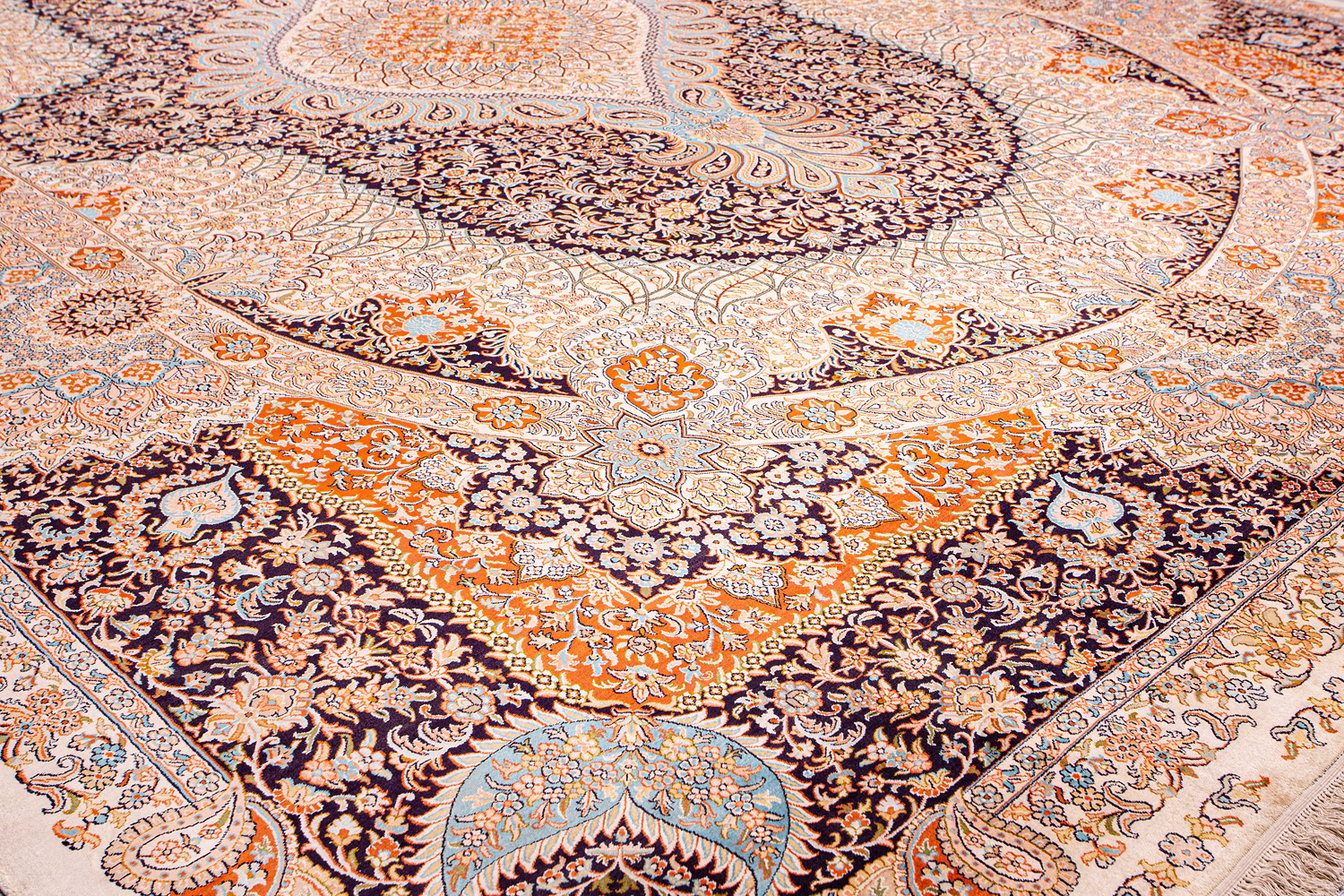 Ковры из коллекции Кашмир ткутся по традиционной технологии из нежнейшего кашмирского шелка. Лучшие произведения индийских мастеров отличает высокая узелковая плотность, прочность и яркость цветов.
