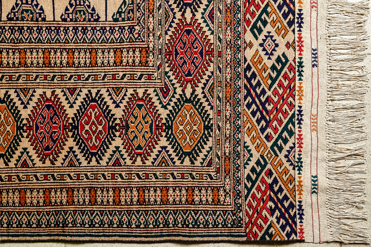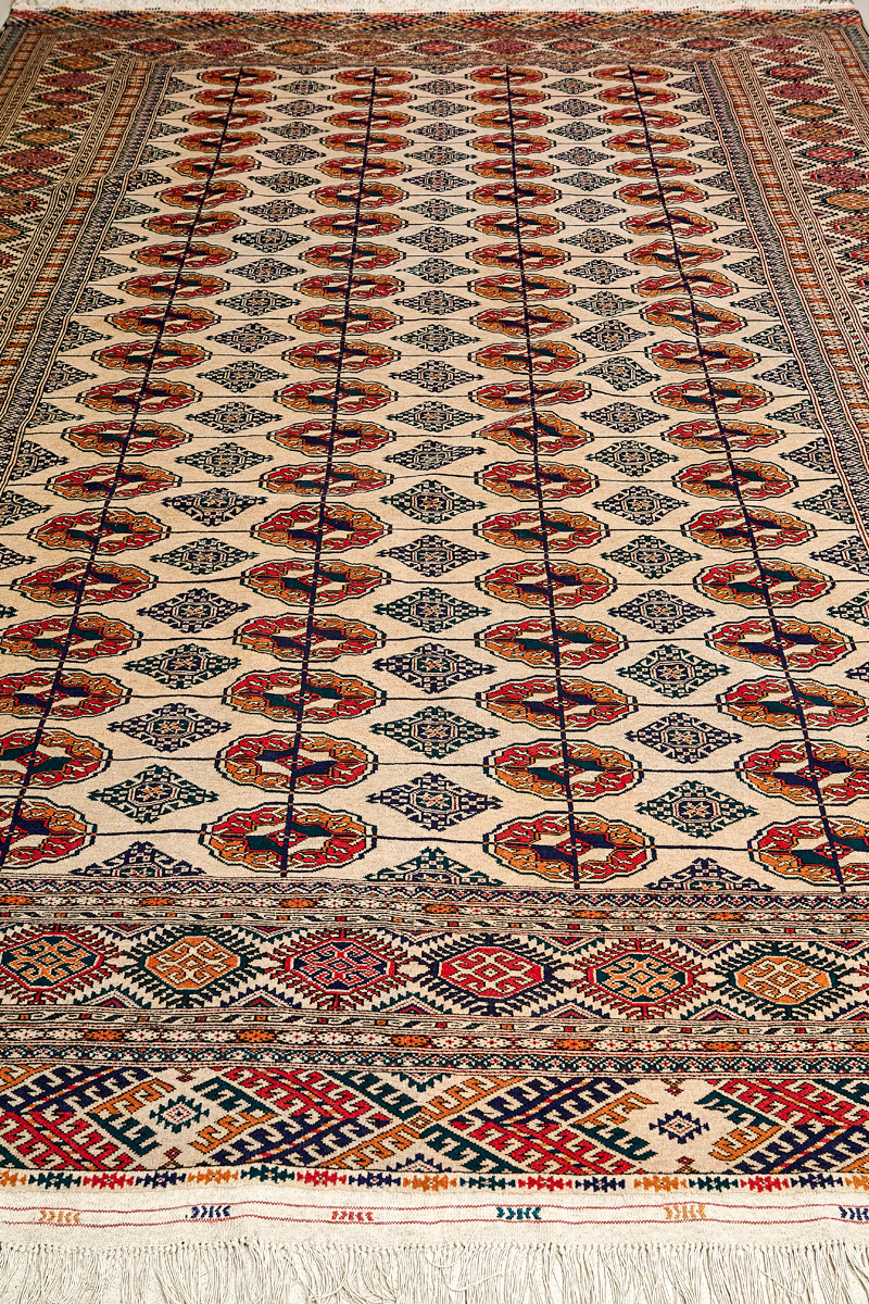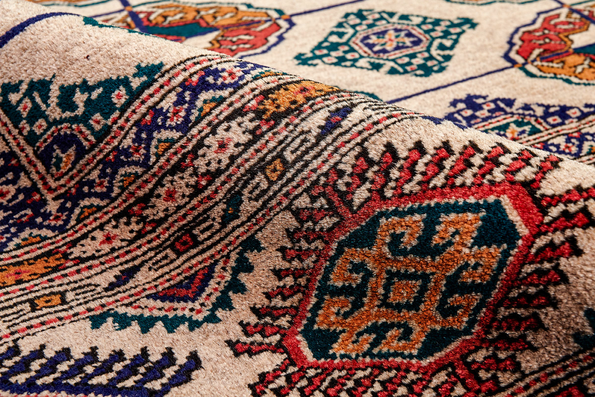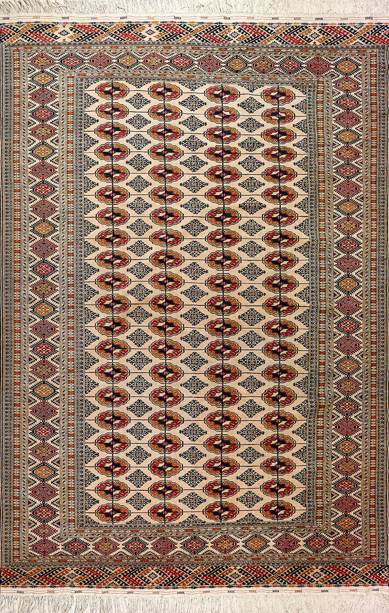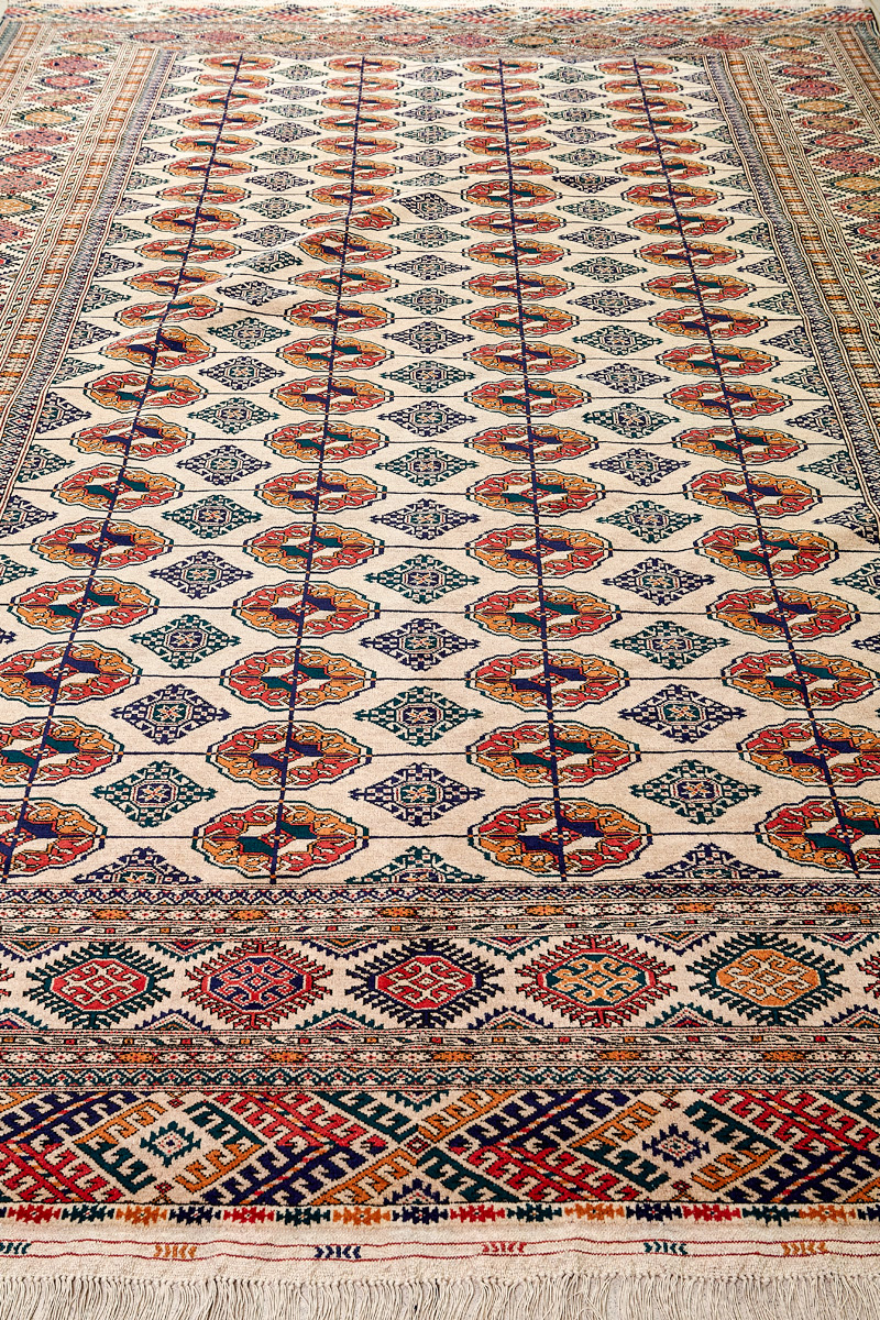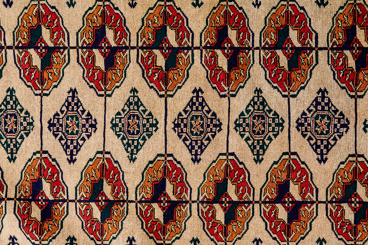 Классические туркменские ковры имеют тёмно-красный (иногда коричневый и синий) цвет фона и орнамент, который словно обведен чёрной линией, отделяющий один узор от другого.
