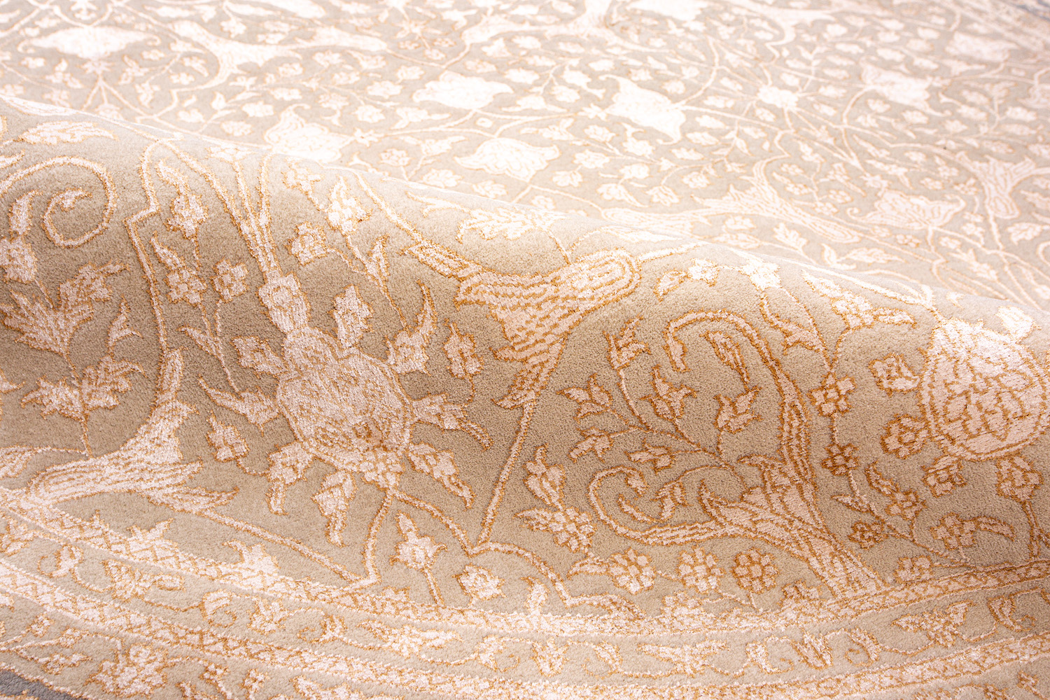 Каждый ковер в этой коллекции соткан вручную из шерсти и арт шёлка опытными индийскими мастерами.