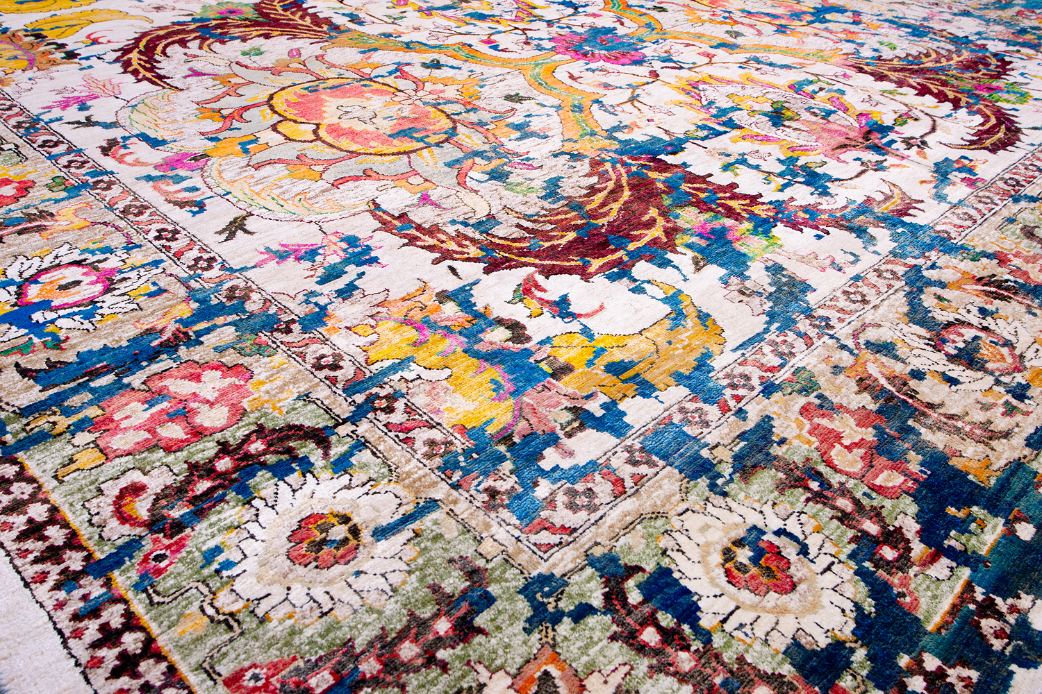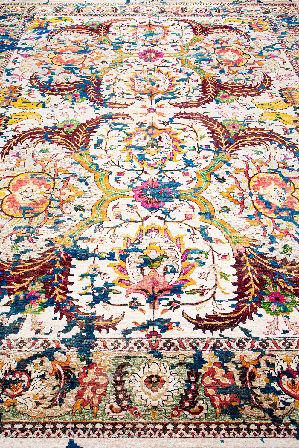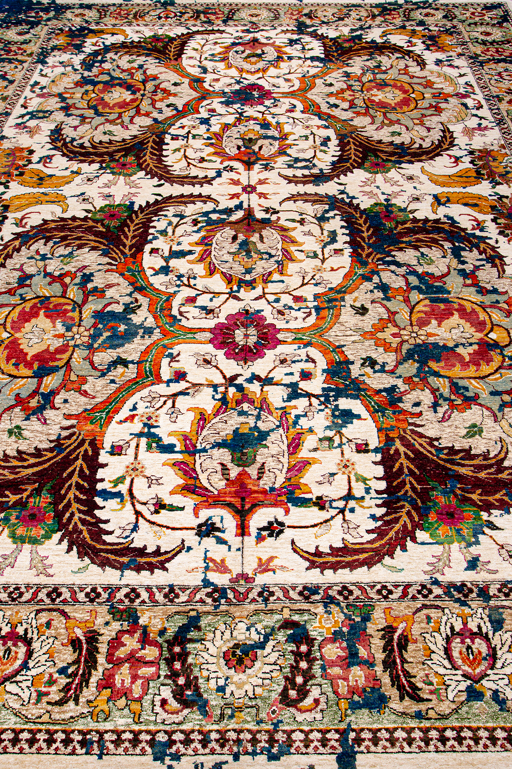 Родина этих ковров Индия и Пакистан. Чтобы создать такое произведение искусства у мастеров уходит от одного года до двух лет. Плотность ковров, в зависимости от размера, составляет от 150 000 до 400 000 узлов на квадратный метр.