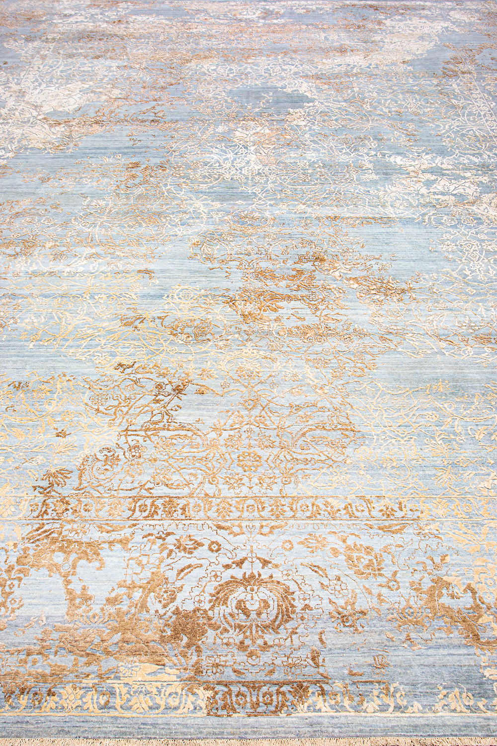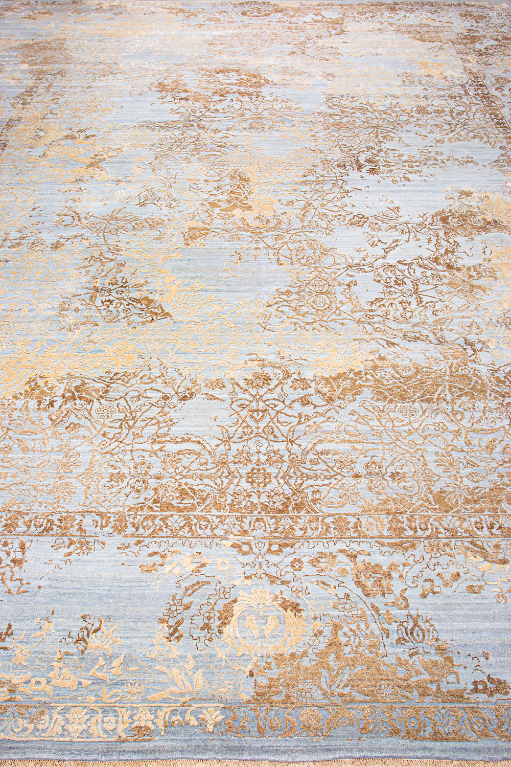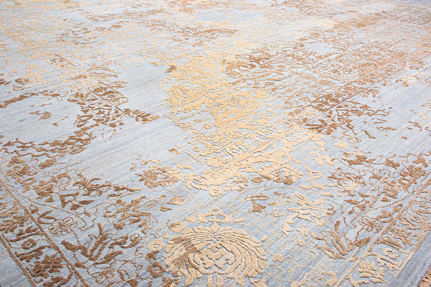 Такой эффект достигается за счет специальной техники плетения, а также обработки, которой подвергают ковры, чтобы они выглядели как антикварные — то есть дорого, элегантно и модно.