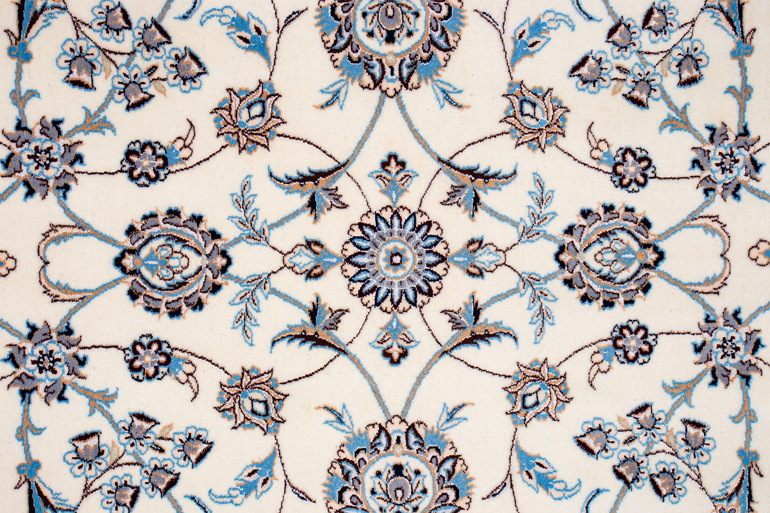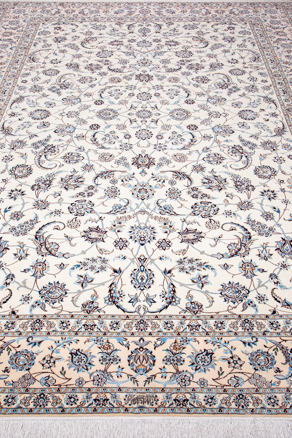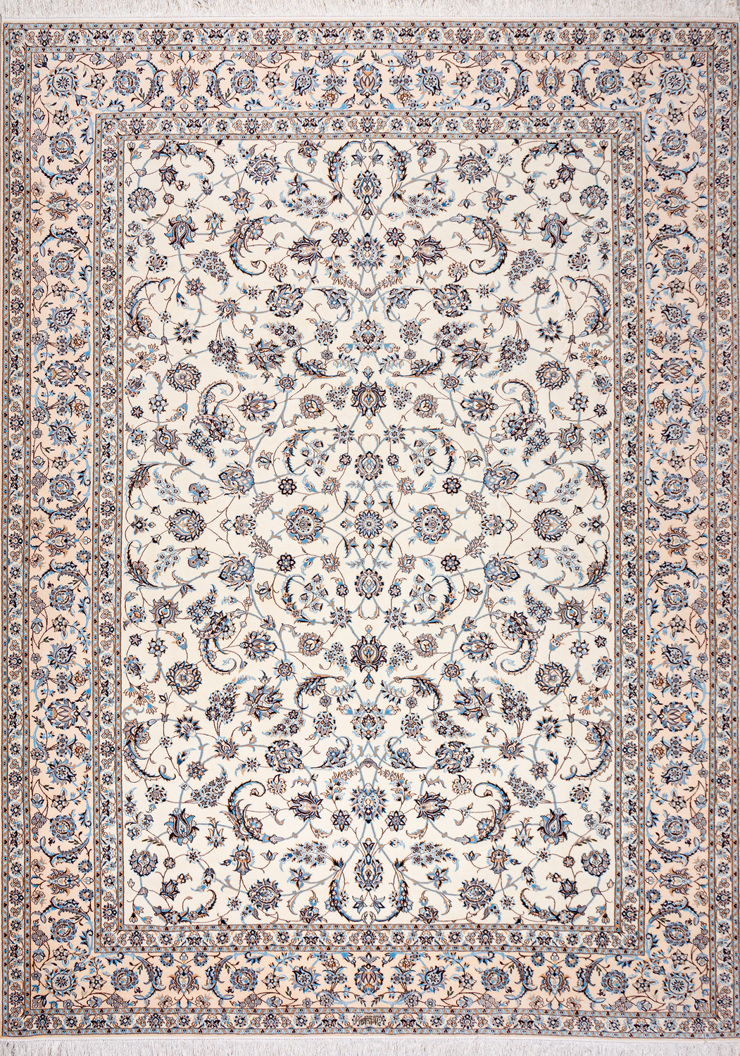 Иранский город Наин знаменит своими аристократичными коврами, которые совмещают в себе классические орнаменты с элегантной цветовой гаммой, выдержанной в бежево-голубых тонах с многочисленными нюансами.