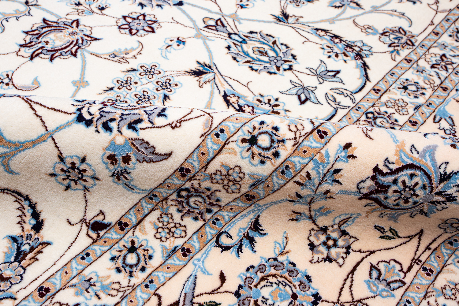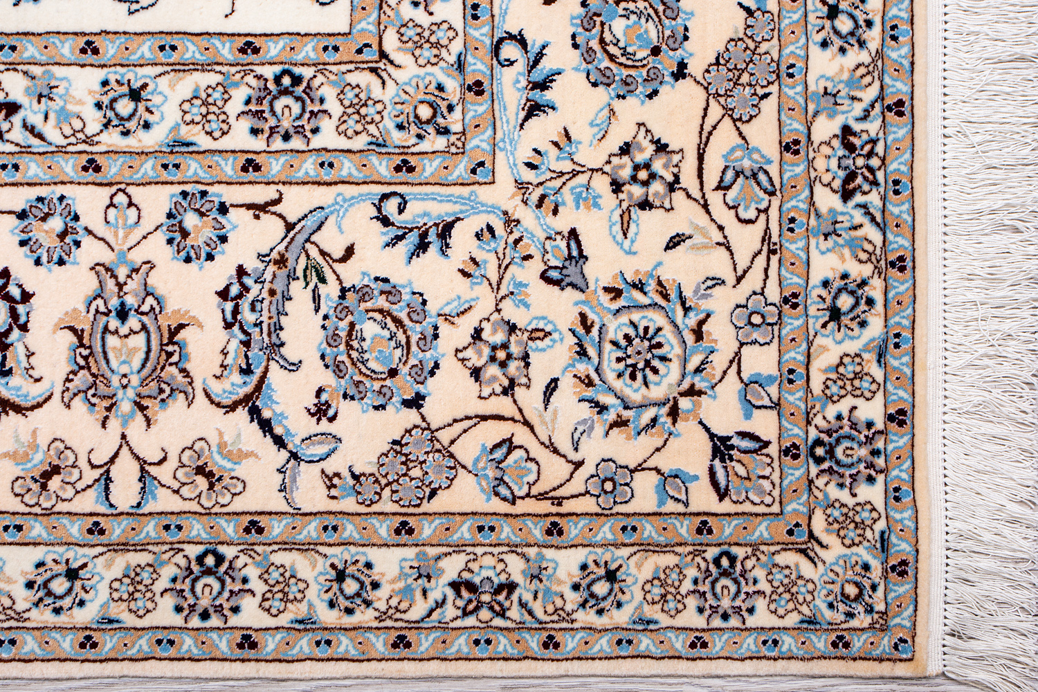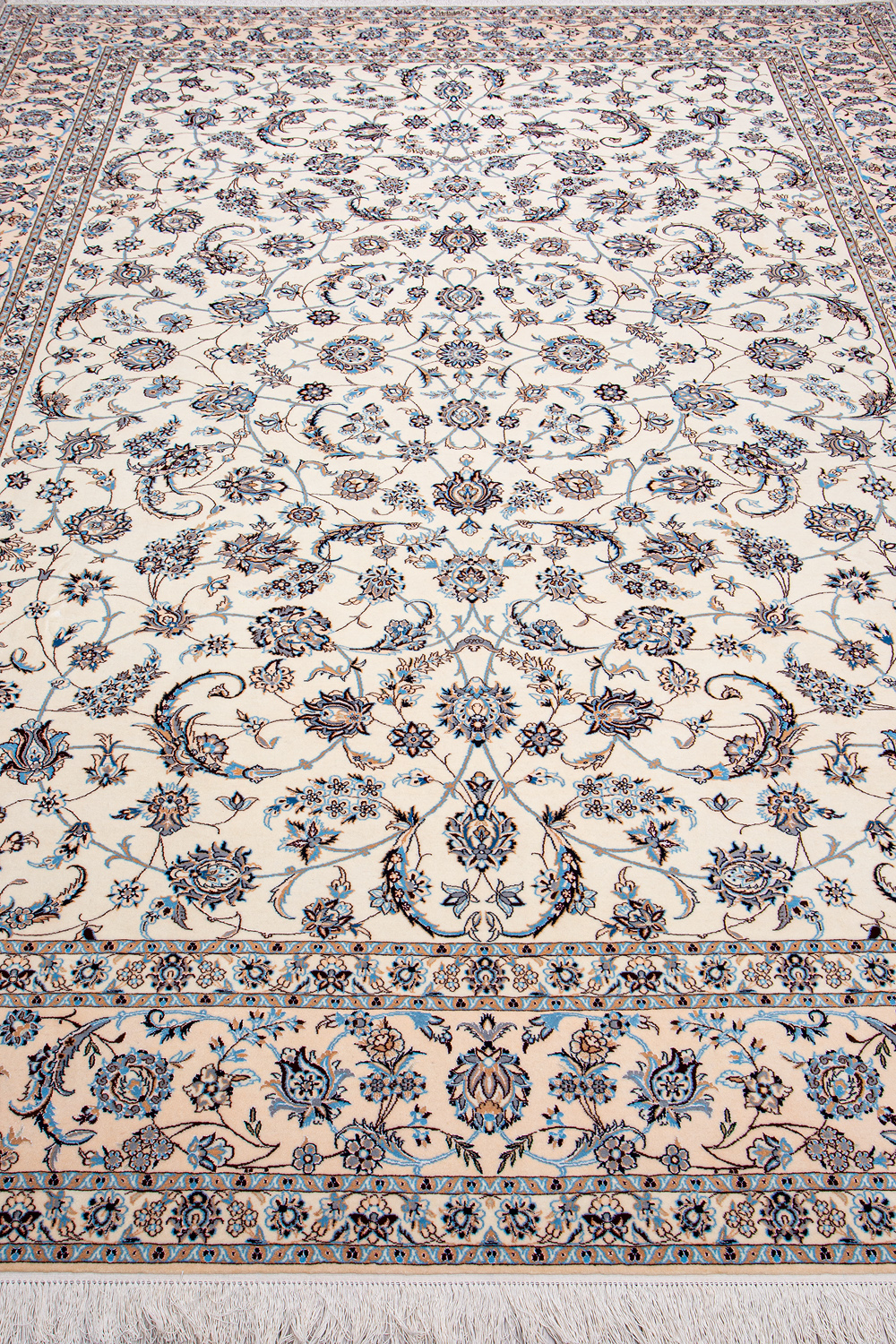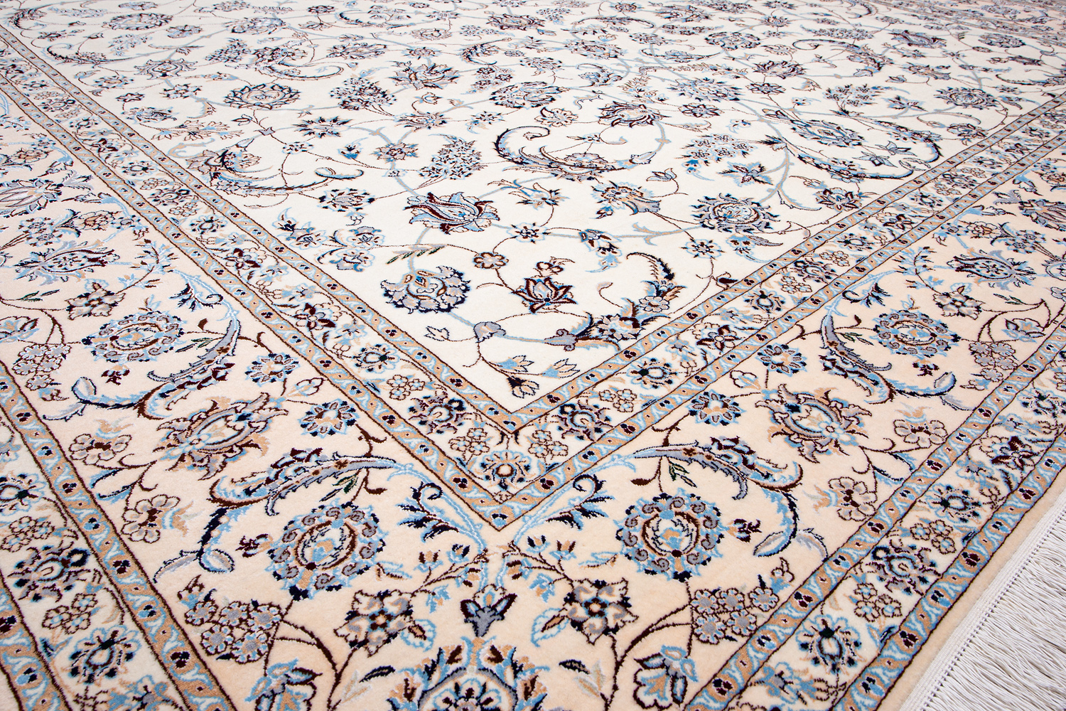 Иранский город Наин знаменит своими аристократичными коврами, которые совмещают в себе классические орнаменты с элегантной цветовой гаммой, выдержанной в бежево-голубых тонах с многочисленными нюансами.