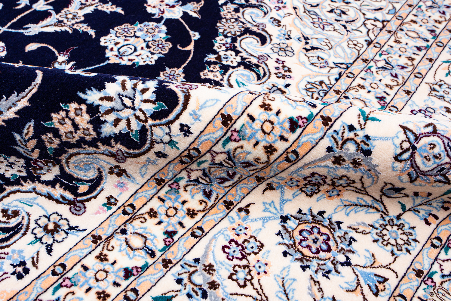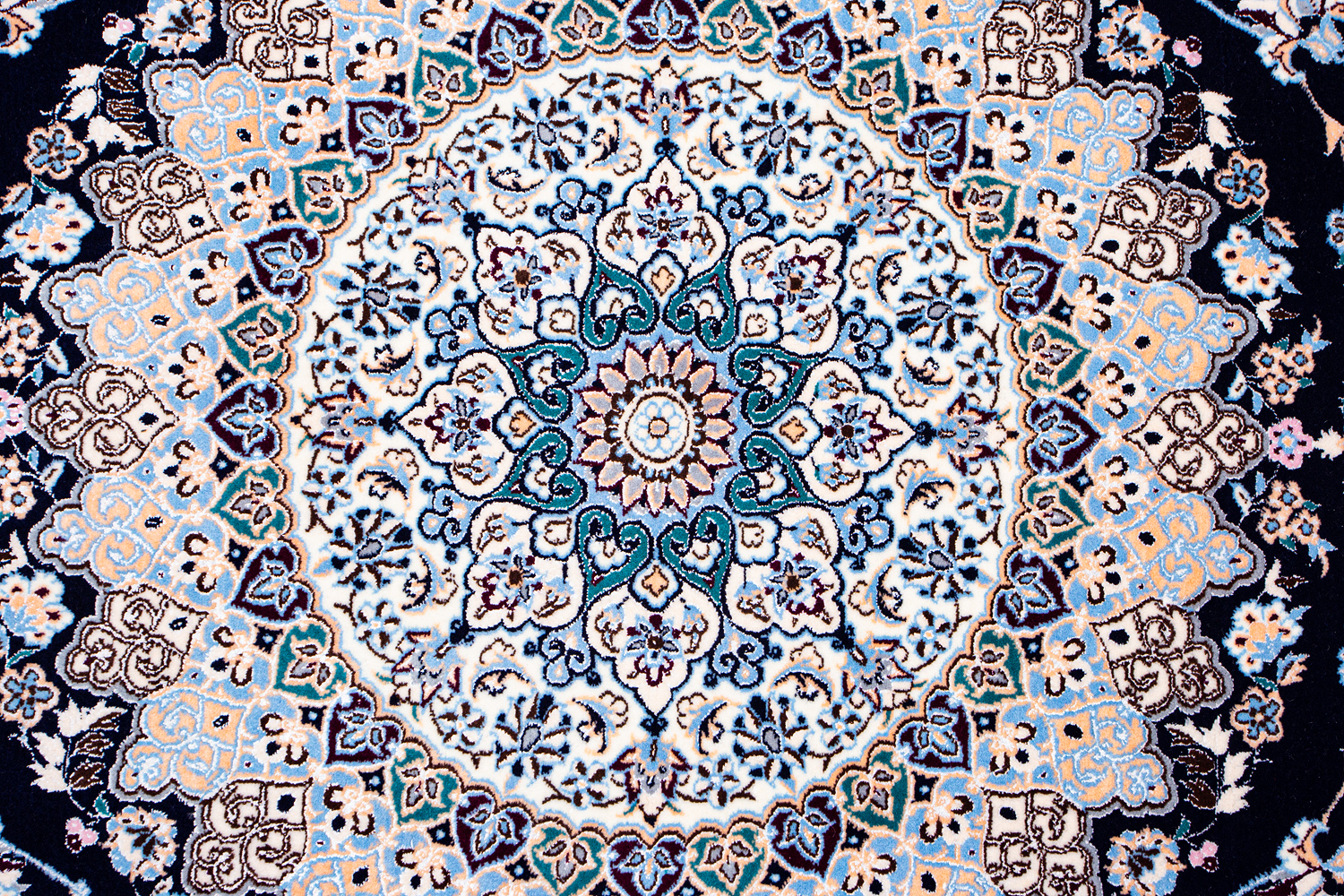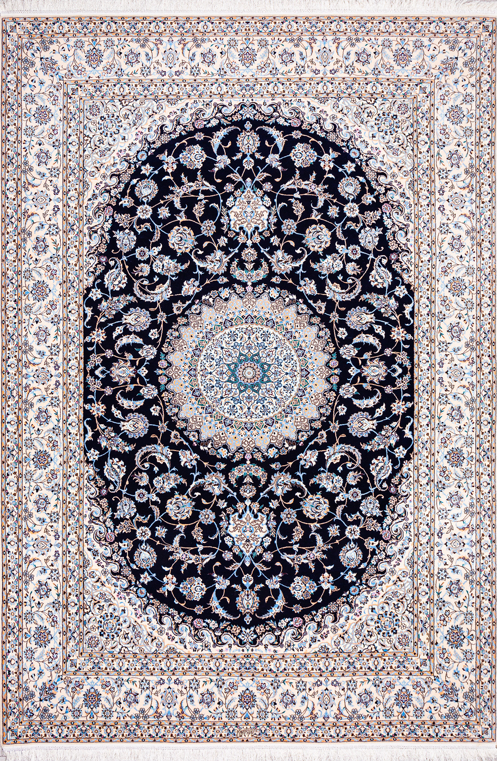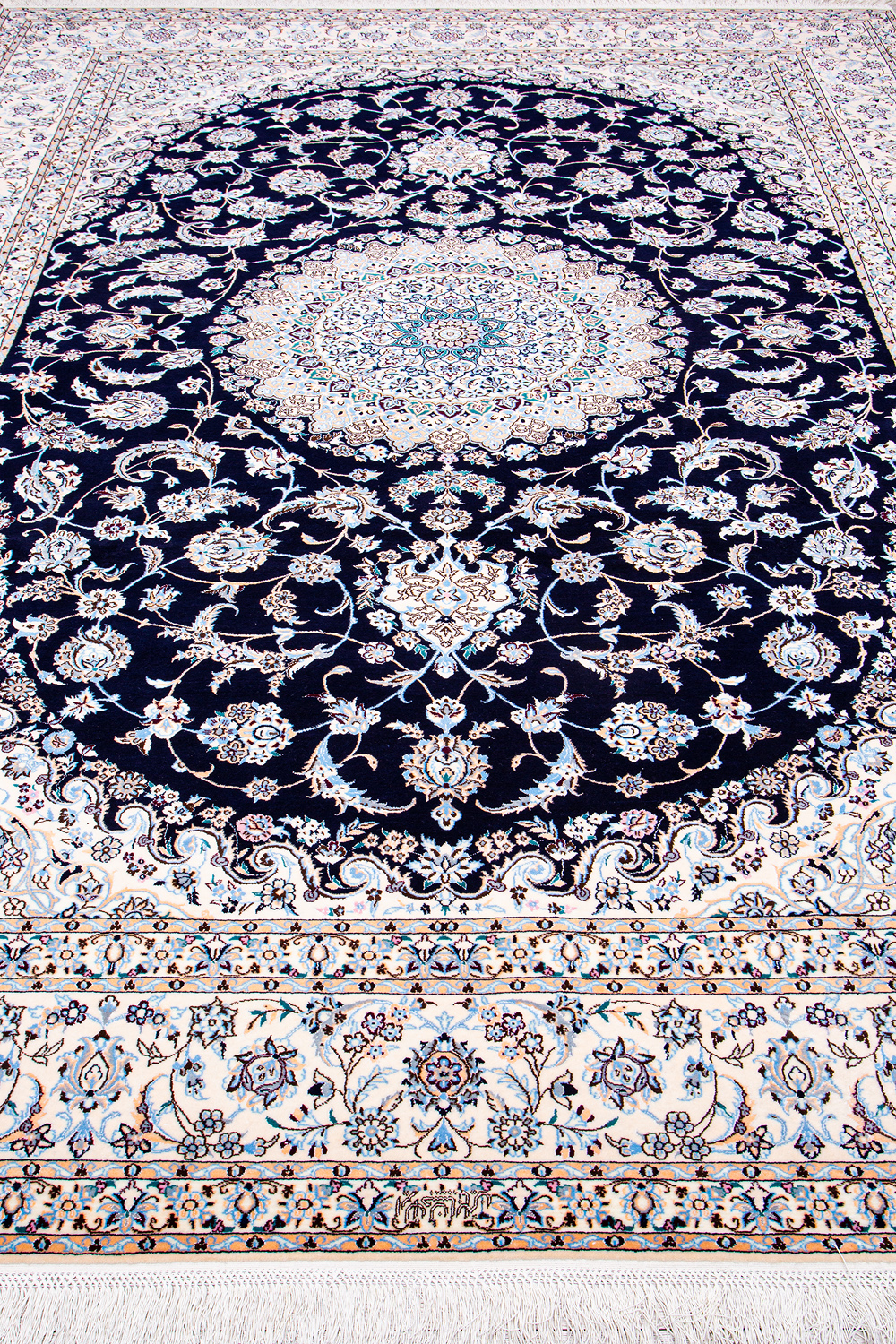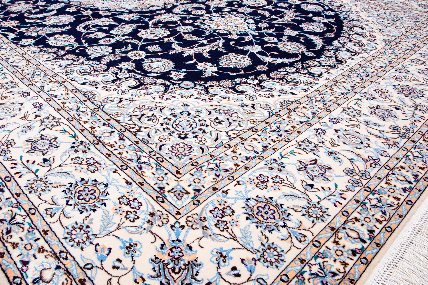 Иранский город Наин знаменит своими аристократичными коврами, которые совмещают в себе классические орнаменты с элегантной цветовой гаммой, выдержанной в бежево-голубых тонах с многочисленными нюансами.