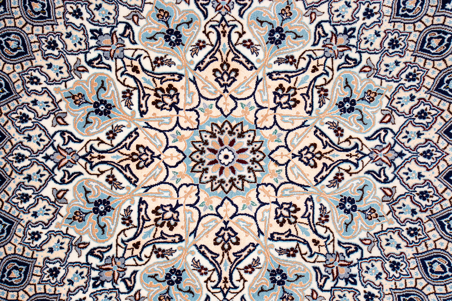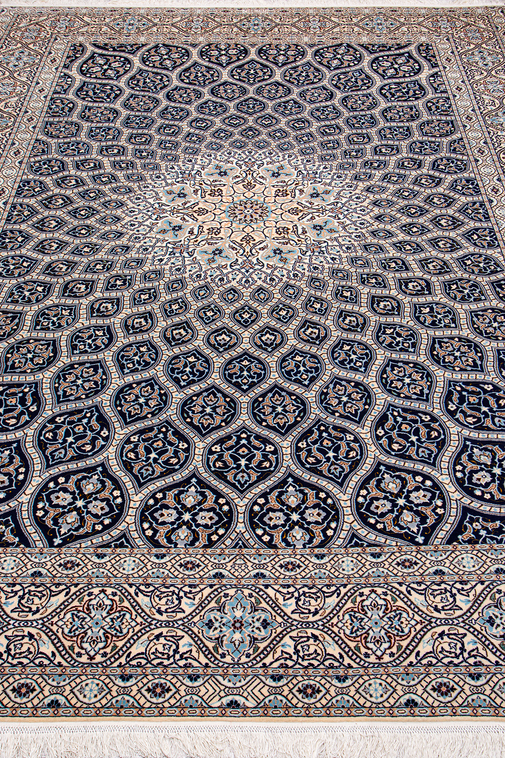 Иранский город Наин знаменит своими аристократичными коврами, которые совмещают в себе классические орнаменты с элегантной цветовой гаммой, выдержанной в бежево-голубых тонах с многочисленными нюансами.