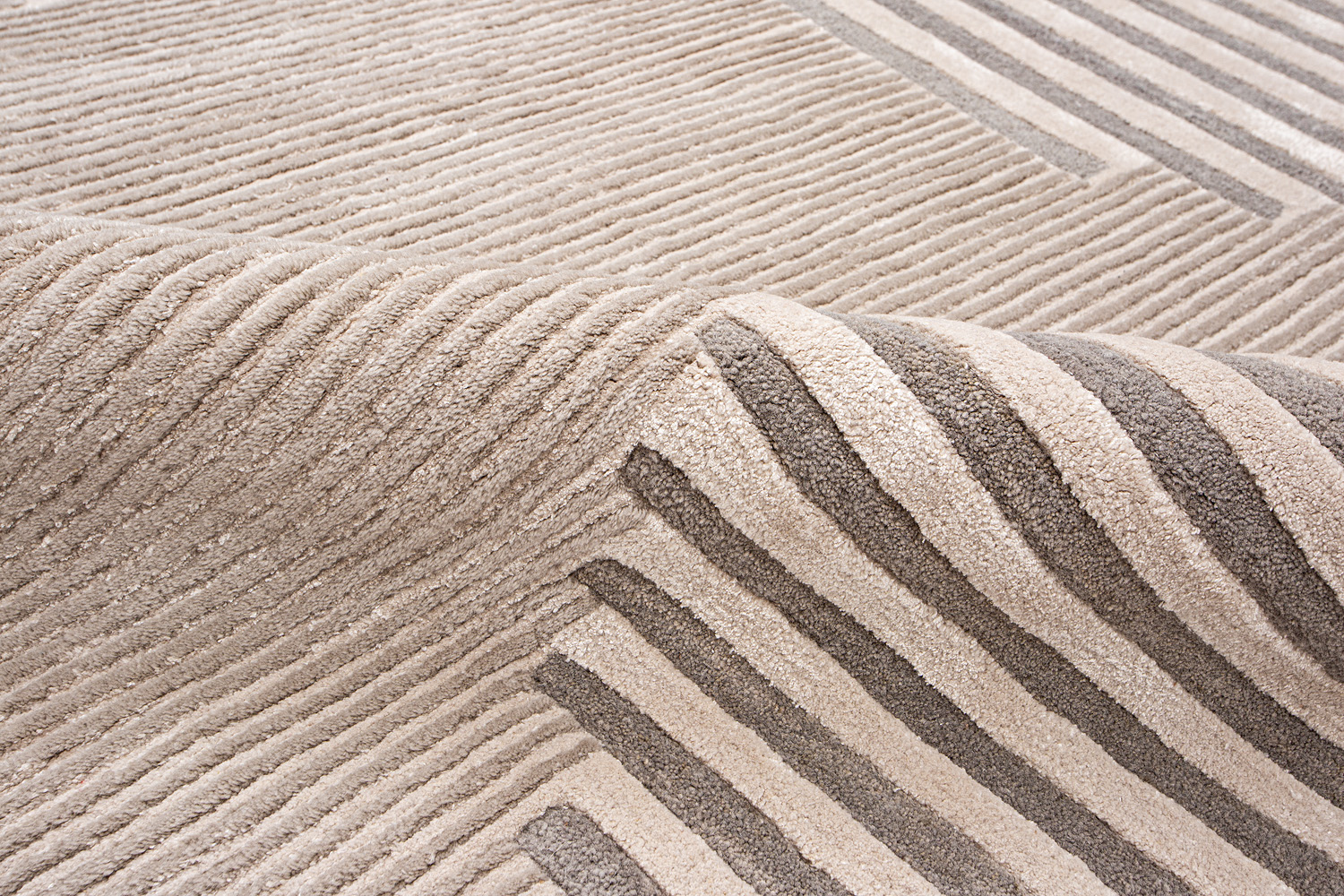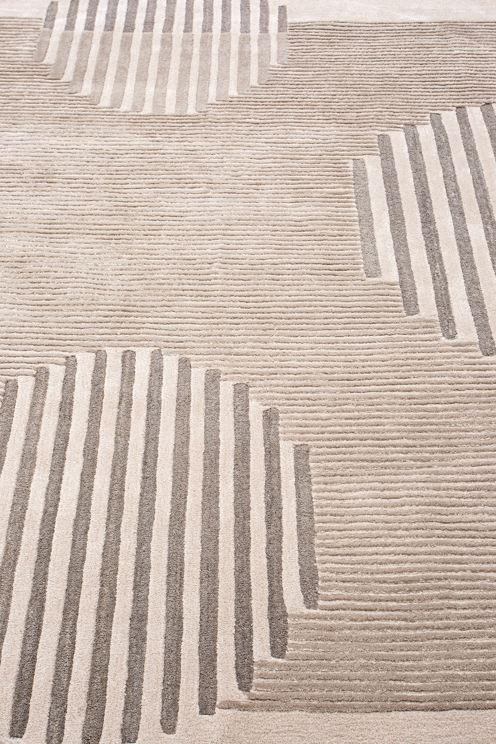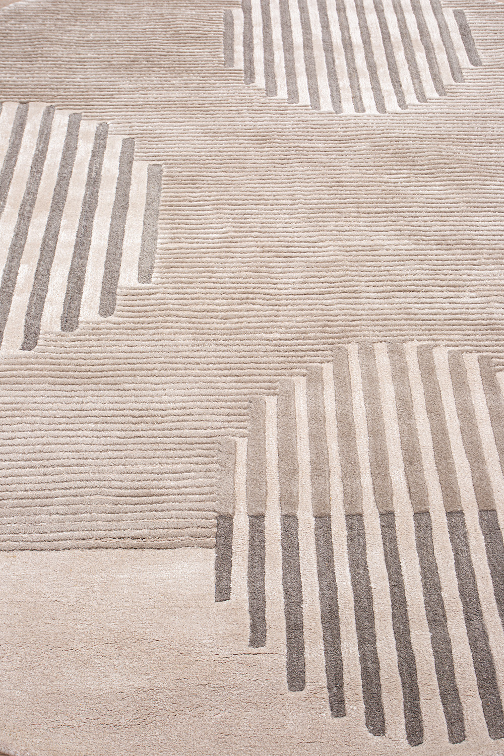 Крупные рисунки в виде линий и фигур на фактурной поверхности ковра превращаются в выразительные композиции. Они акцентируют на себе внимание и добавляют динамики в современный интерьер. Комбинации разных фигур и повторяющийся орнамент задают ритмическую основу пространству, привносят в него оригинальные оптические иллюзии.