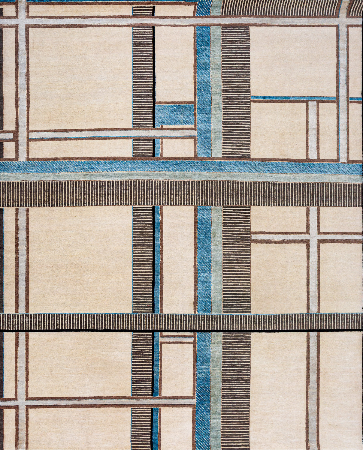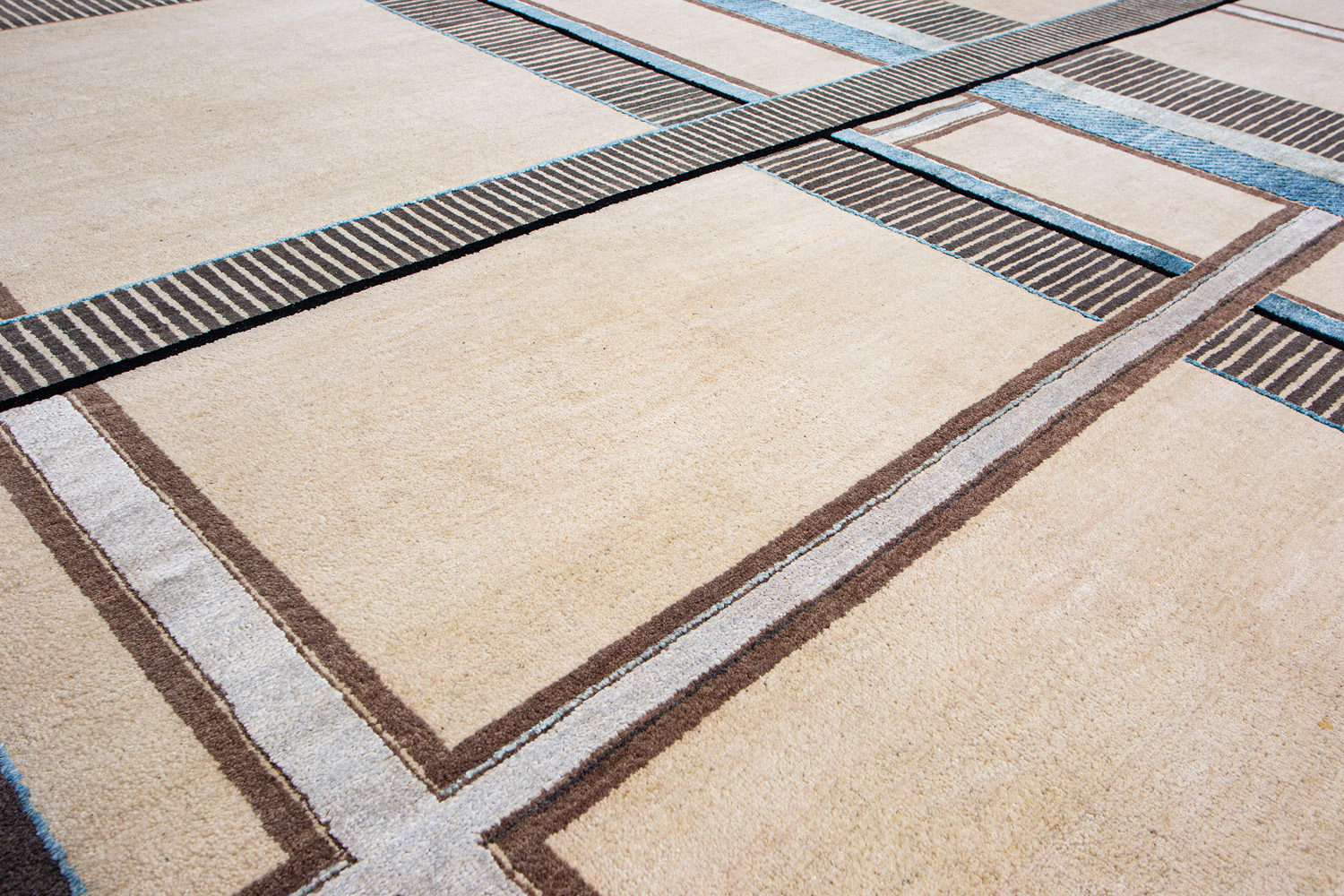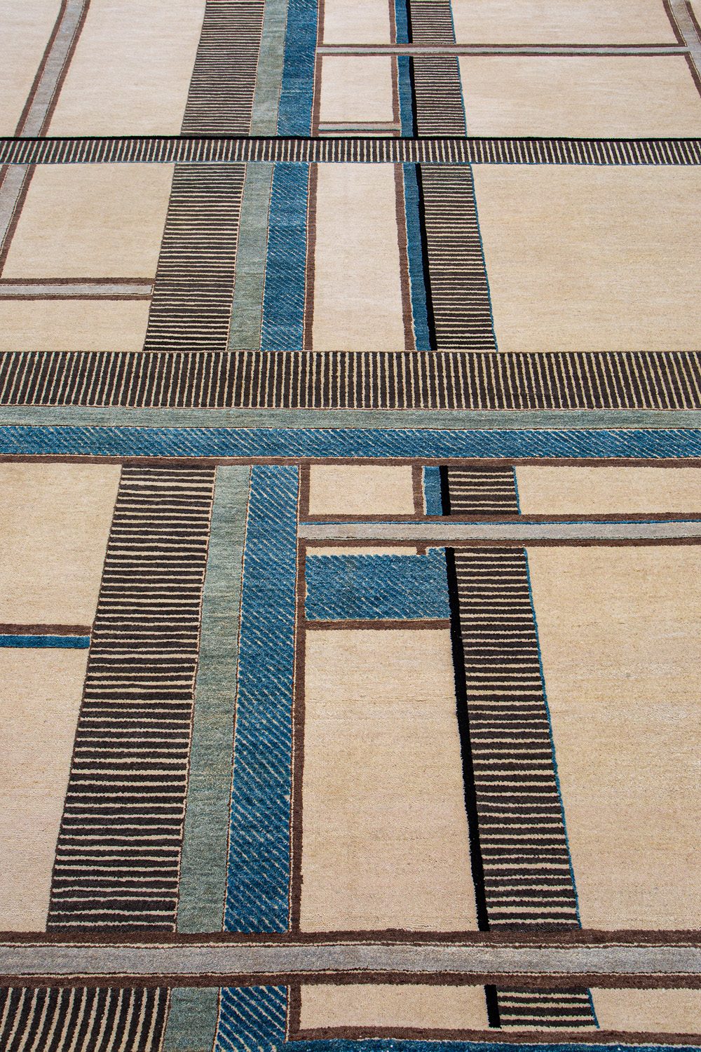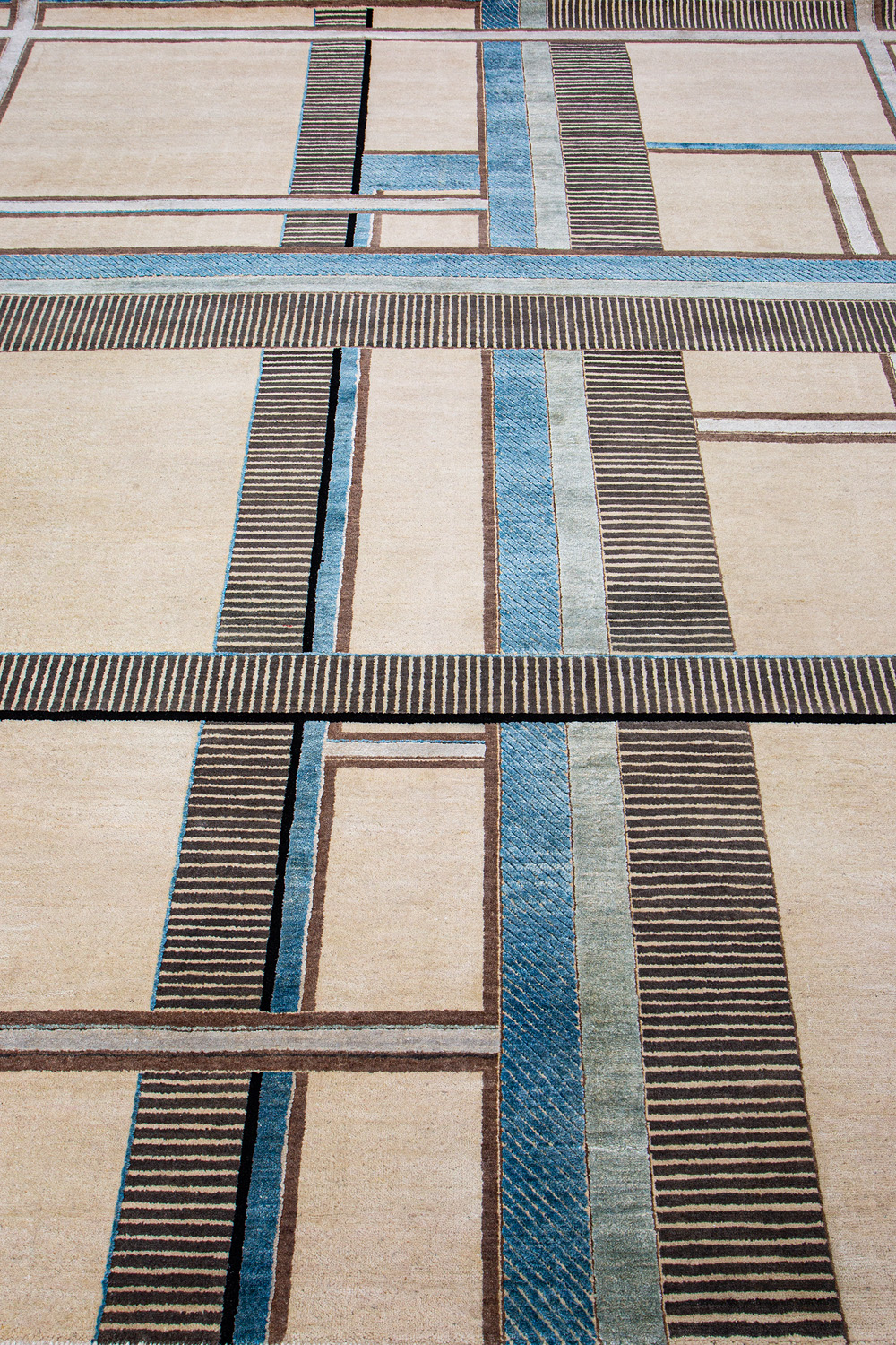 Крупные рисунки в виде линий и фигур на фактурной поверхности ковра превращаются в выразительные композиции. Они акцентируют на себе внимание и добавляют динамики в современный интерьер. Комбинации разных фигур и повторяющийся орнамент задают ритмическую основу пространству, привносят в него оригинальные оптические иллюзии.