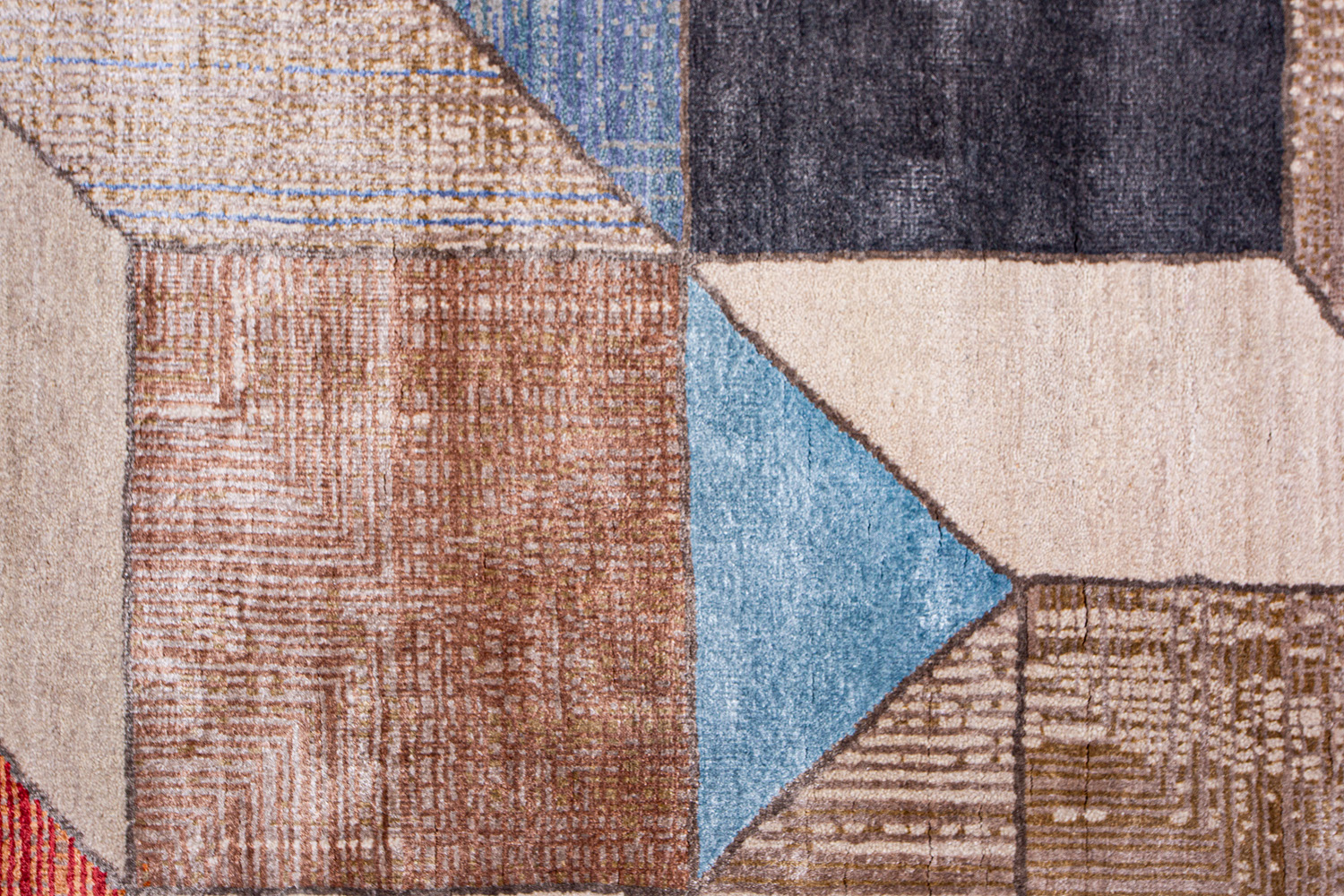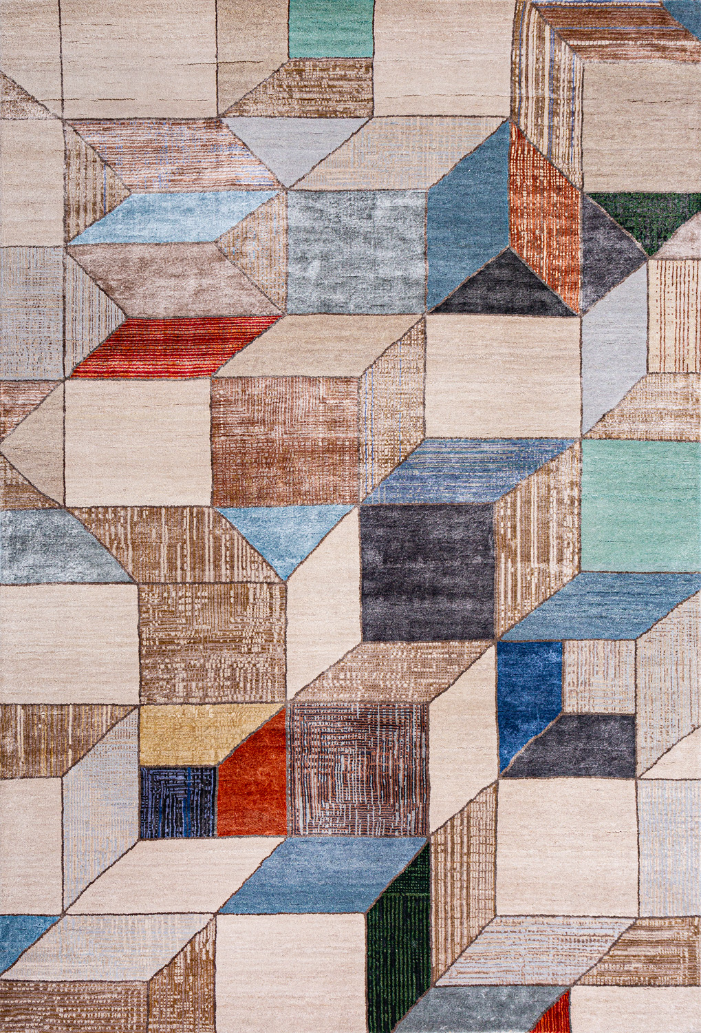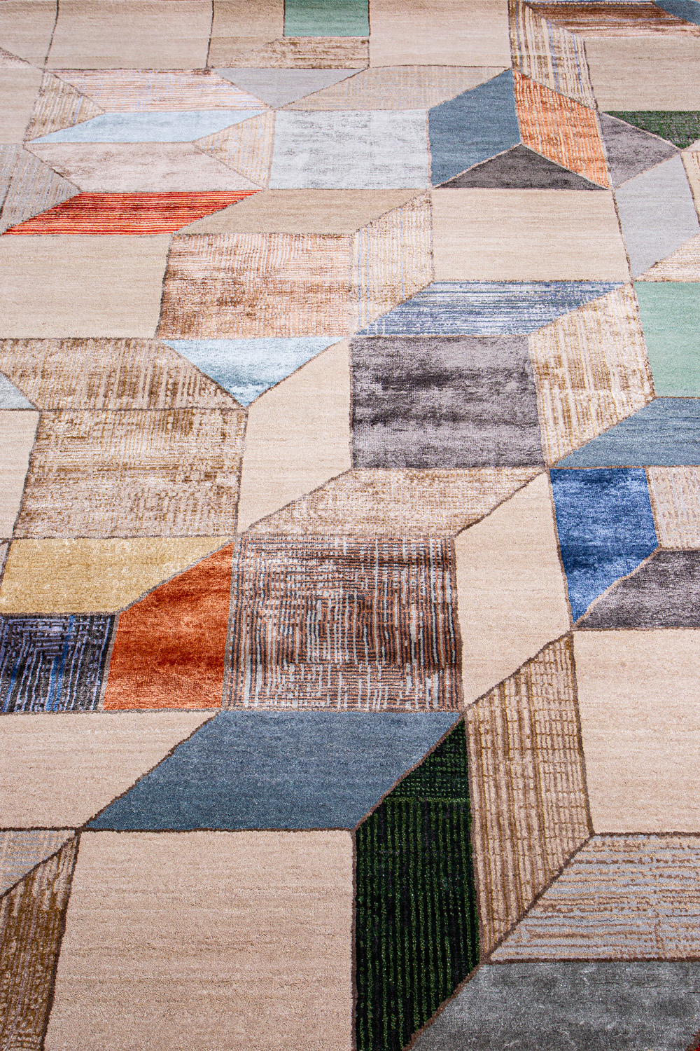 Крупные рисунки в виде линий и фигур на фактурной поверхности ковра превращаются в выразительные композиции. Они акцентируют на себе внимание и добавляют динамики в современный интерьер. Комбинации разных фигур и повторяющийся орнамент задают ритмическую основу пространству, привносят в него оригинальные оптические иллюзии.