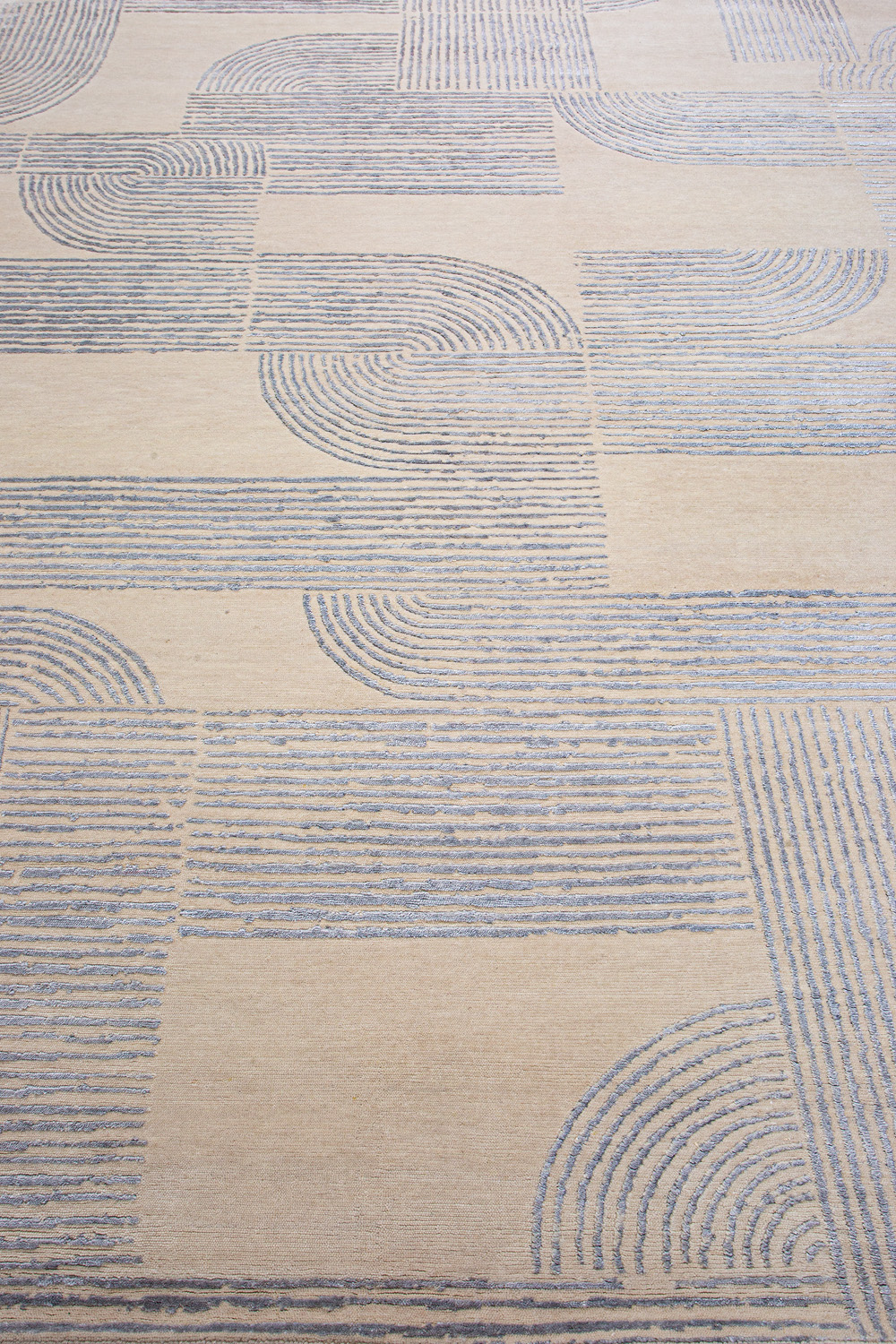 Крупные рисунки в виде линий и фигур на фактурной поверхности ковра превращаются в выразительные композиции. Они акцентируют на себе внимание и добавляют динамики в современный интерьер. Комбинации разных фигур и повторяющийся орнамент задают ритмическую основу пространству, привносят в него оригинальные оптические иллюзии.