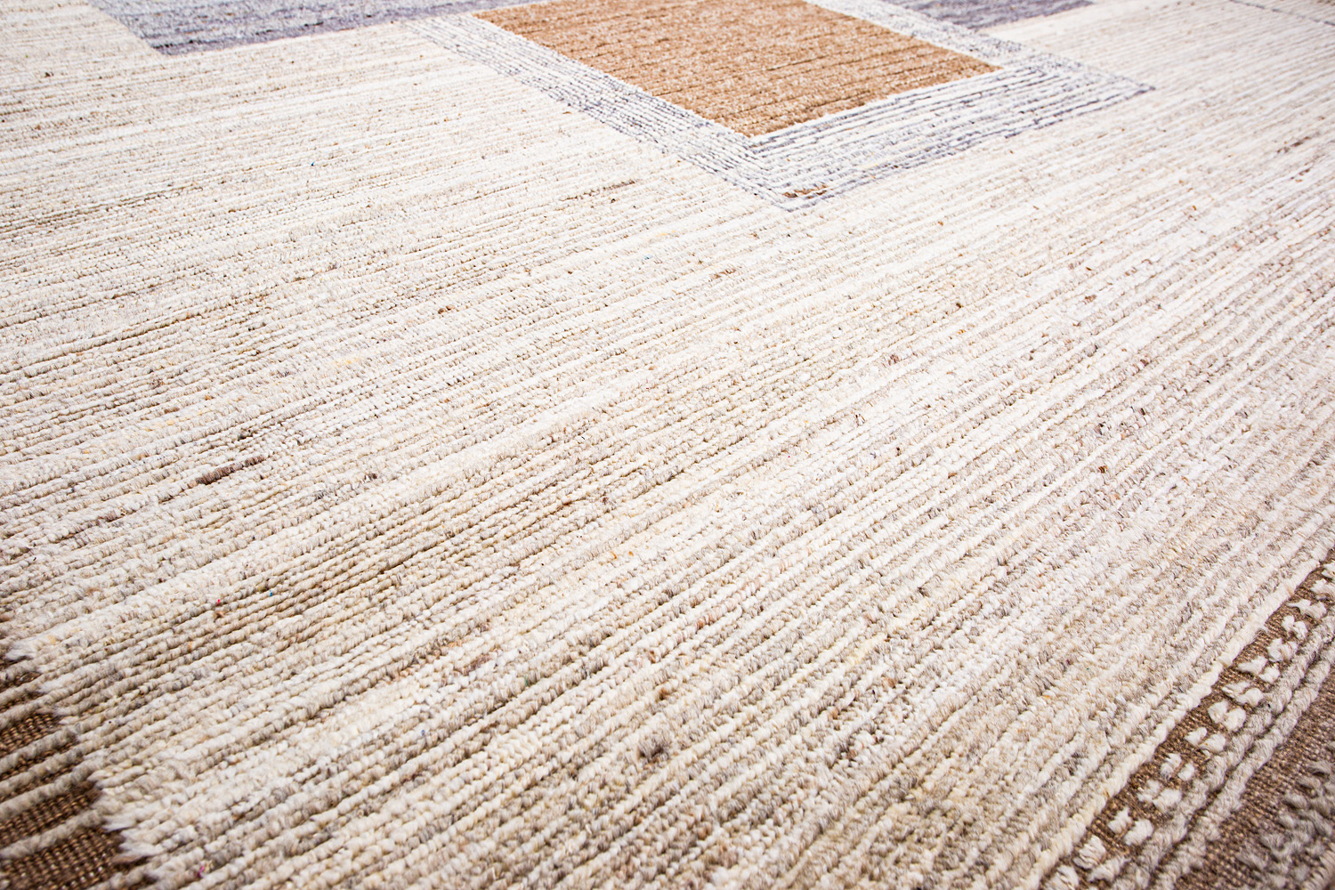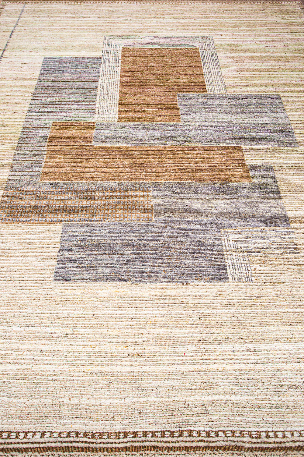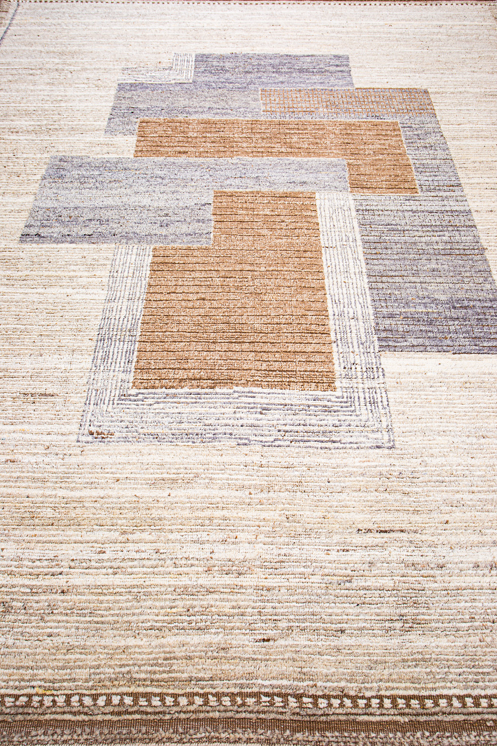 Крупные рисунки в виде линий и фигур на фактурной поверхности ковра превращаются в выразительные композиции. Они акцентируют на себе внимание и добавляют динамики в современный интерьер. Комбинации разных фигур и повторяющийся орнамент задают ритмическую основу пространству, привносят в него оригинальные оптические иллюзии.