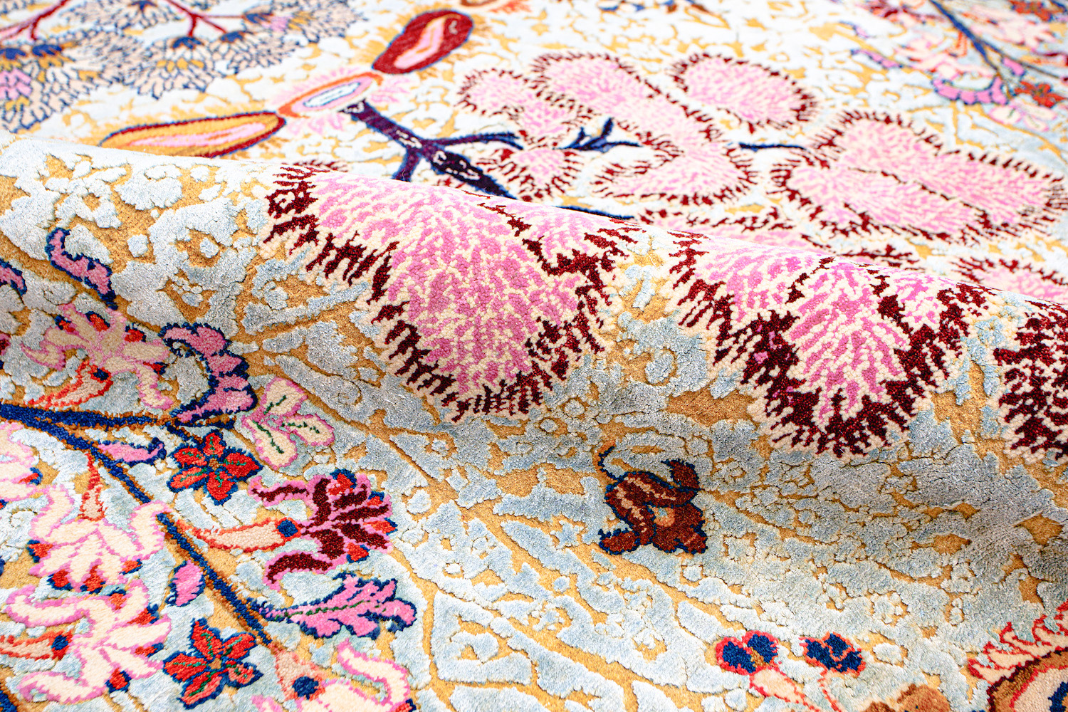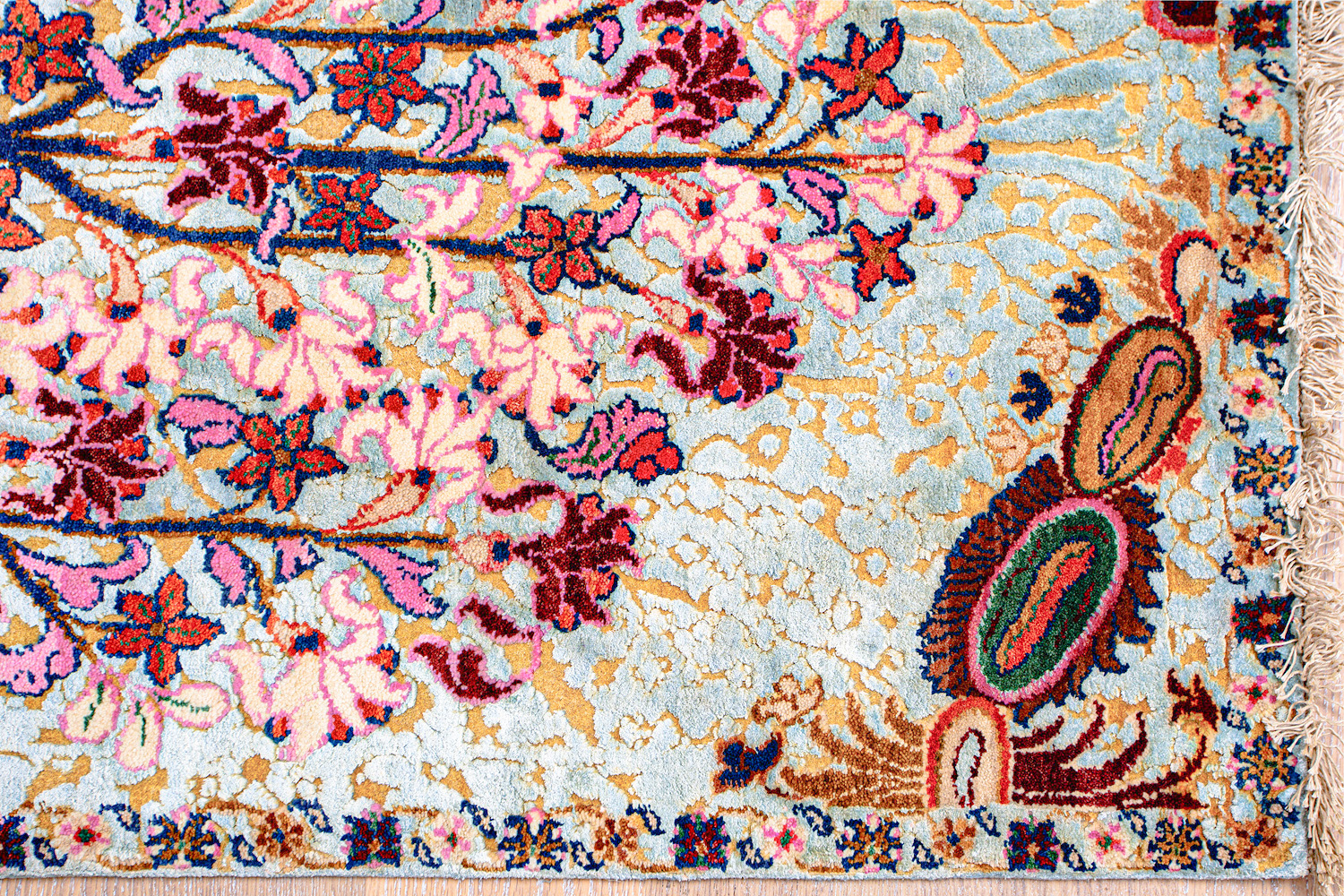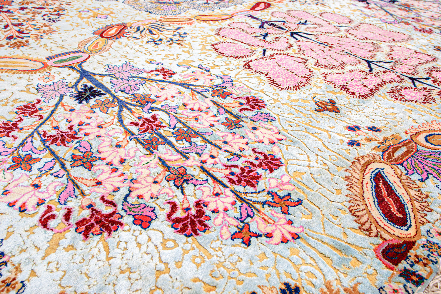 Родина этих ковров Индия и Пакистан. Чтобы создать такое произведение искусства у мастеров уходит от одного года до двух лет. Плотность ковров, в зависимости от размера, составляет от 150 000 до 400 000 узлов на квадратный метр.