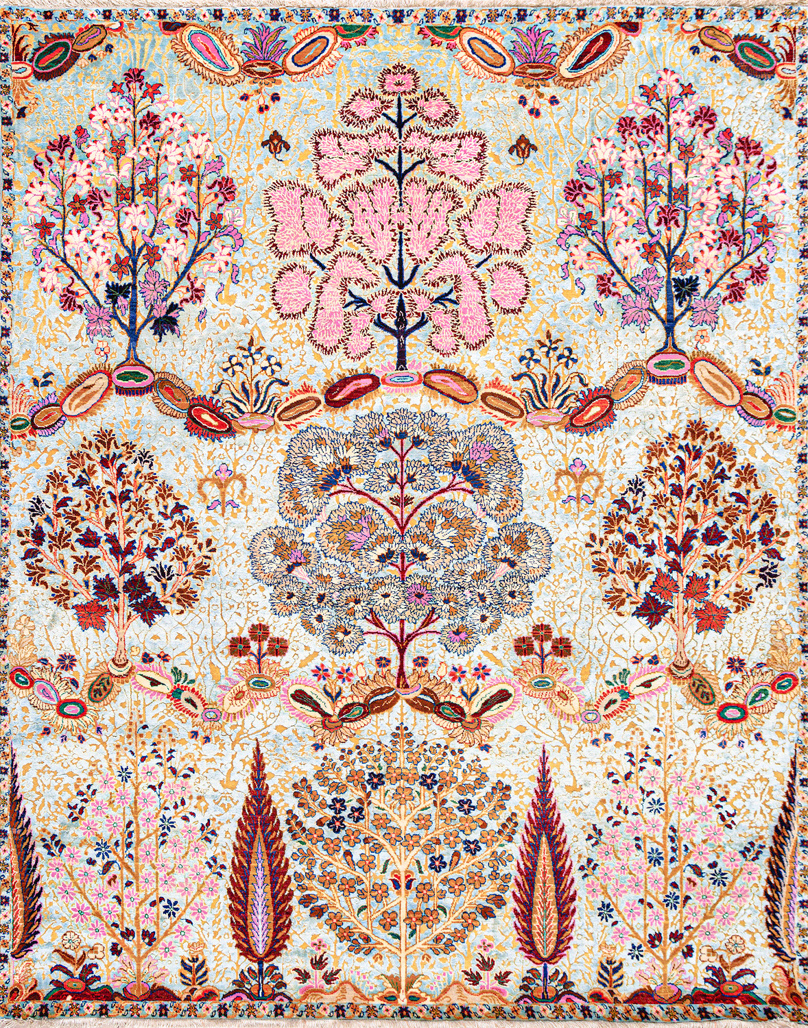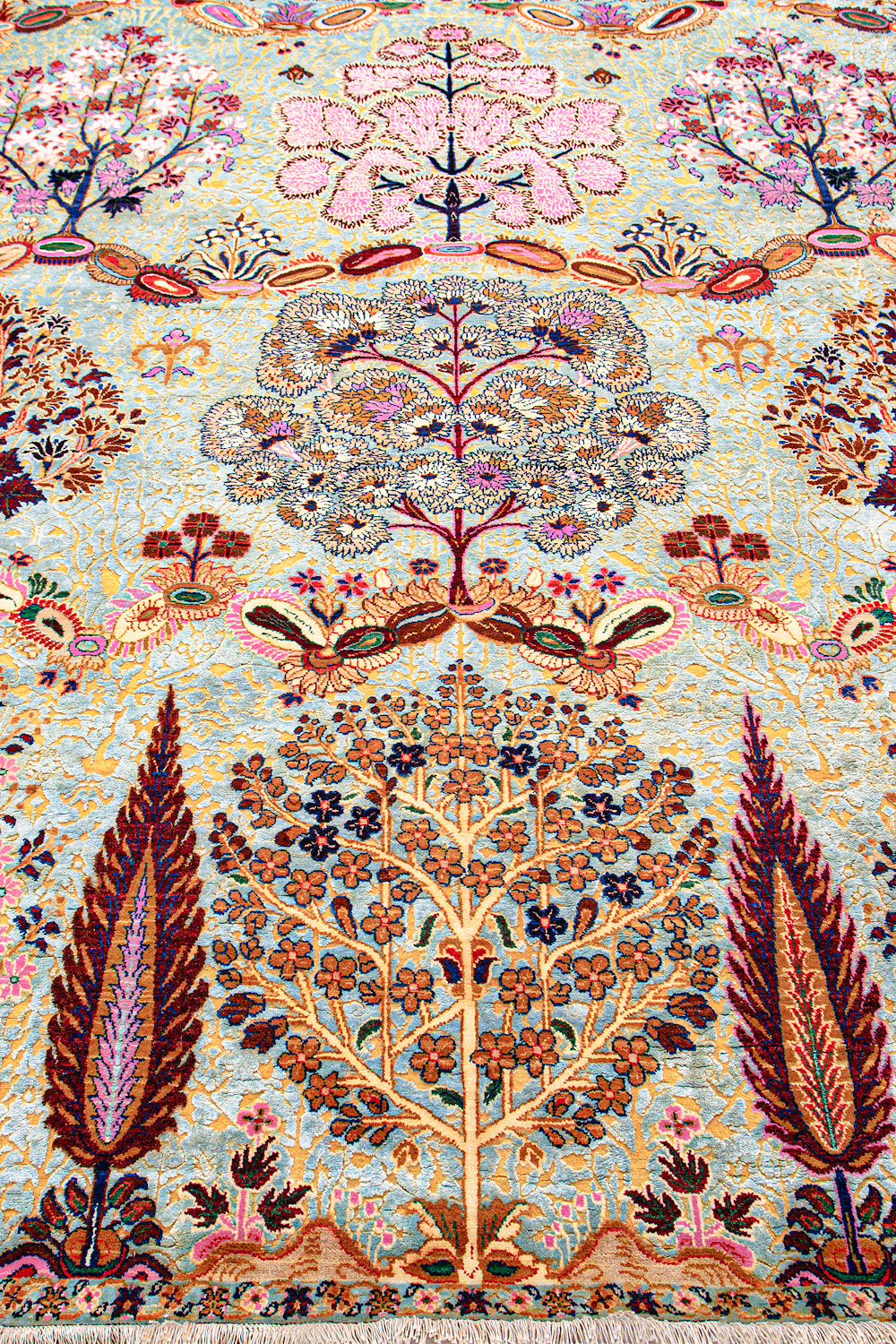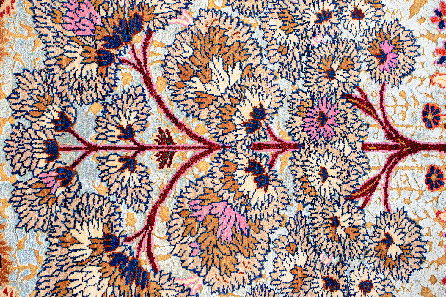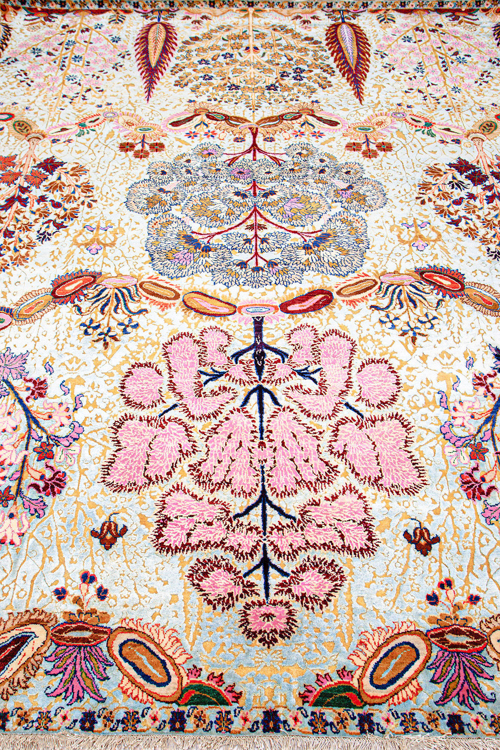 Родина этих ковров Индия и Пакистан. Чтобы создать такое произведение искусства у мастеров уходит от одного года до двух лет. Плотность ковров, в зависимости от размера, составляет от 150 000 до 400 000 узлов на квадратный метр.