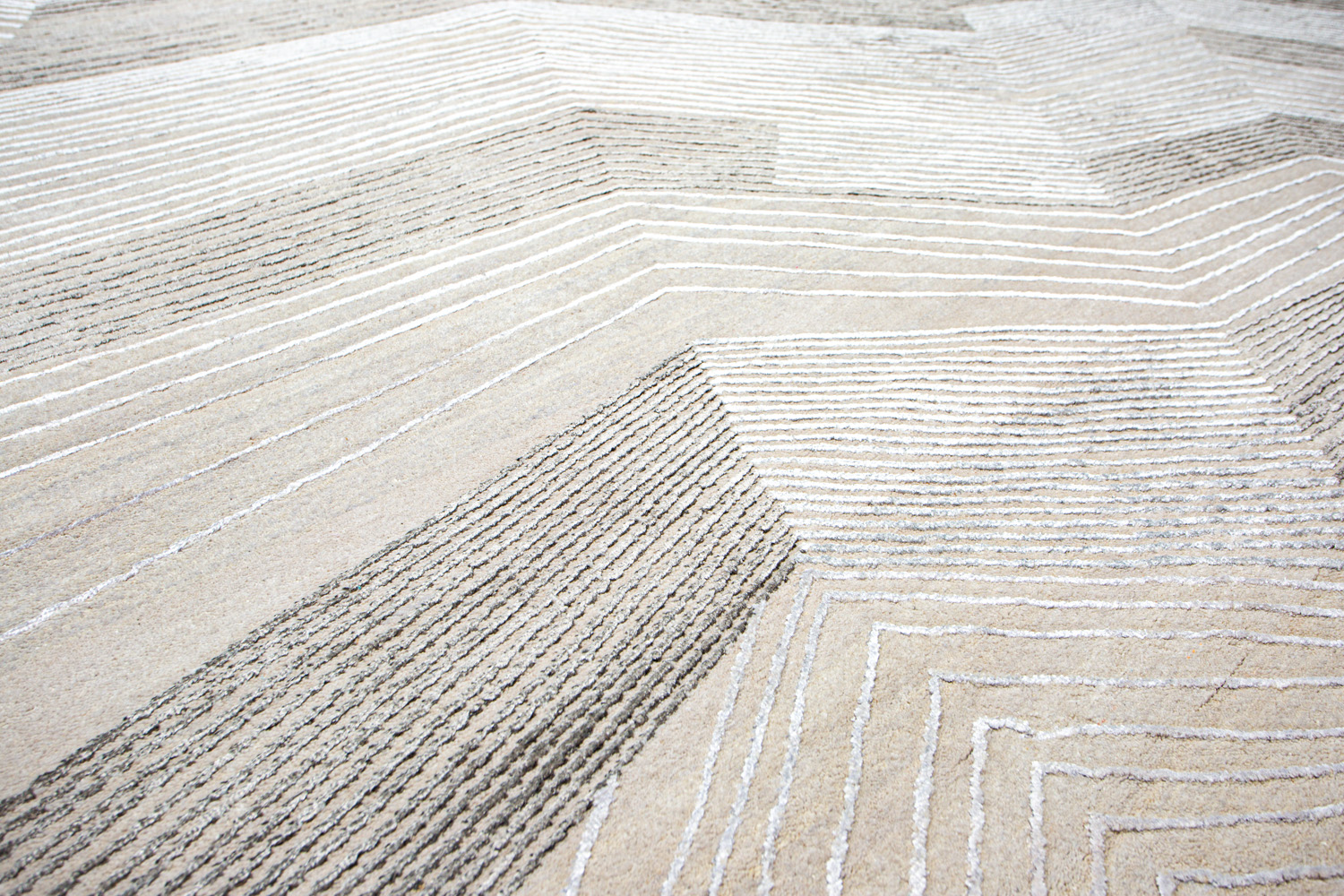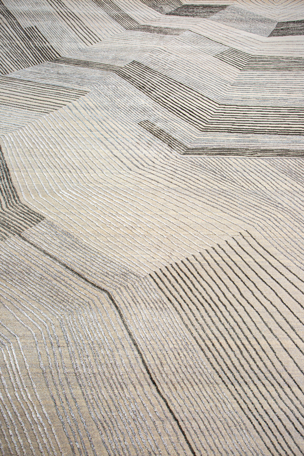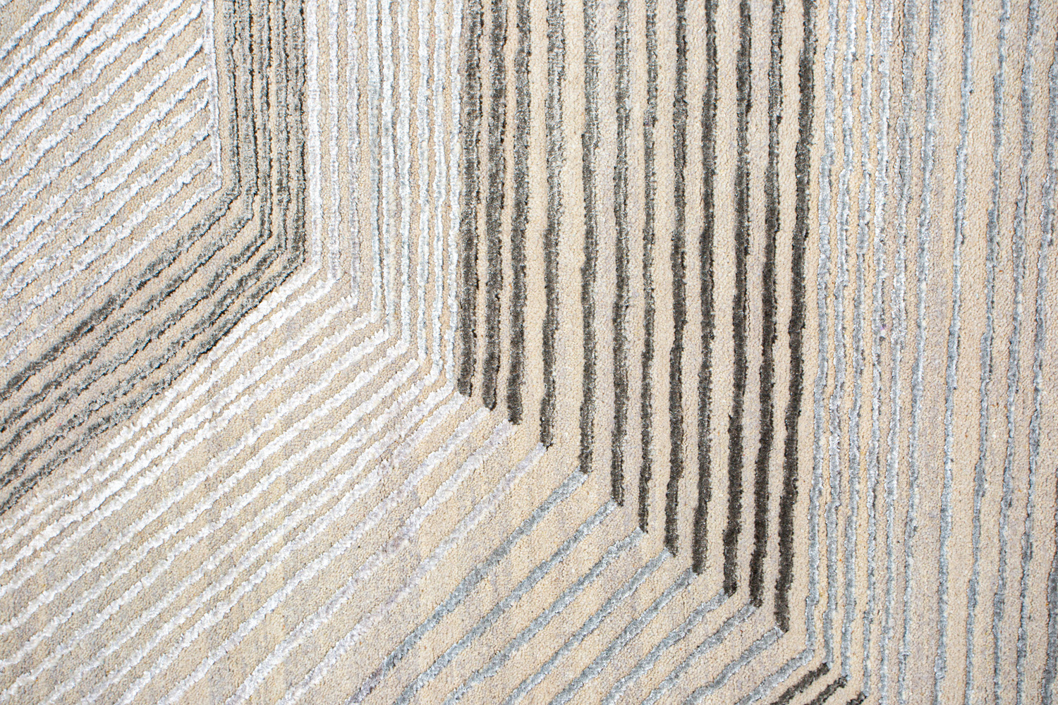Крупные рисунки в виде линий и фигур на фактурной поверхности ковра превращаются в выразительные композиции. Они акцентируют на себе внимание и добавляют динамики в современный интерьер. Комбинации разных фигур и повторяющийся орнамент задают ритмическую основу пространству, привносят в него оригинальные оптические иллюзии.