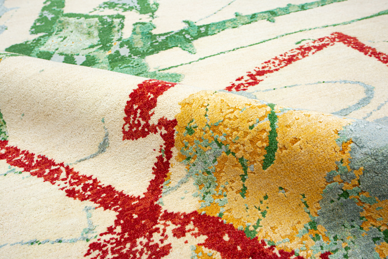 Дизайн ковров напоминает современные полотна художников-абстракционистов и производит столь же яркое и незабываемое впечатление в интерьере. Живописный эффект и необычная фактура зависят от выбора материала: натуральной шерсти, шёлка и от их сочетаний друг с другом. Ковры ткутся вручную в лучших мастерских Индии и Пакистана.