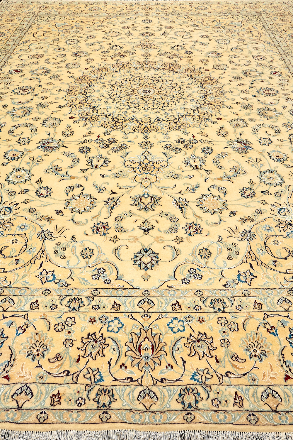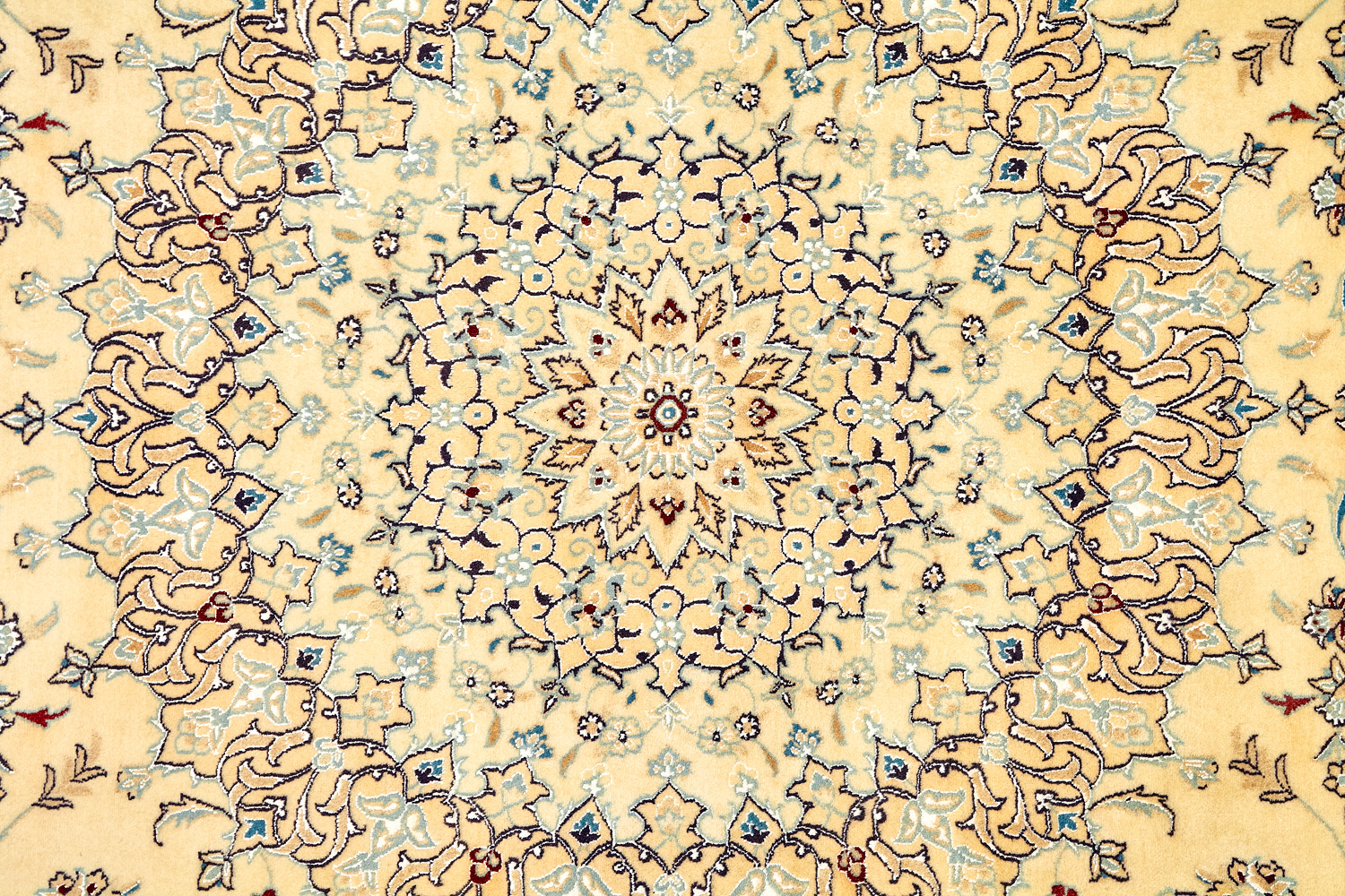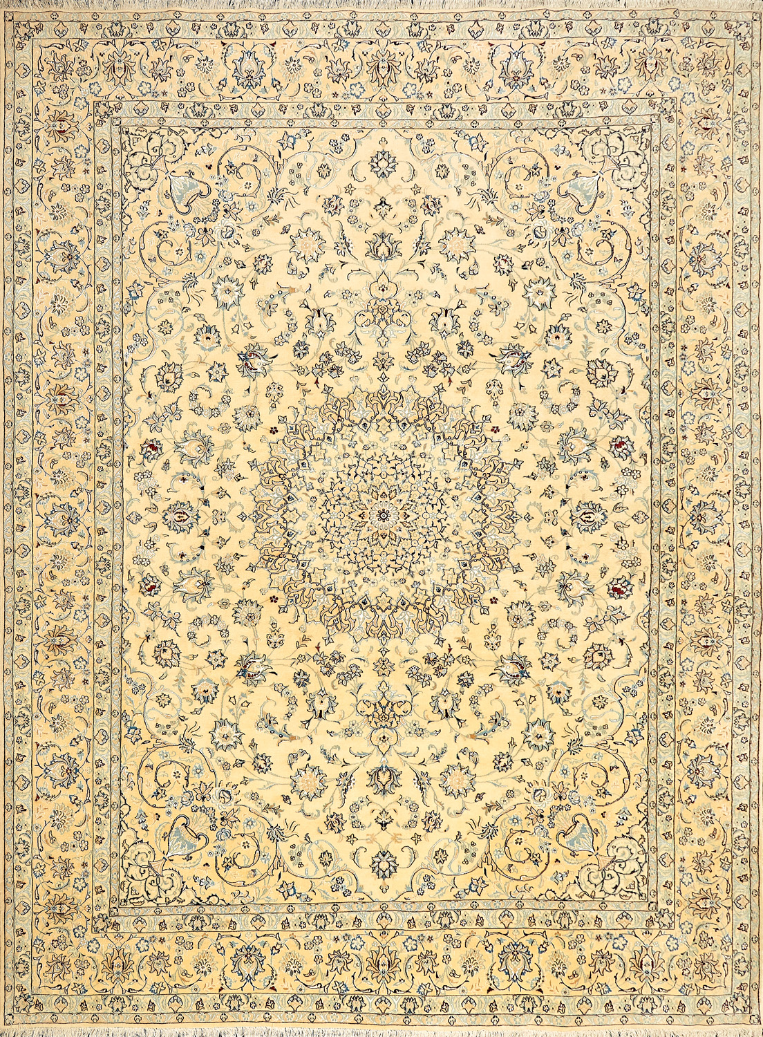 Иранский город Наин знаменит своими аристократичными коврами, которые совмещают в себе классические орнаменты с элегантной цветовой гаммой, выдержанной в бежево-голубых тонах с многочисленными нюансами.