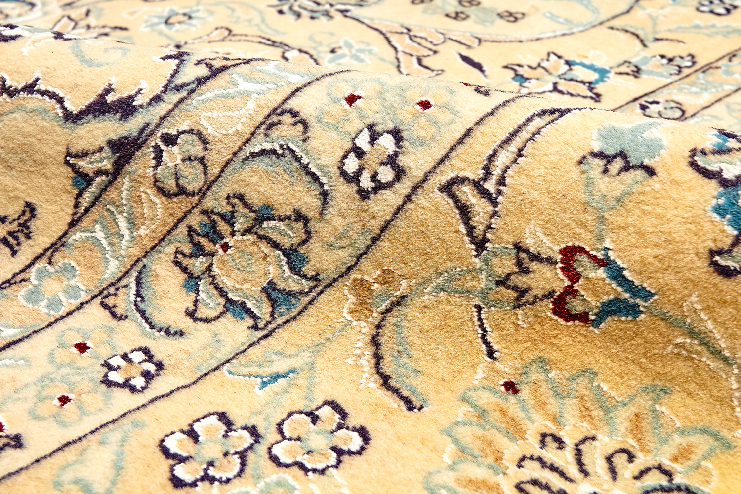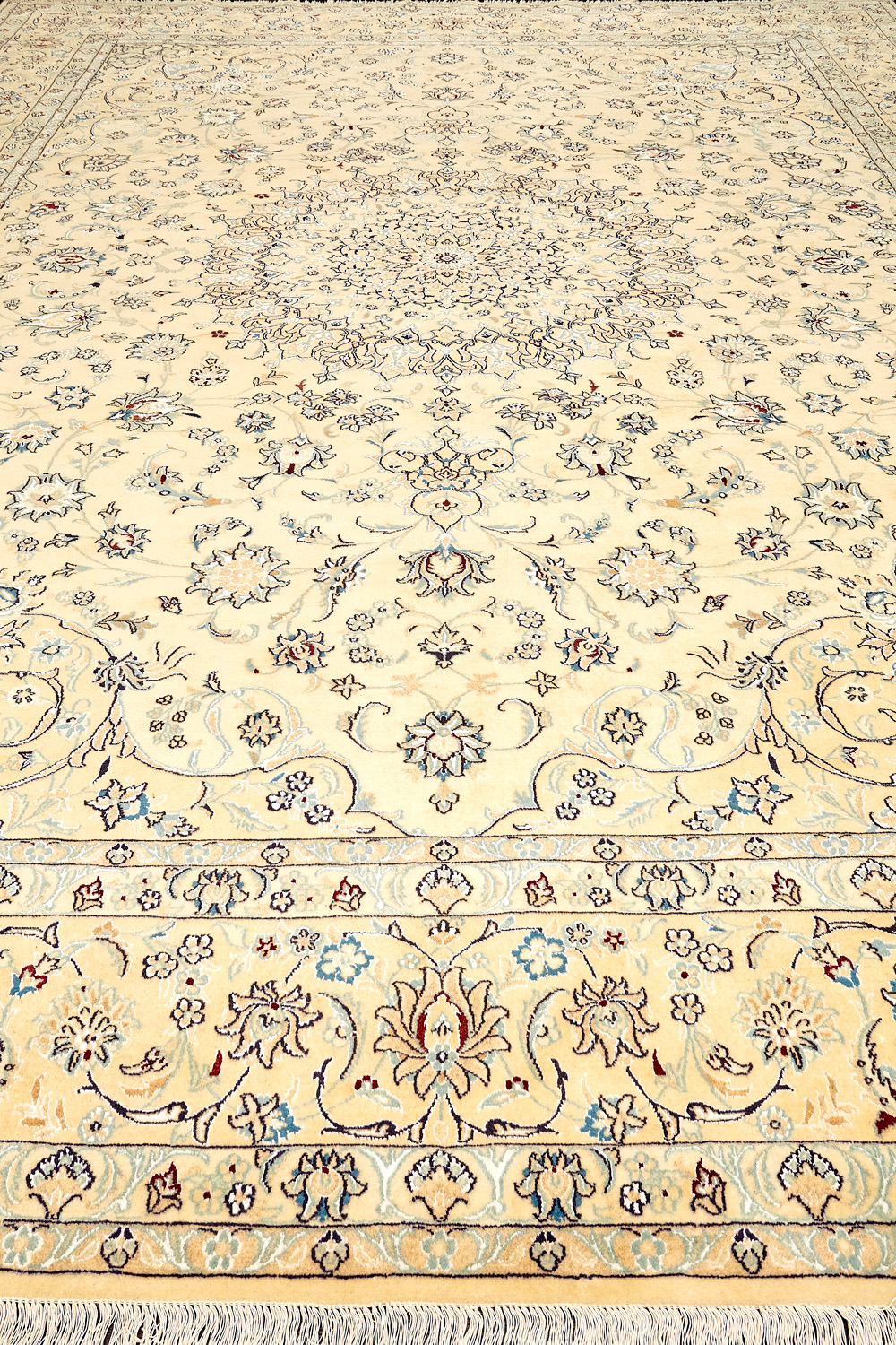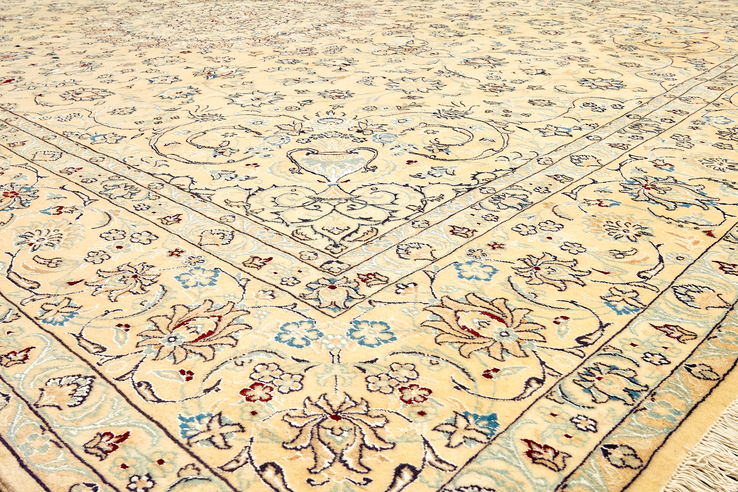 Иранский город Наин знаменит своими аристократичными коврами, которые совмещают в себе классические орнаменты с элегантной цветовой гаммой, выдержанной в бежево-голубых тонах с многочисленными нюансами.