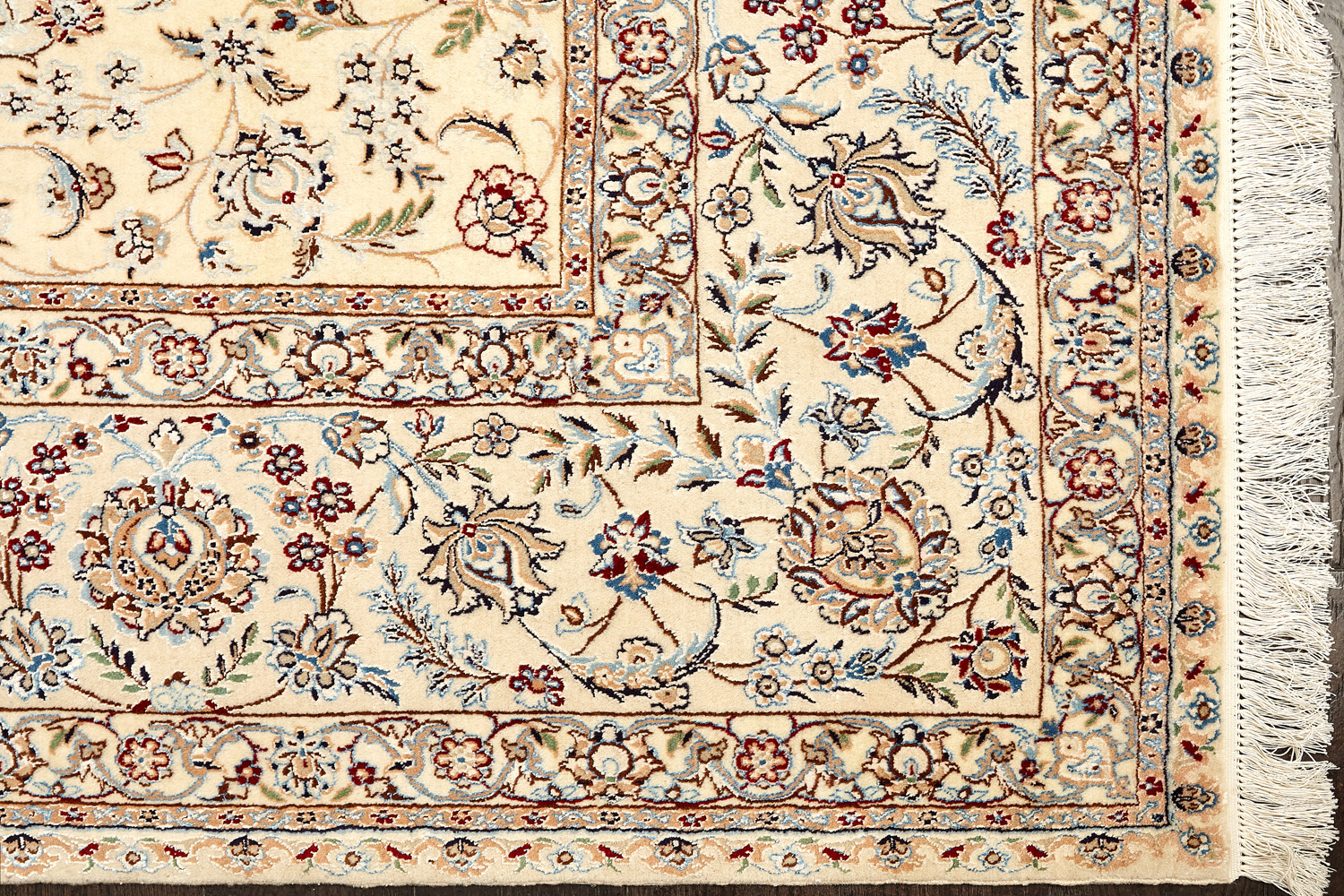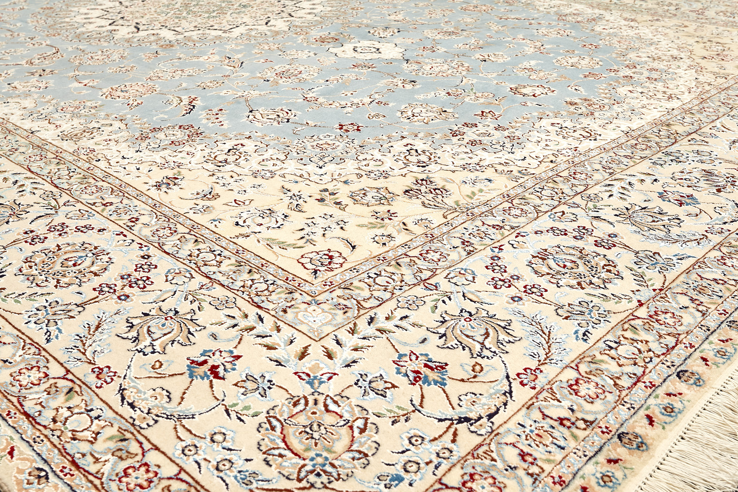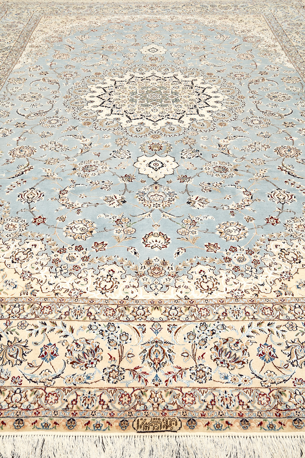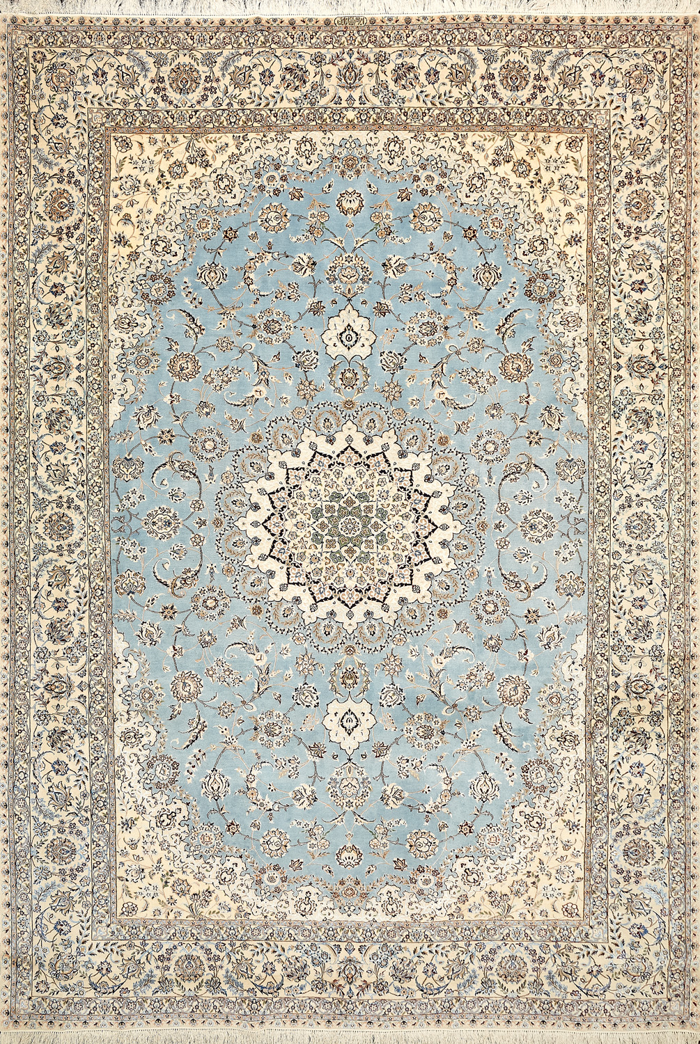 Иранский город Наин знаменит своими аристократичными коврами, которые совмещают в себе классические орнаменты с элегантной цветовой гаммой, выдержанной в бежево-голубых тонах с многочисленными нюансами.