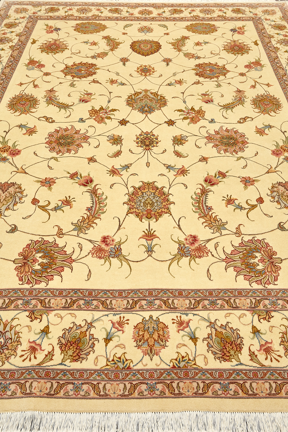 Рассыпанные по всему полю цветы, медальоны и «рыбная чешуя» — основные мотивы в дизайне ковров из коллекции Тебриз, а светлые тона и спокойные пастельные оттенки — основная цветовая палитра.