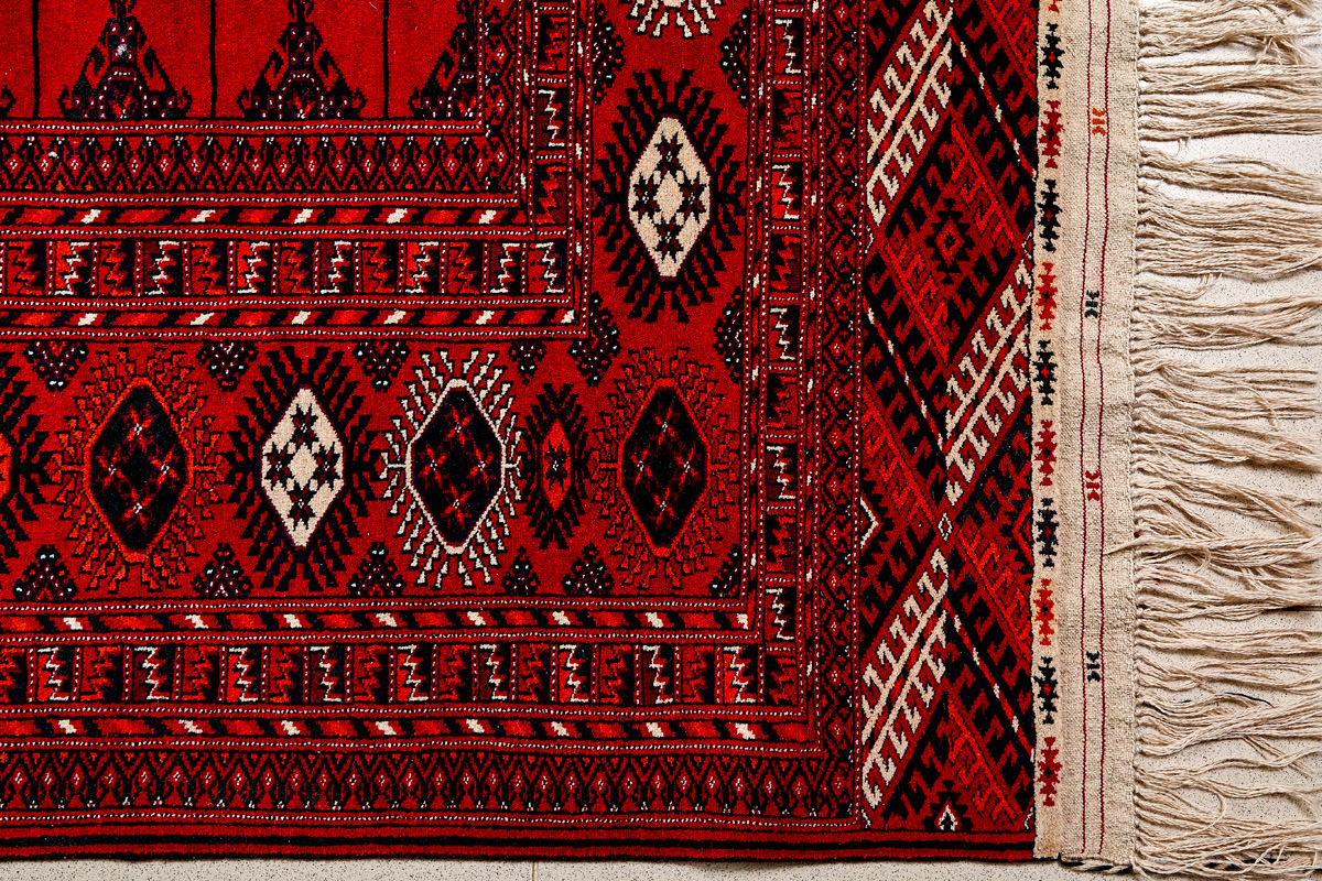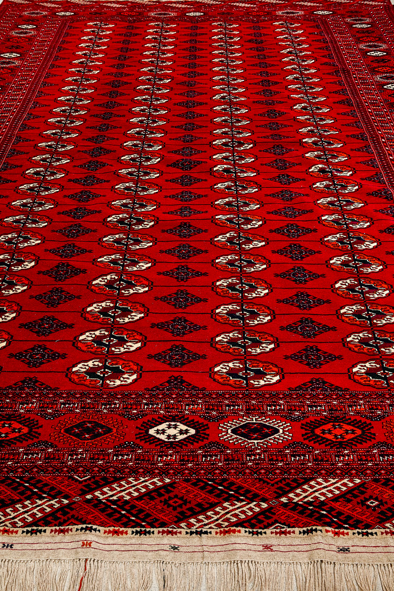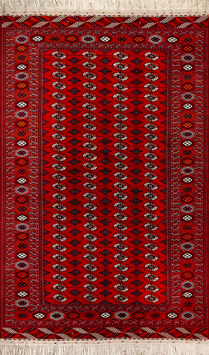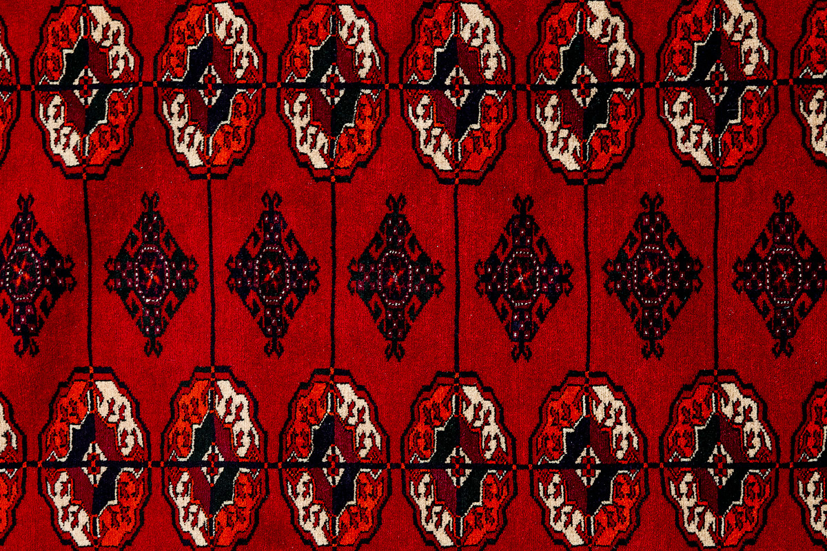 Классические туркменские ковры имеют тёмно-красный (иногда коричневый и синий) цвет фона и орнамент, который словно обведен чёрной линией, отделяющий один узор от другого.