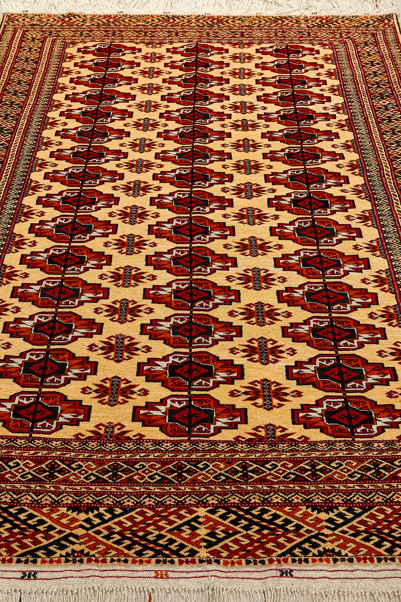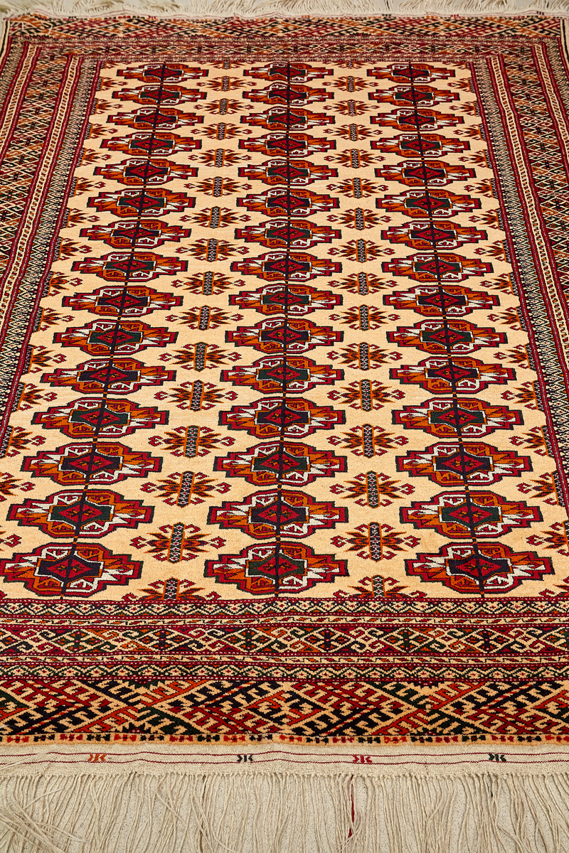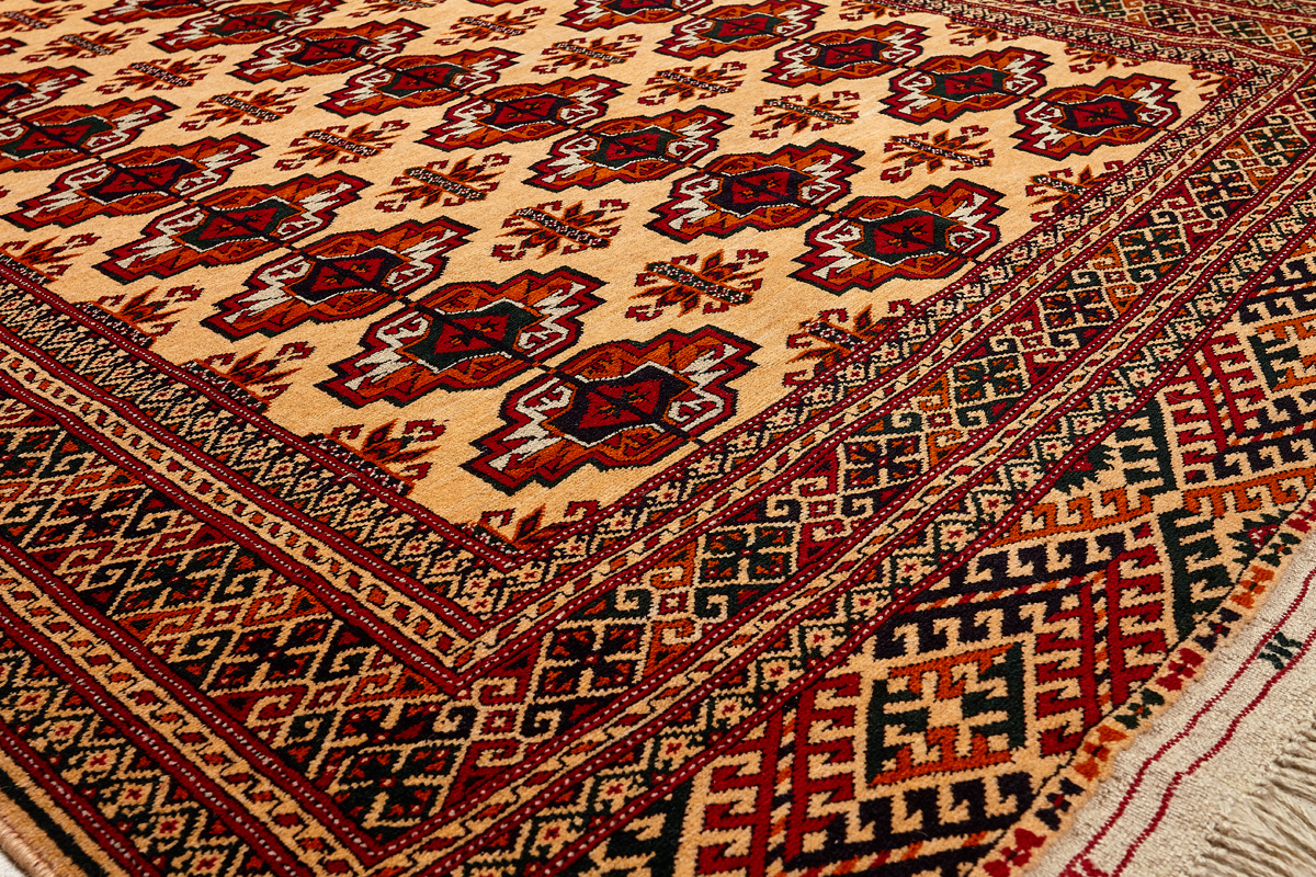 Классические туркменские ковры имеют тёмно-красный (иногда коричневый и синий) цвет фона и орнамент, который словно обведен чёрной линией, отделяющий один узор от другого.
