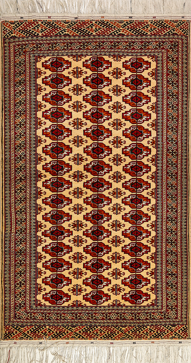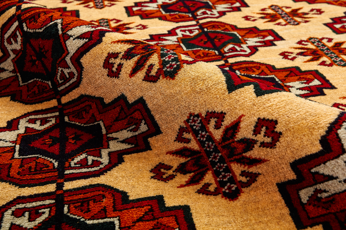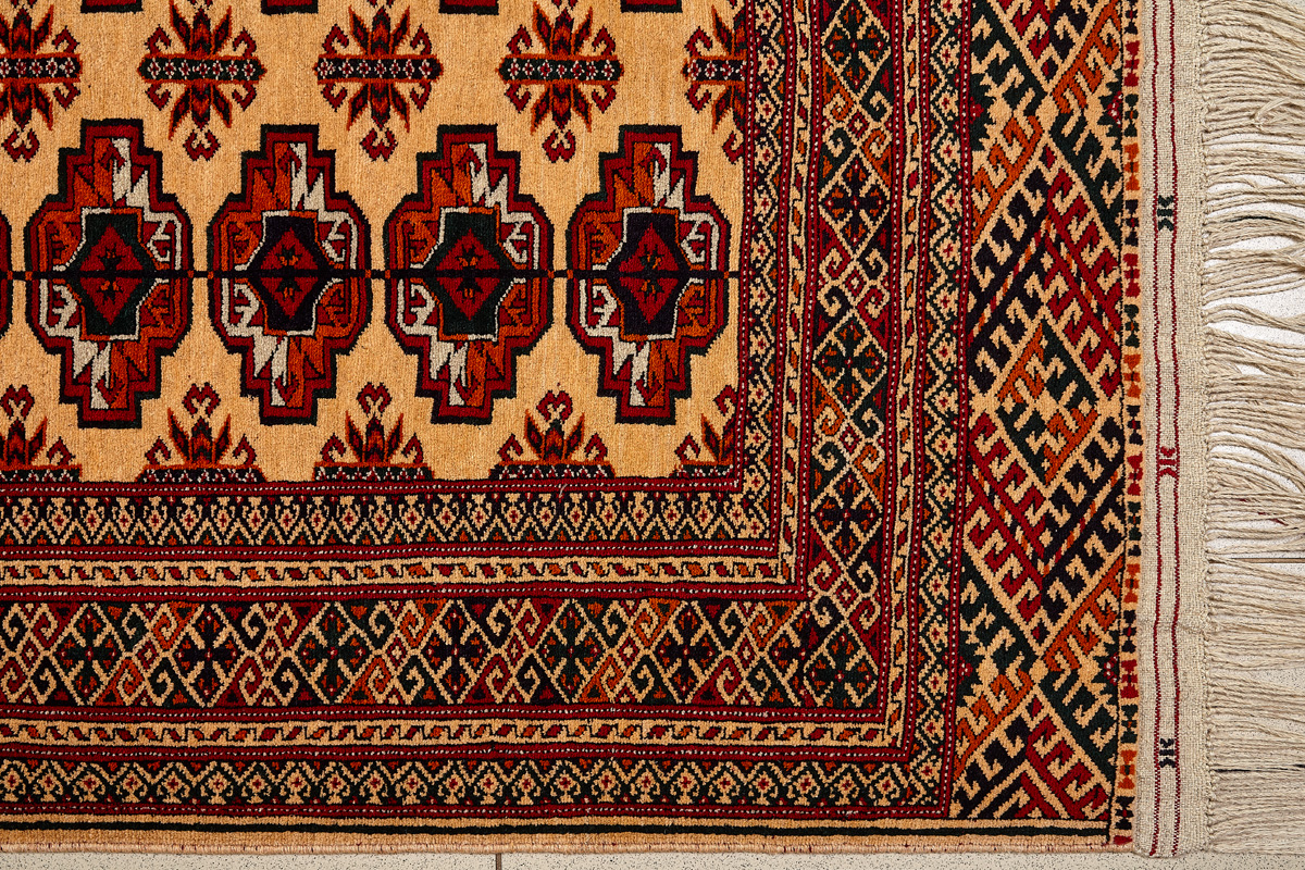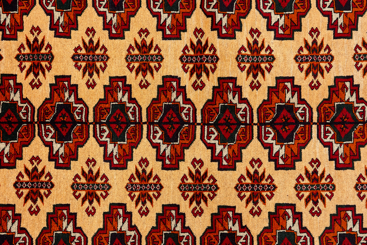 Классические туркменские ковры имеют тёмно-красный (иногда коричневый и синий) цвет фона и орнамент, который словно обведен чёрной линией, отделяющий один узор от другого.