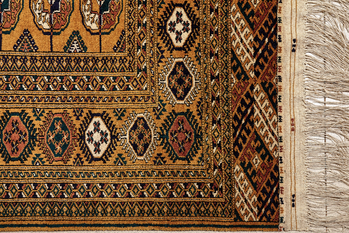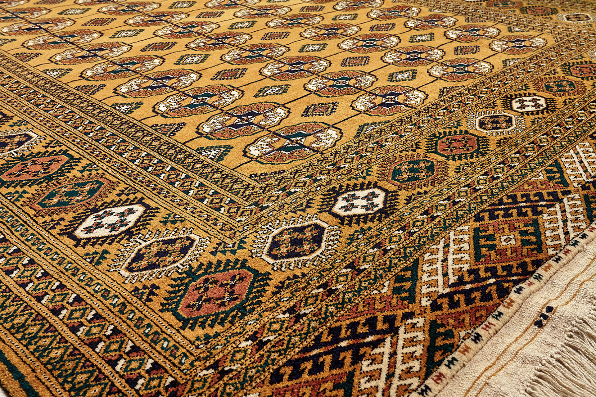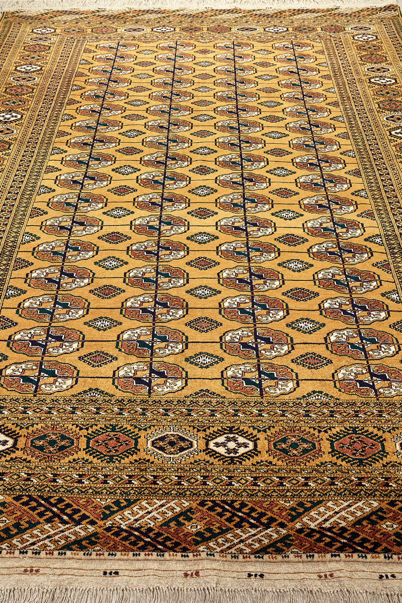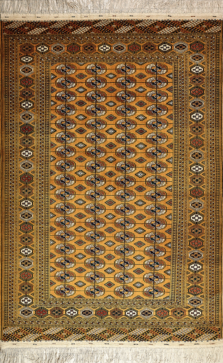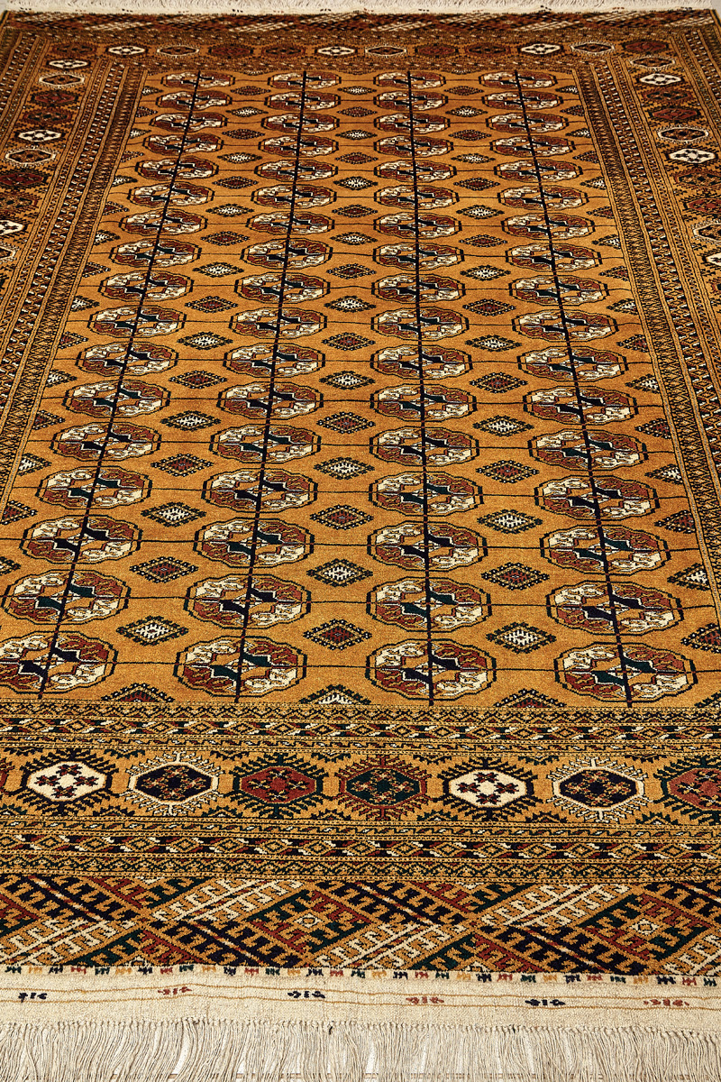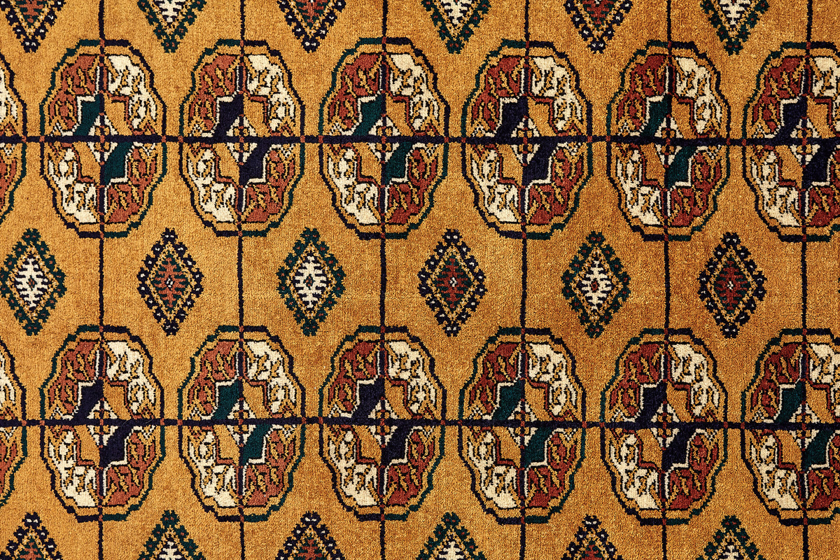 Классические туркменские ковры имеют тёмно-красный (иногда коричневый и синий) цвет фона и орнамент, который словно обведен чёрной линией, отделяющий один узор от другого.
