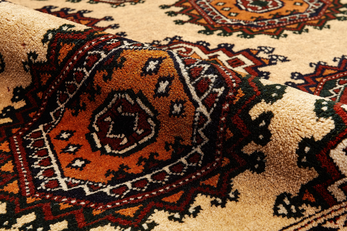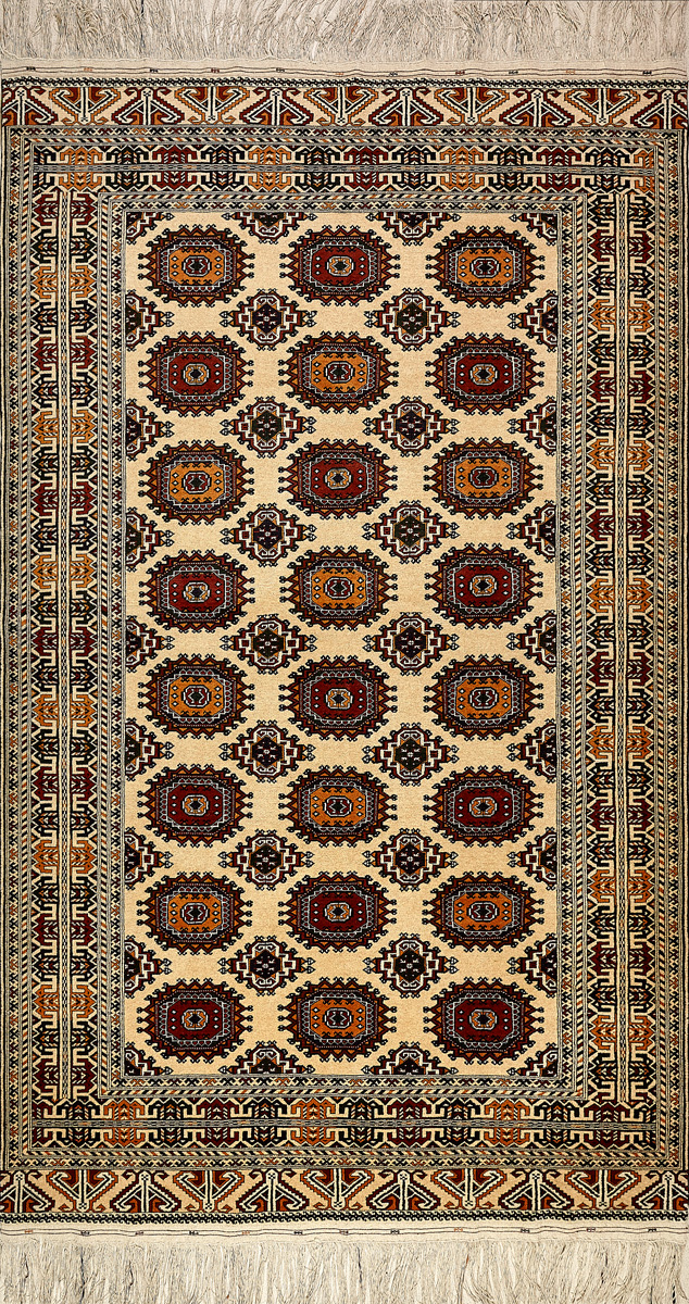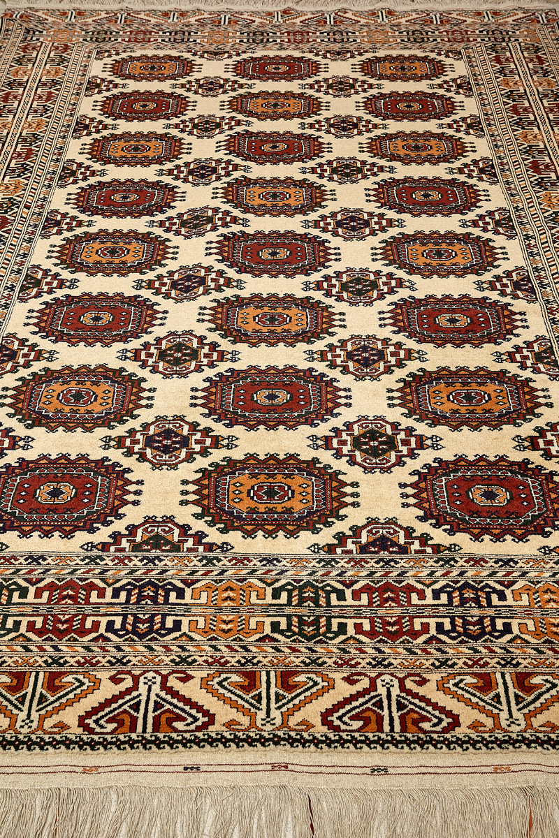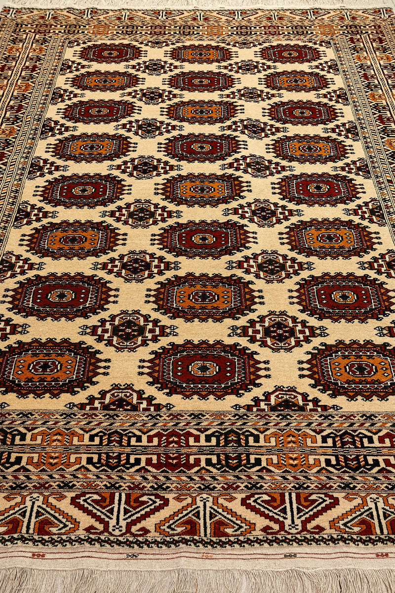 Классические туркменские ковры имеют тёмно-красный (иногда коричневый и синий) цвет фона и орнамент, который словно обведен чёрной линией, отделяющий один узор от другого.
