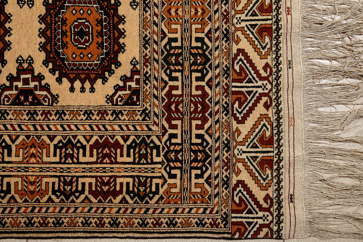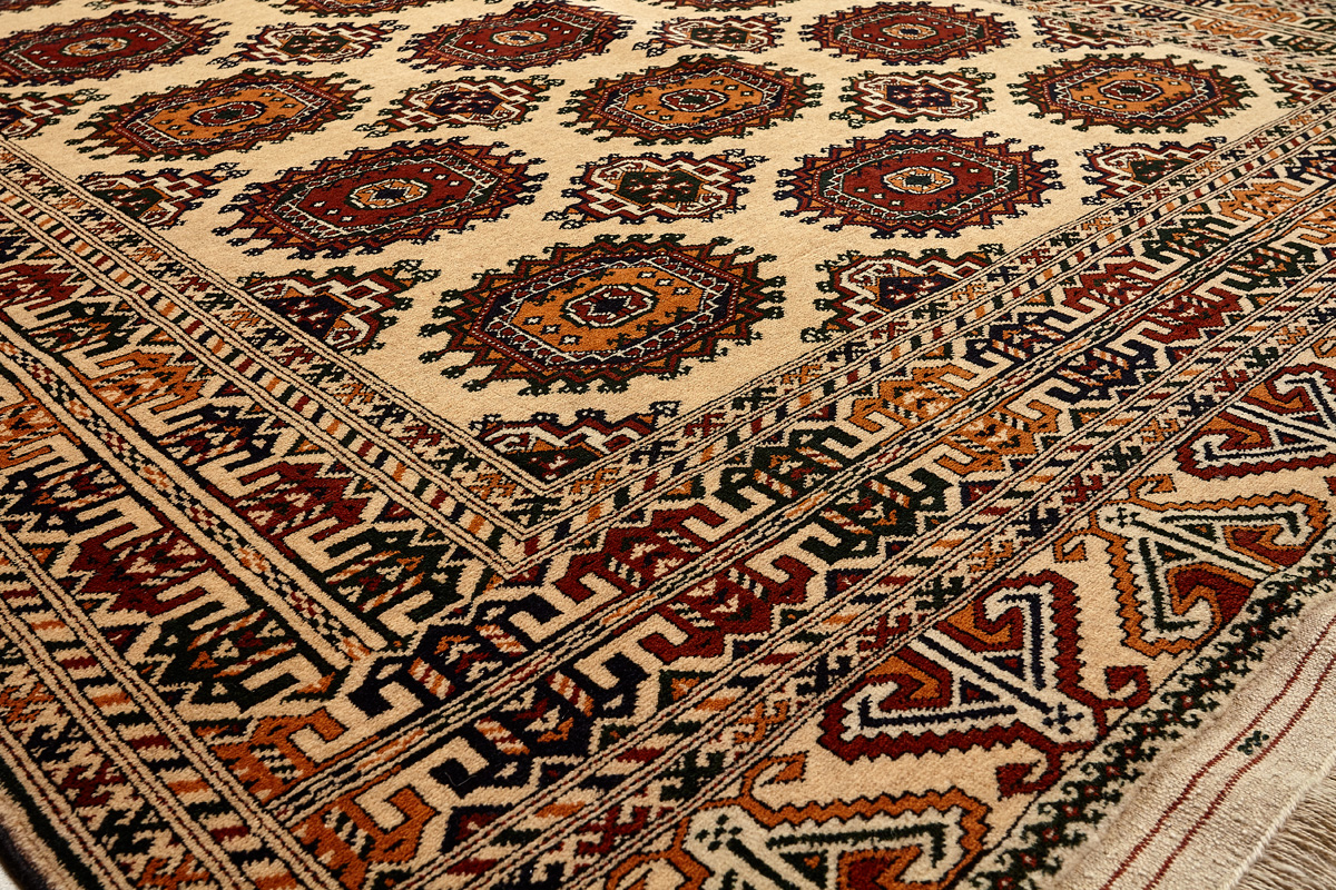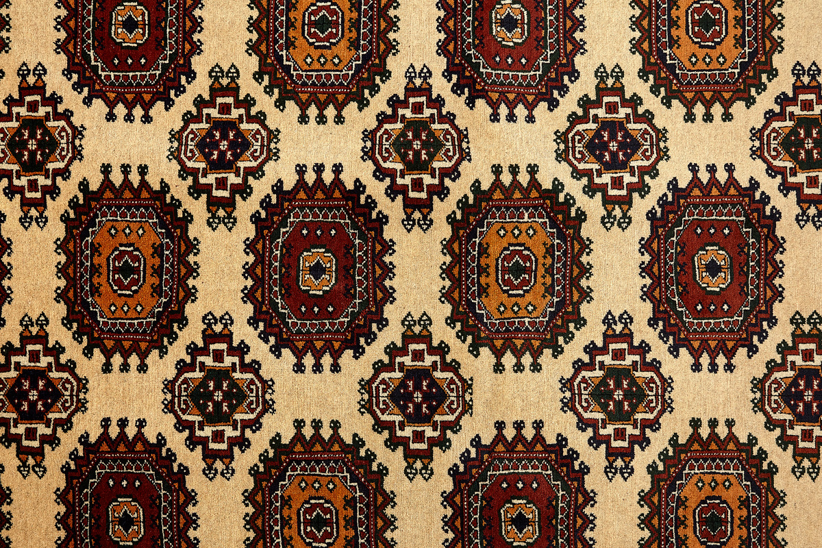 Классические туркменские ковры имеют тёмно-красный (иногда коричневый и синий) цвет фона и орнамент, который словно обведен чёрной линией, отделяющий один узор от другого.